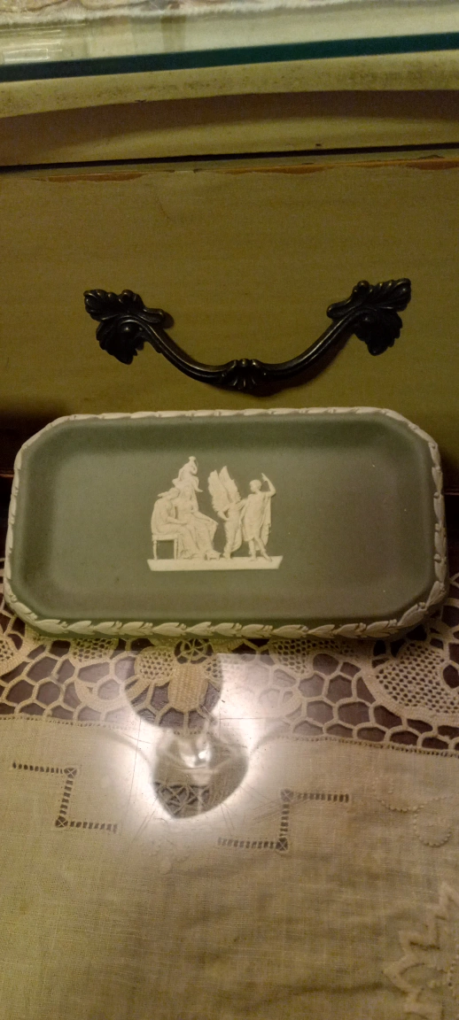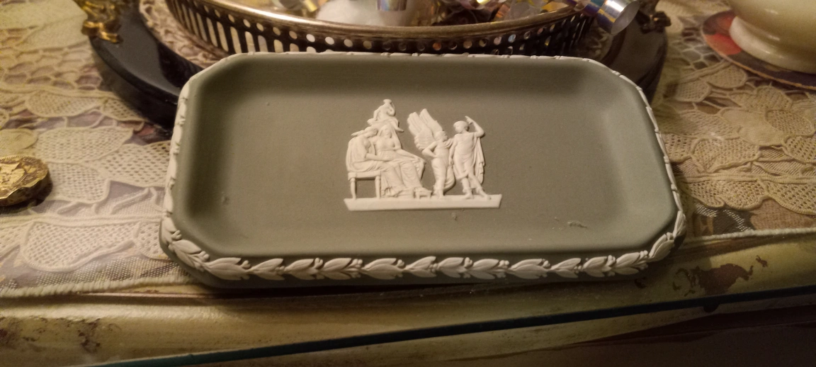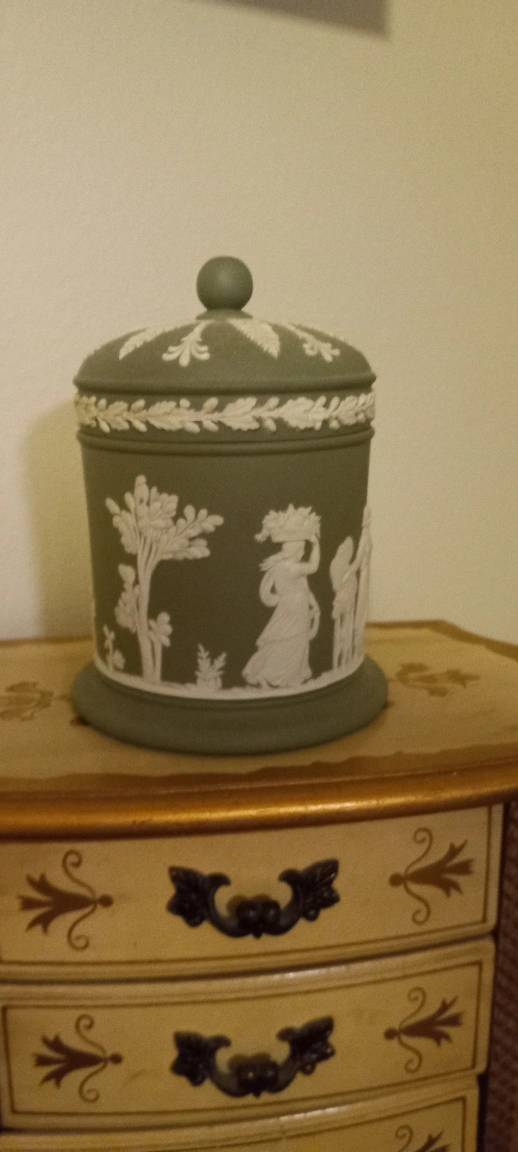Decorative decanter with lid. Detailed white relief on the jar and lid. Perfect for storing small trinkets and treasures, bringing a sense of serenity to your space. Genuine WEDGEWOOD..(3 pieces in all) w Seraphim on a chariot drawn by a steed. romantic scene on the rectangle and family garden scene on the small decanter.