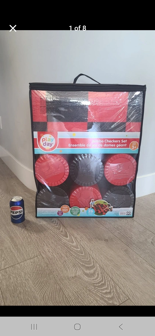 brand new sealed jumbo checkers set. price is firm measurements in photos. can of pepsi to show scale of item for sale. pepsi is probably consumed by now. dont ask if it comes with the set please. pick up near 22nd skytrain new west