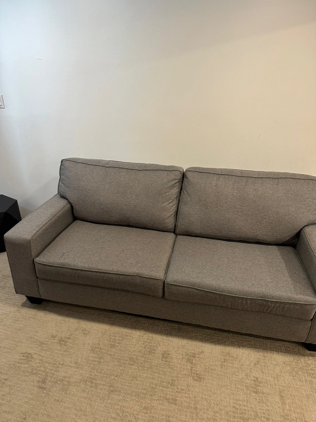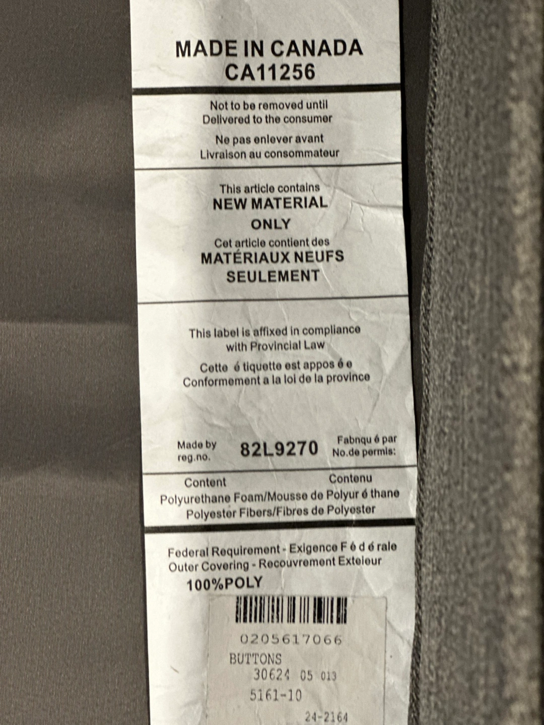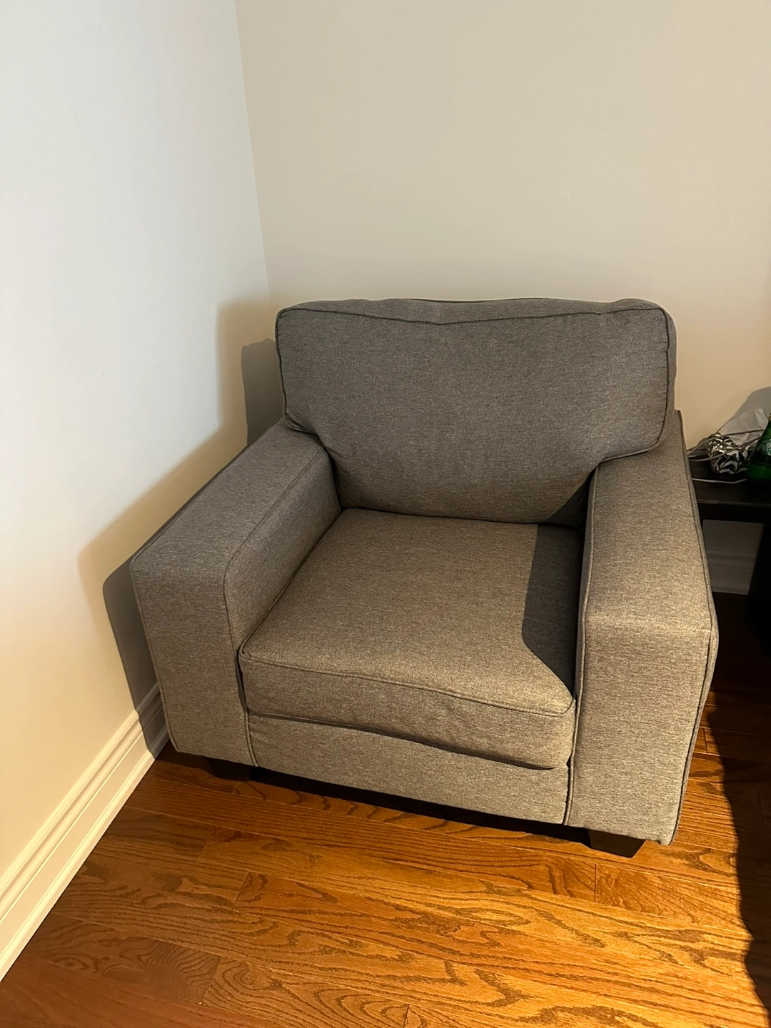 Stylish and sturdy sofa and chair Made in Canada L: 85” , W :38”, H:91” In excellent condition Sofa and armchair set. Upholstered in a neutral grey fabric. The cushions are removable. Perfect for relaxing after a long day. Smoke and pet free house