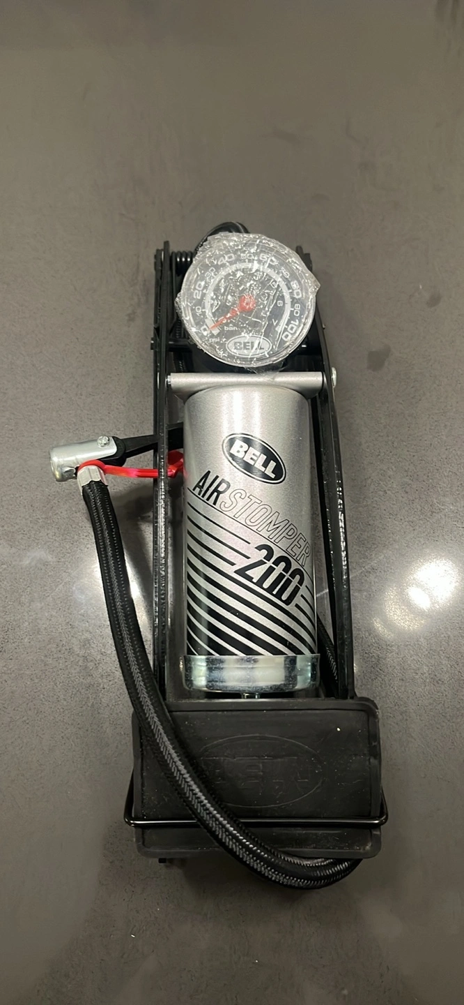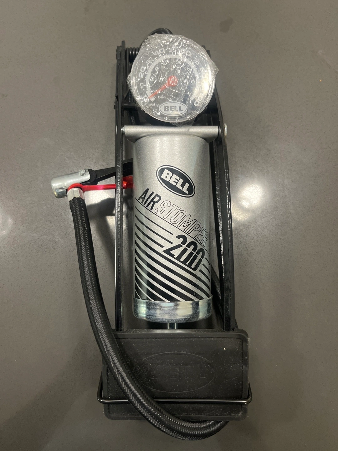 Silver and black foot pump. Features a gauge for easy reading. The hose is flexible. You can use this to inflate tires with minimal effort.