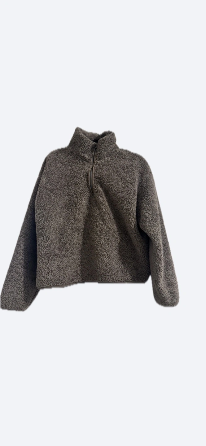 A fleecy pullover with a mock neck. Has a zip closure down the chest. A great addition to your wardrobe on a cold day, I find myself wearing mine often.