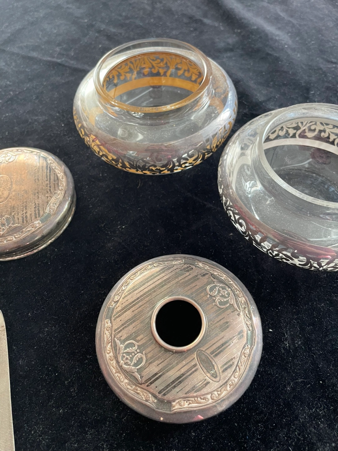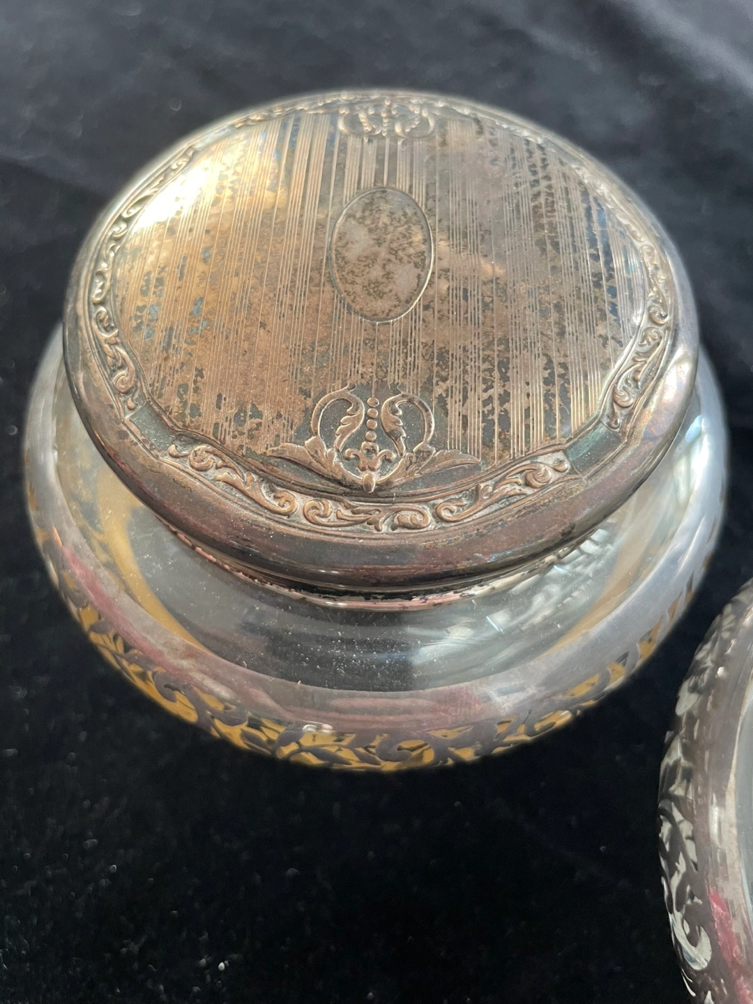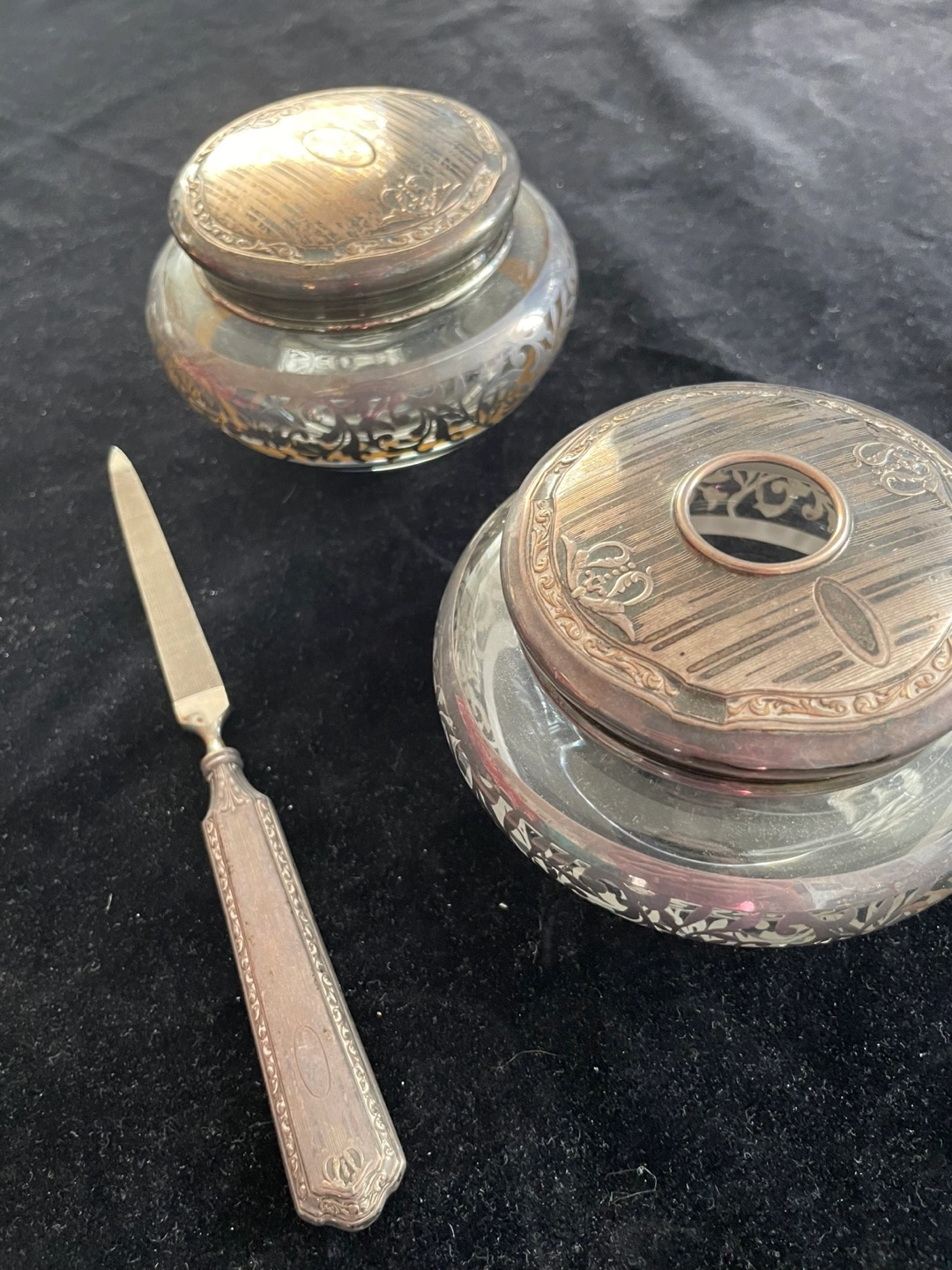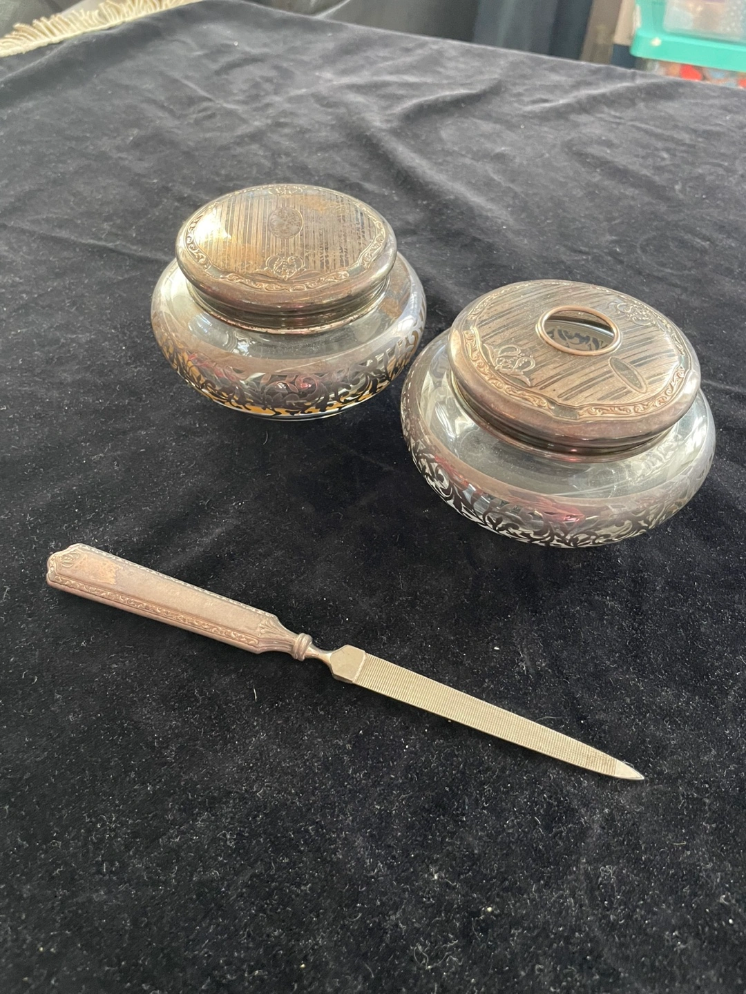 Vintage silver vanity set Includes two decorative jars with lids, and a silver nail file Features silver rims and lids with ornate detailing. Perfect for adding a touch of elegance to your space and creating a cozy atmosphere. Needs a polish but in good condition Pick up near Yonge and eglinton