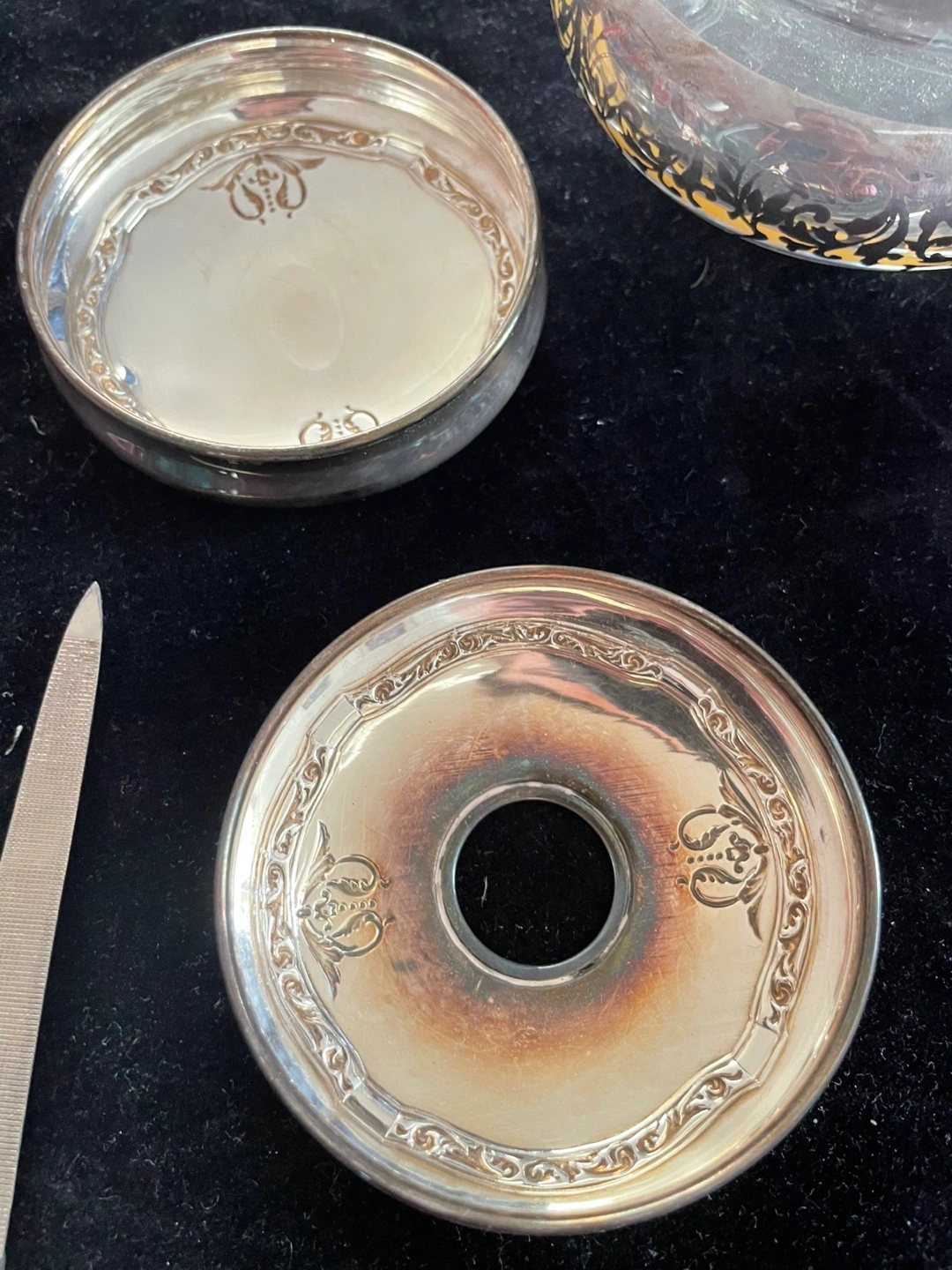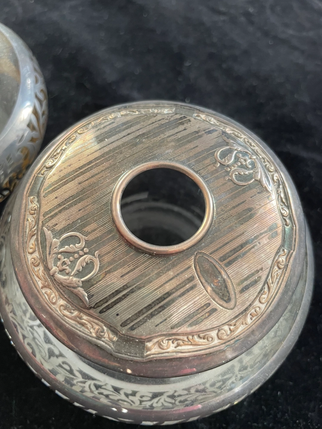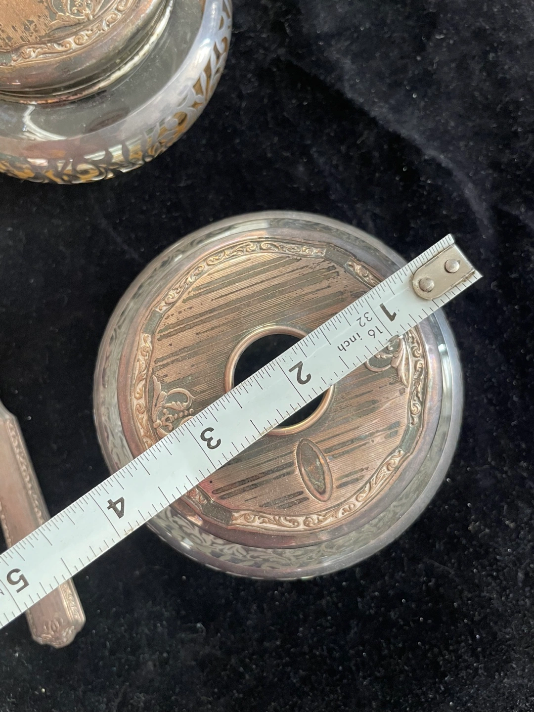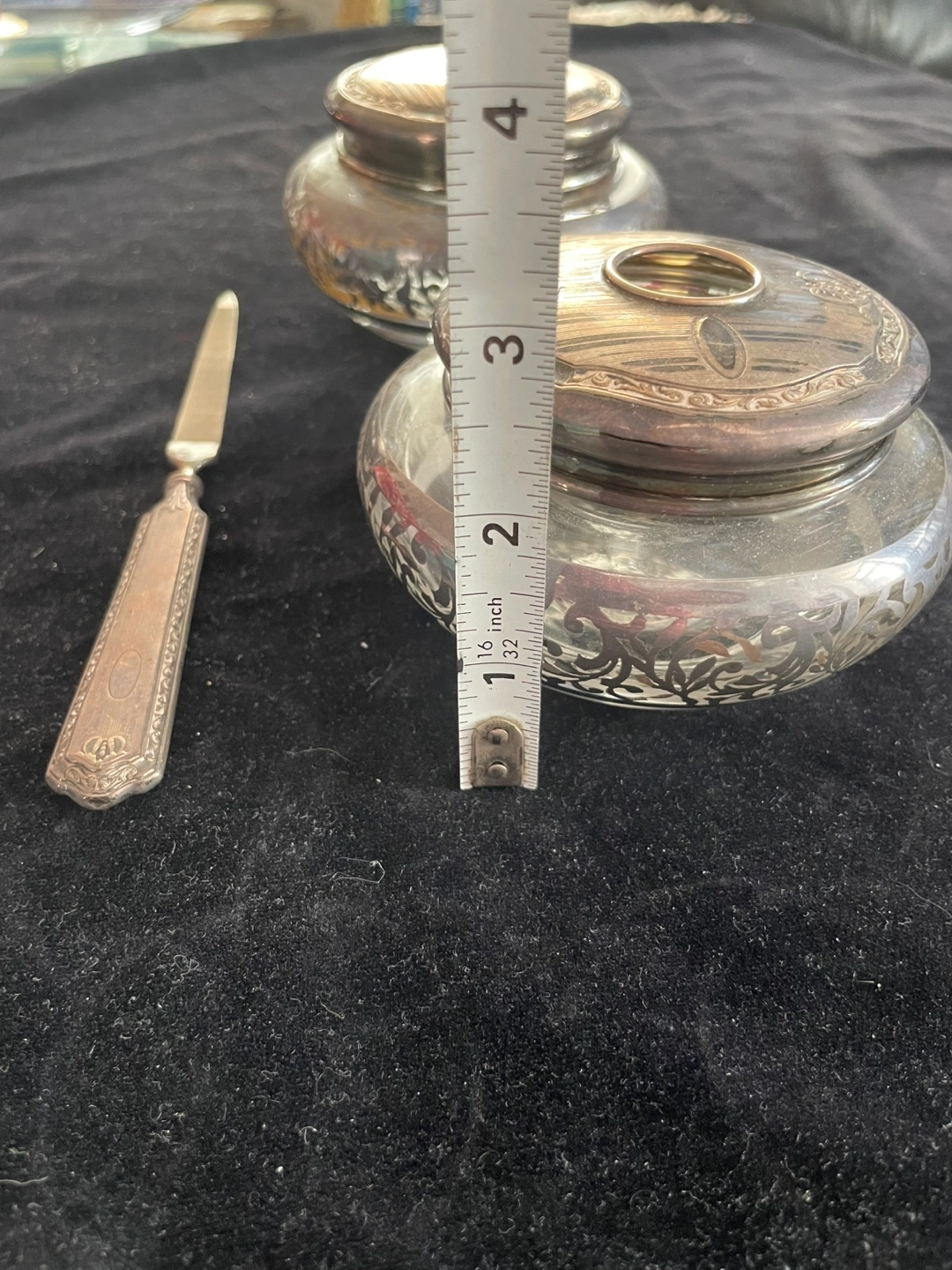 Vintage silver vanity set Includes two decorative jars with lids, and a silver nail file Features silver rims and lids with ornate detailing. Perfect for adding a touch of elegance to your space and creating a cozy atmosphere. Needs a polish but in good condition Pick up near Yonge and eglinton