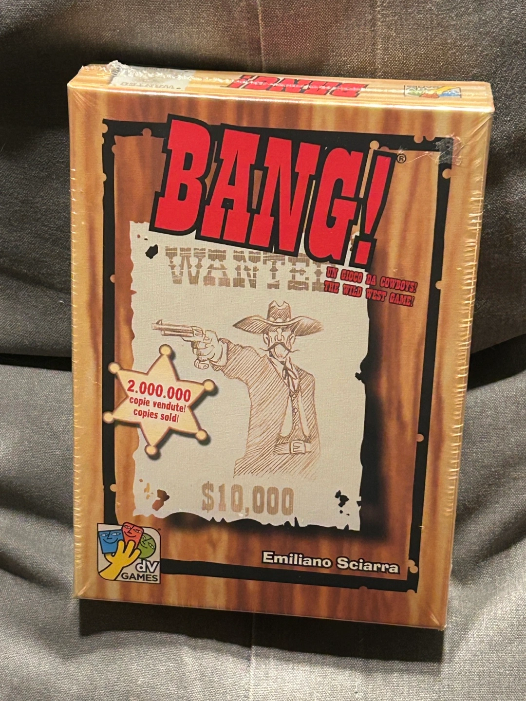 BANG! The Wild West Card Game of Deduction and Showdowns Step into the lawless Wild West in BANG!, the legendary card game of hidden roles, strategy, and high-stakes shootouts! Will you uphold justice as the Sheriff, secretly protect your boss as the Deputy, bring chaos as the Outlaw, or wait patiently as the mysterious Renegade? Players must bluff, deduce, and outgun their opponents in this fast-paced game of bullets and betrayal. Each round brings suspense as you guess who’s on your side—and who’s hiding a BANG! card behind their poker face. • 🔫 For 4–7 players (expandable with optional expansions) • ⏱️ Game time: 20–40 minutes • 🎭 Hidden roles create tension and replayability • 🃏 Includes character cards, role cards, and action cards • 🏆 Perfect for parties, game nights, and fans of deduction games Whether you’re an old hand at shootouts or new to Dodge City, BANG! is a must-have for your tabletop collection. Saddle up, trust no one, and aim true!