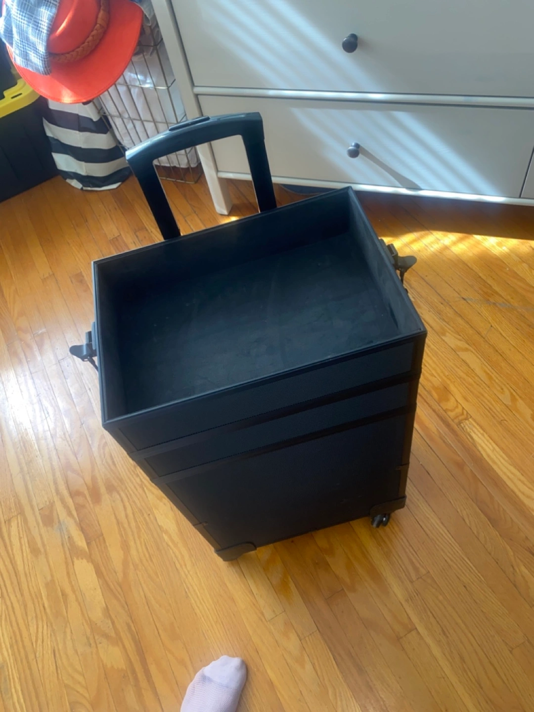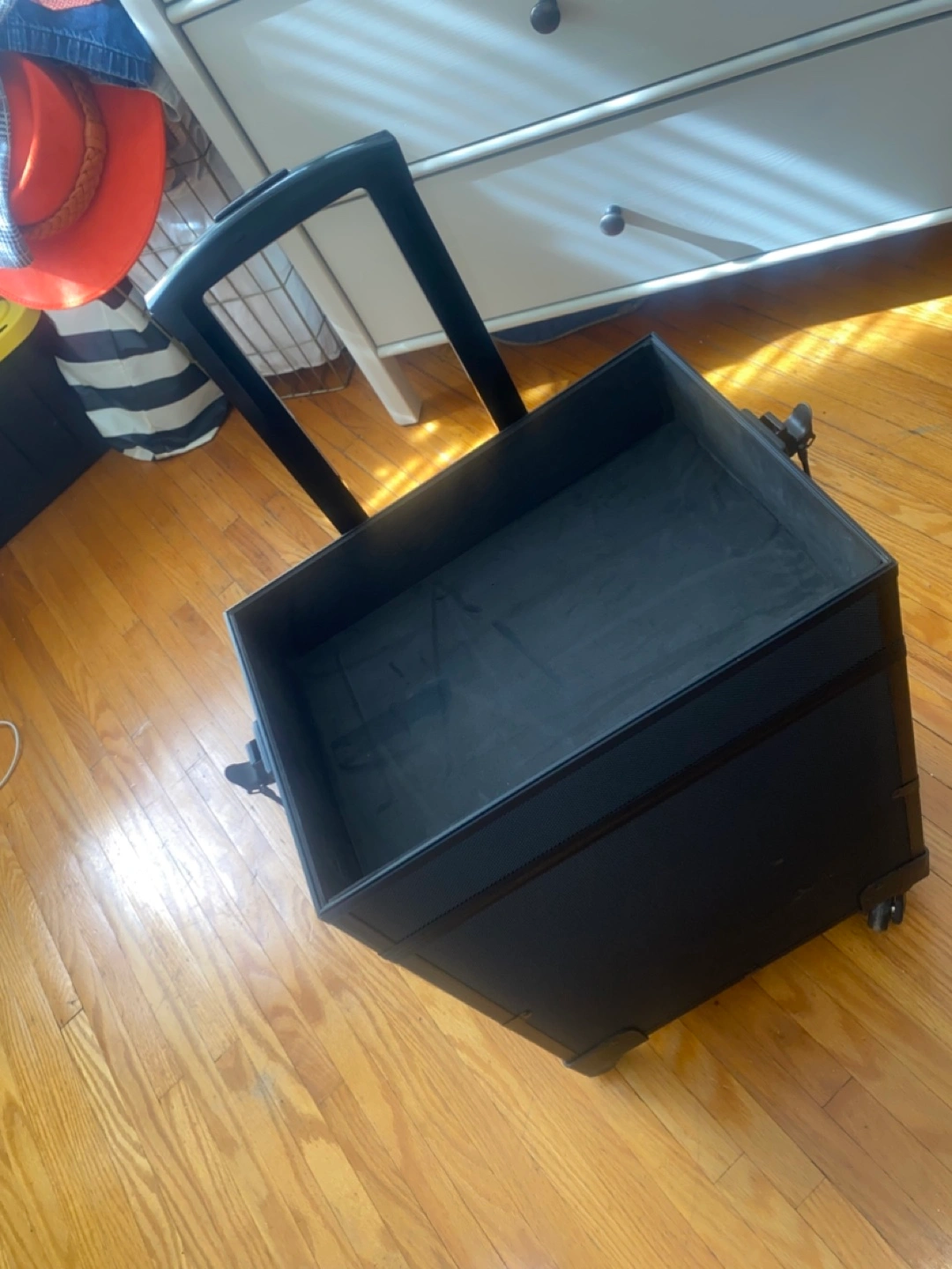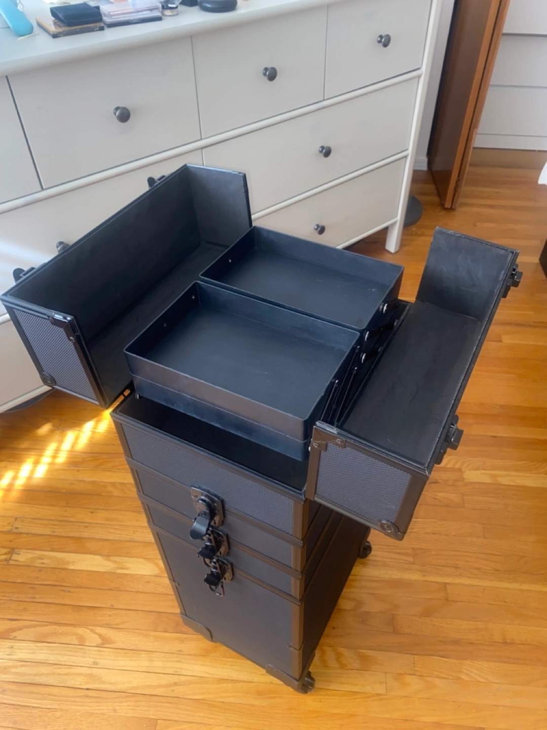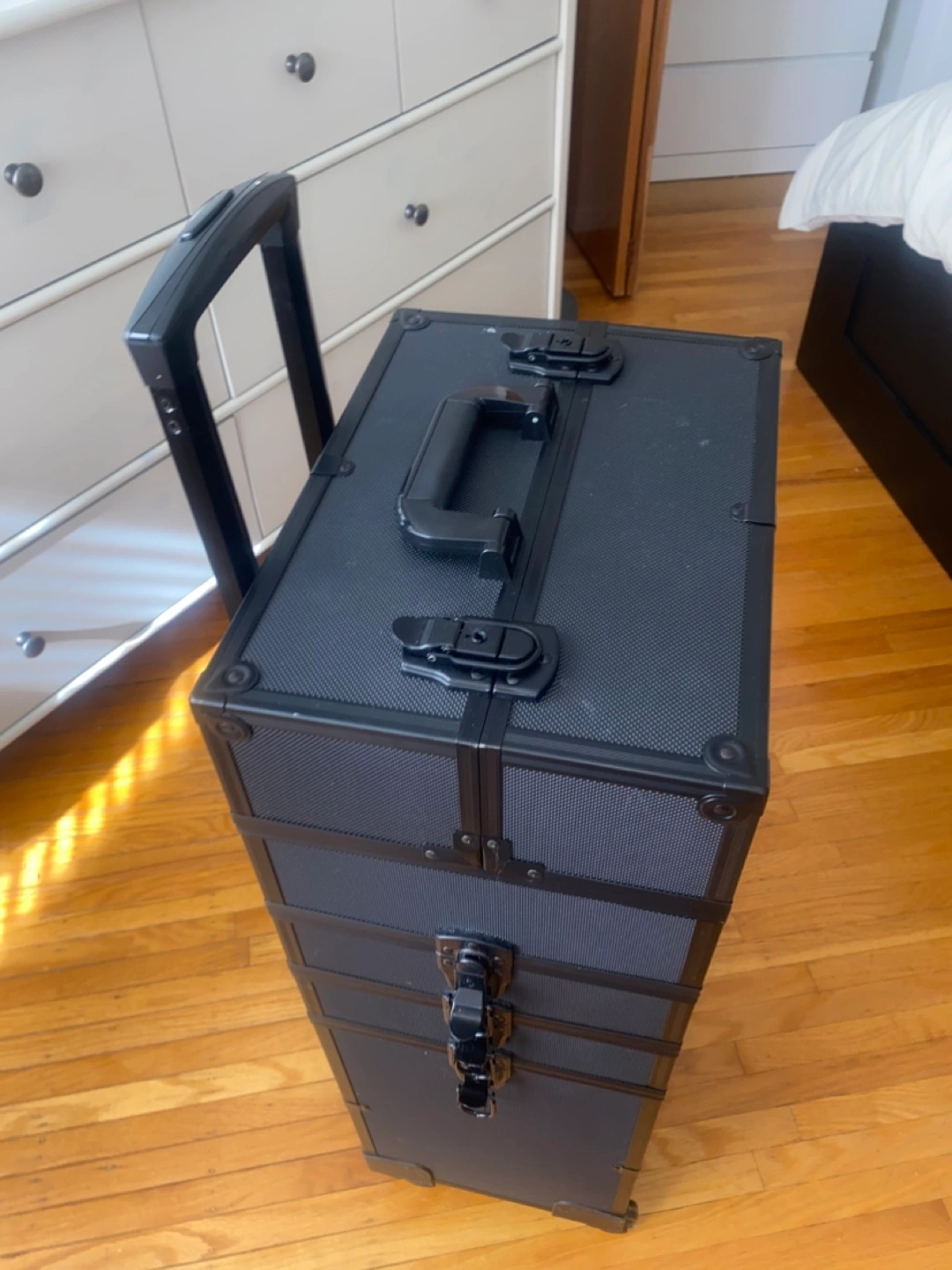 A black rolling case. Features several compartments and a telescoping handle. Great for organizing your essentials in a neat and orderly manner and transport them. You can lock it for safety.
