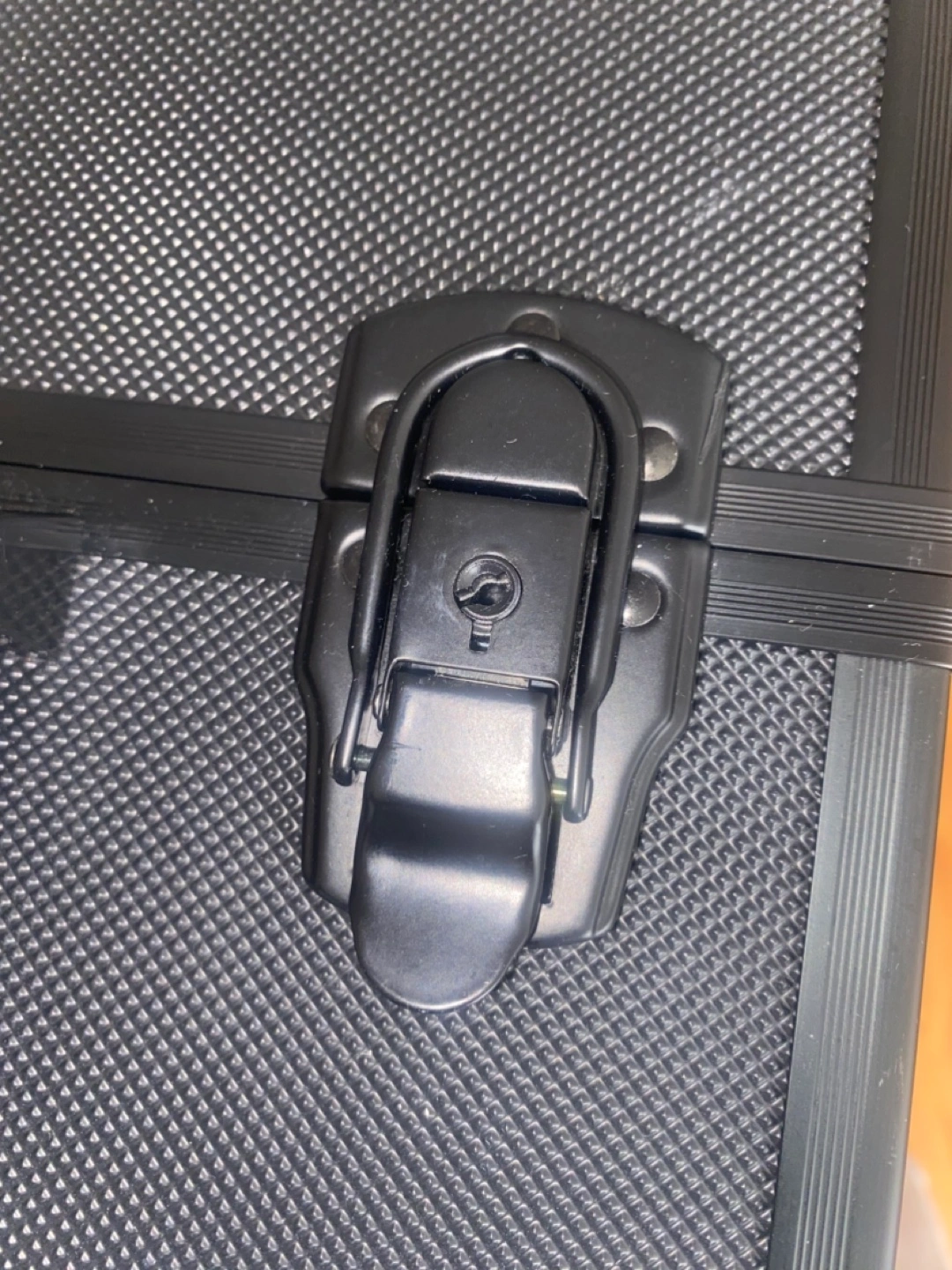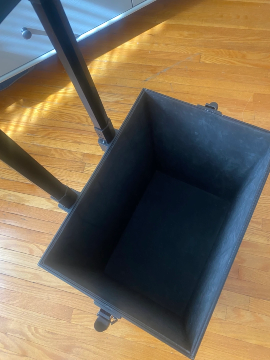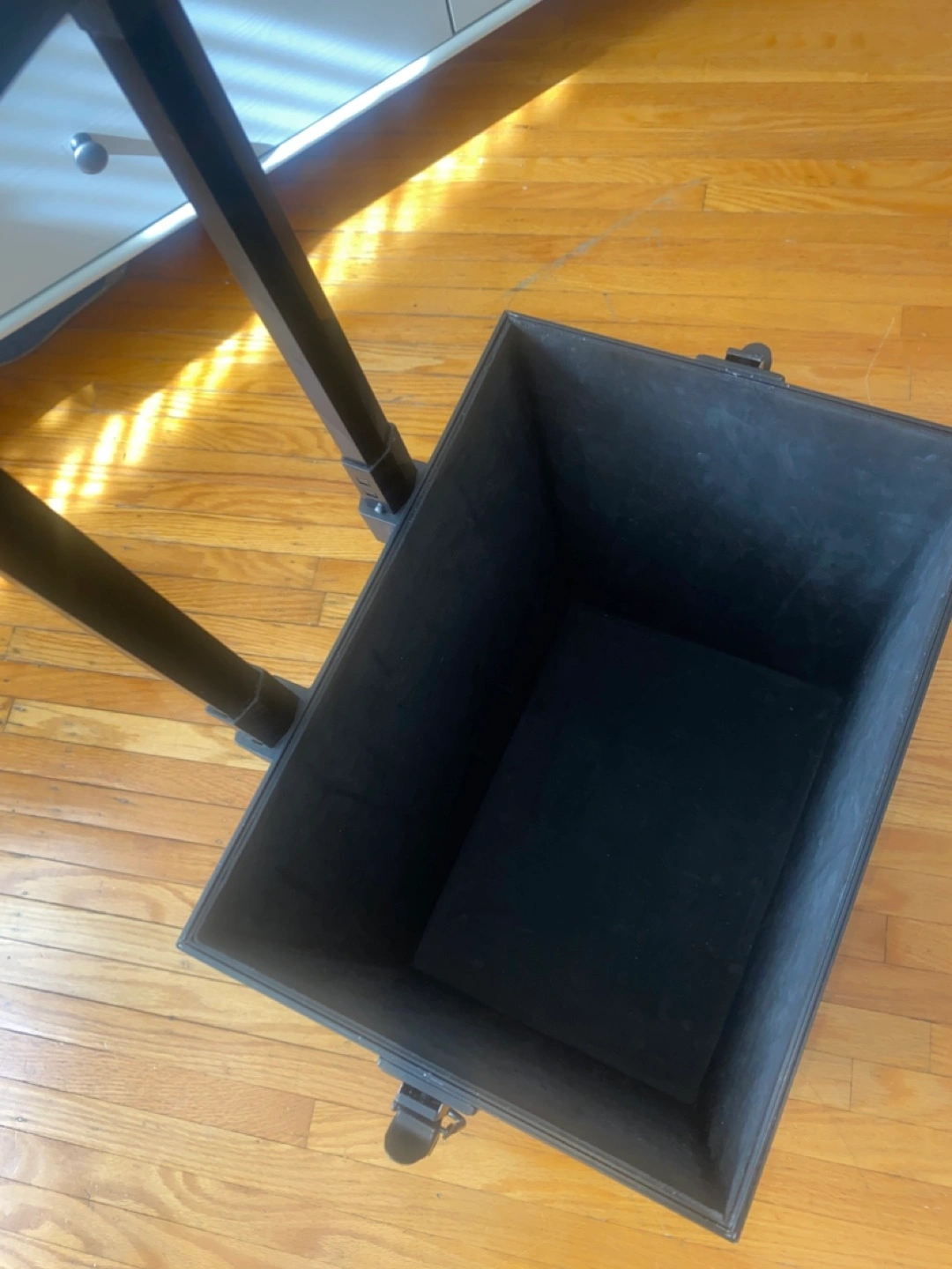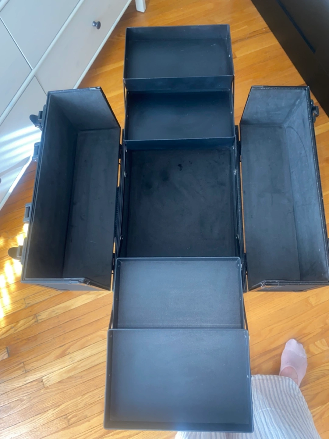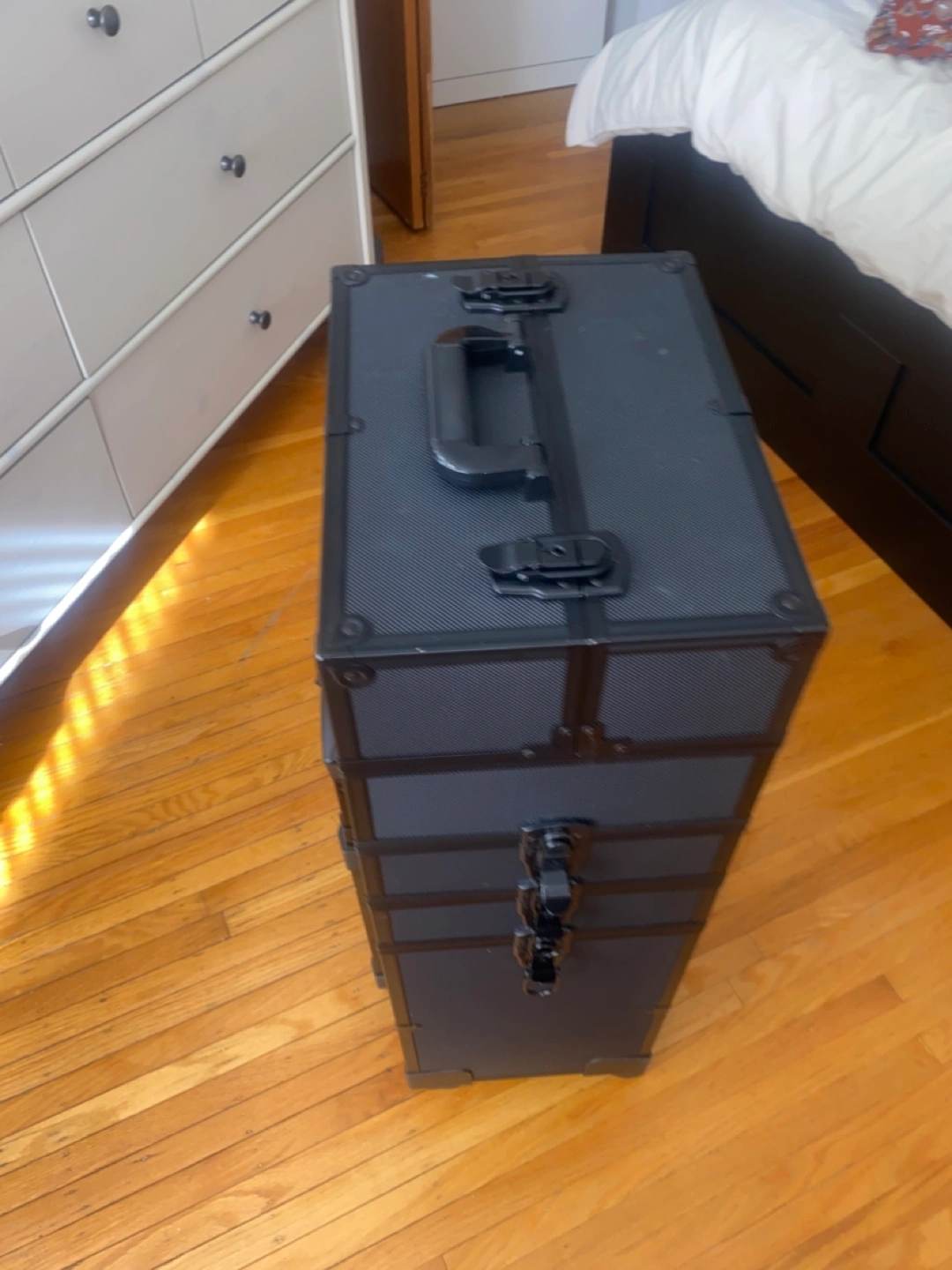 A black rolling case. Features several compartments and a telescoping handle. Great for organizing your essentials in a neat and orderly manner and transport them. You can lock it for safety.