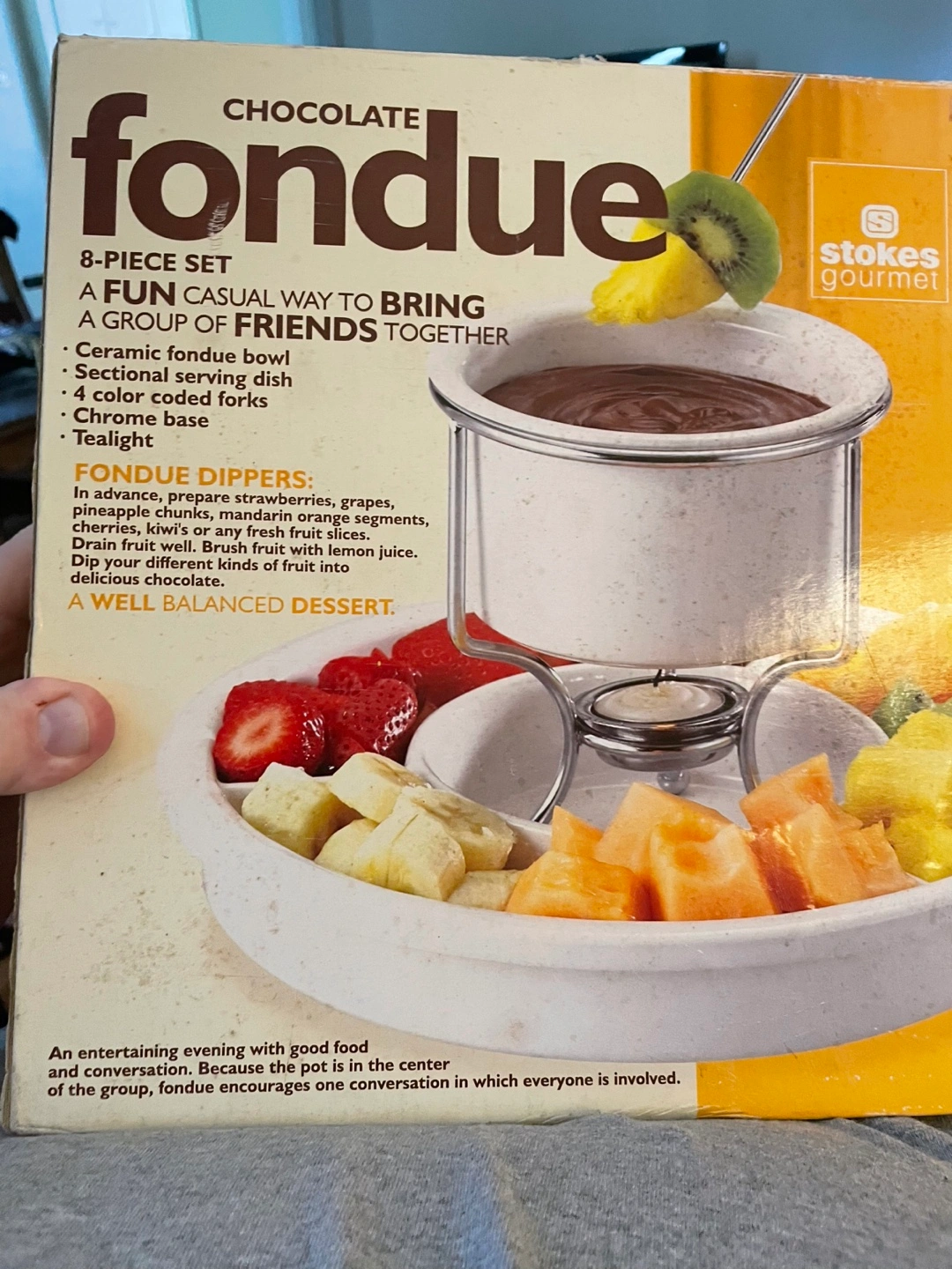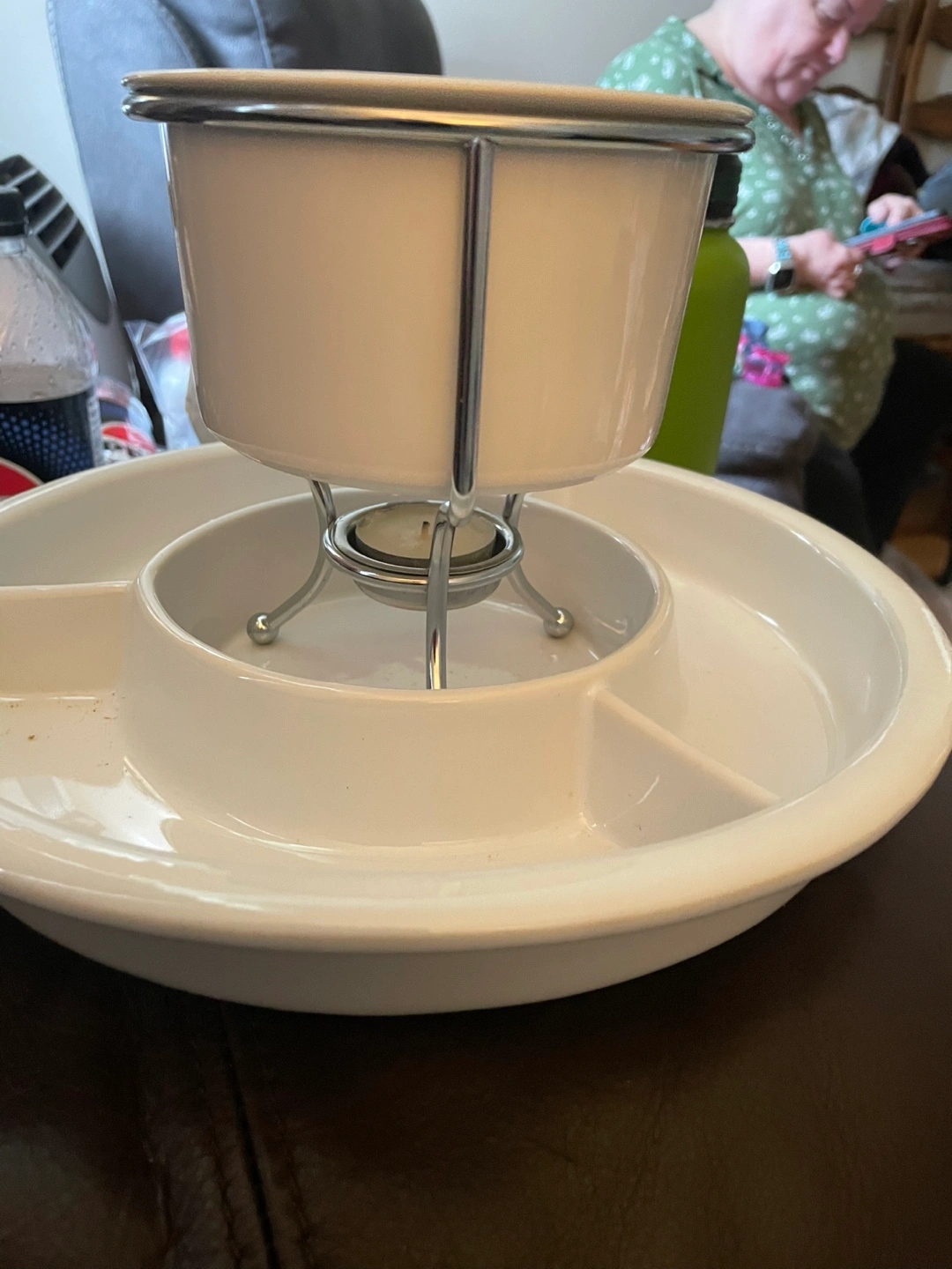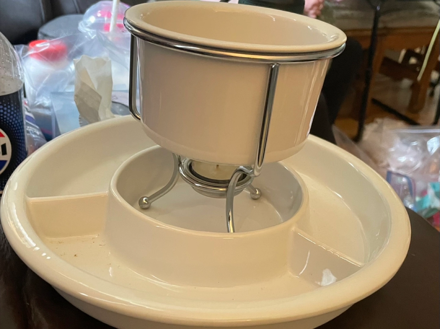 Lovely white fondue set. Includes the pot, stand, and tray. Perfect for a small, relaxing get-together. No skewers! Cash only, delivery available for extra $ See my other ads