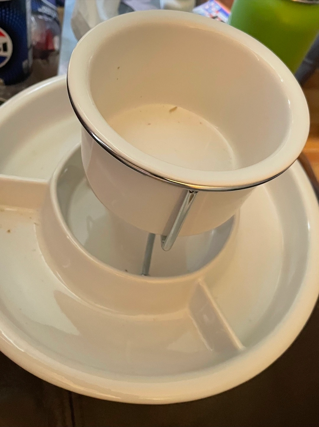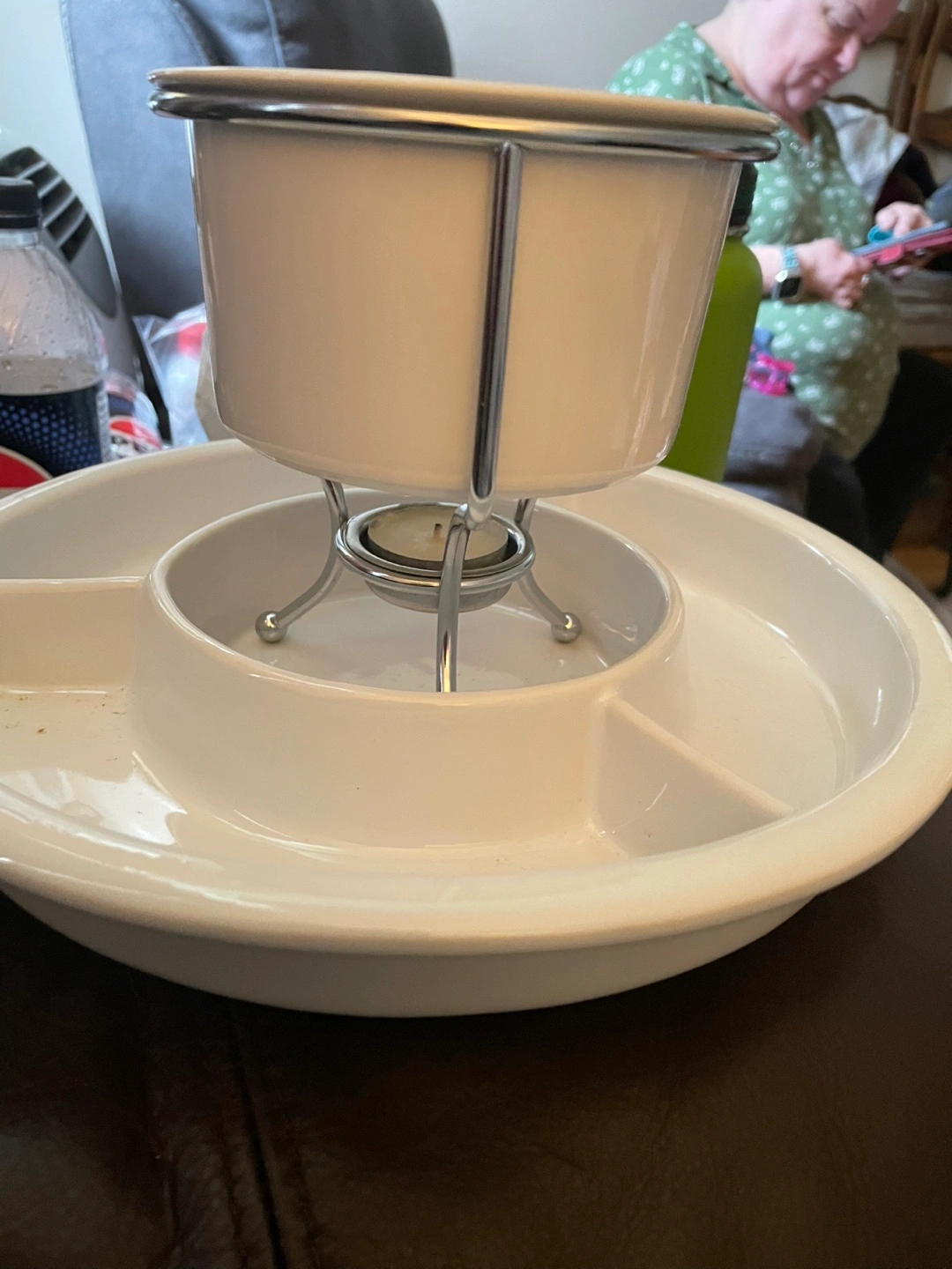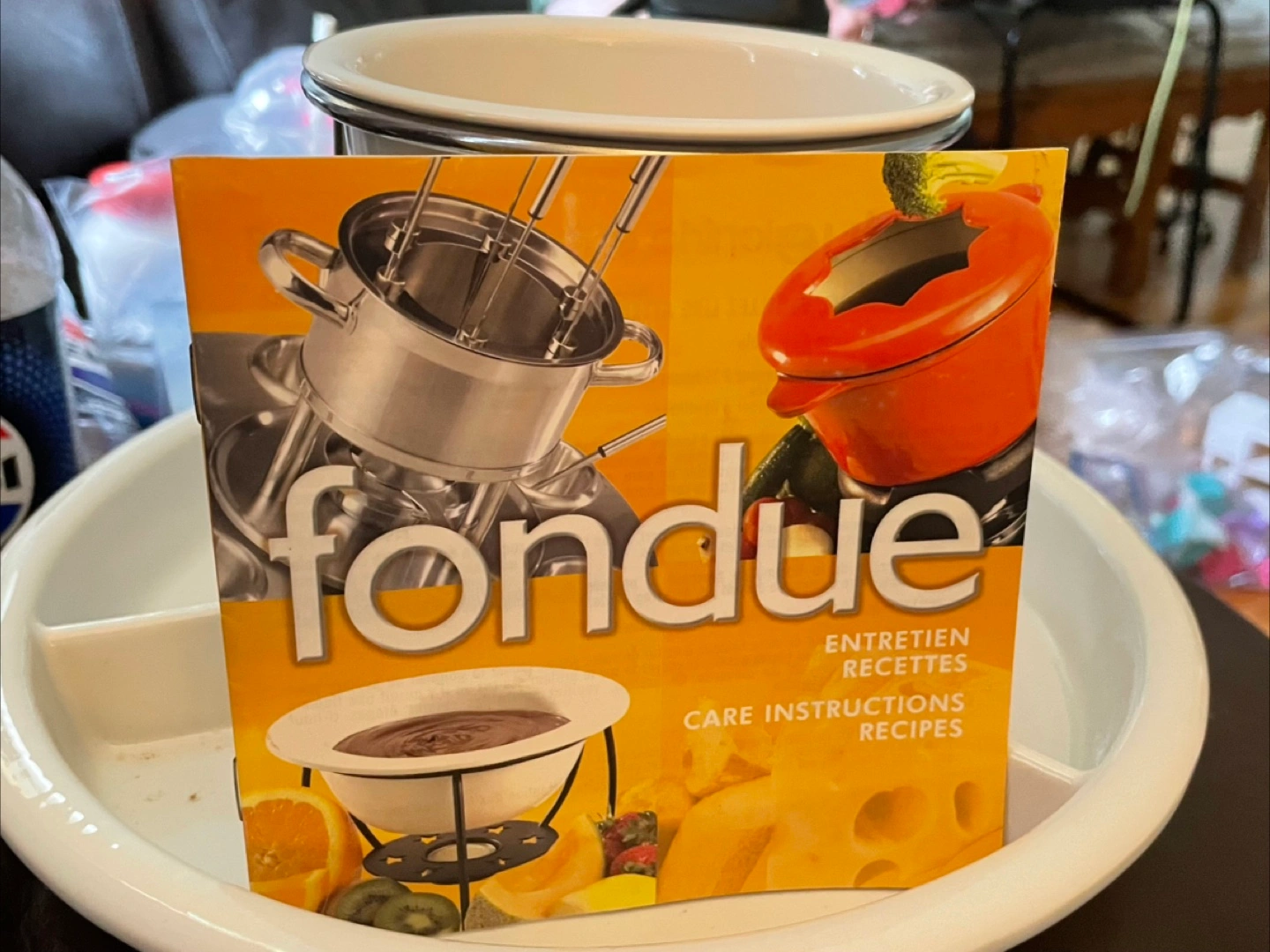 Lovely white fondue set. Includes the pot, stand, and tray. Perfect for a small, relaxing get-together. No skewers! Cash only, delivery available for extra $ See my other ads