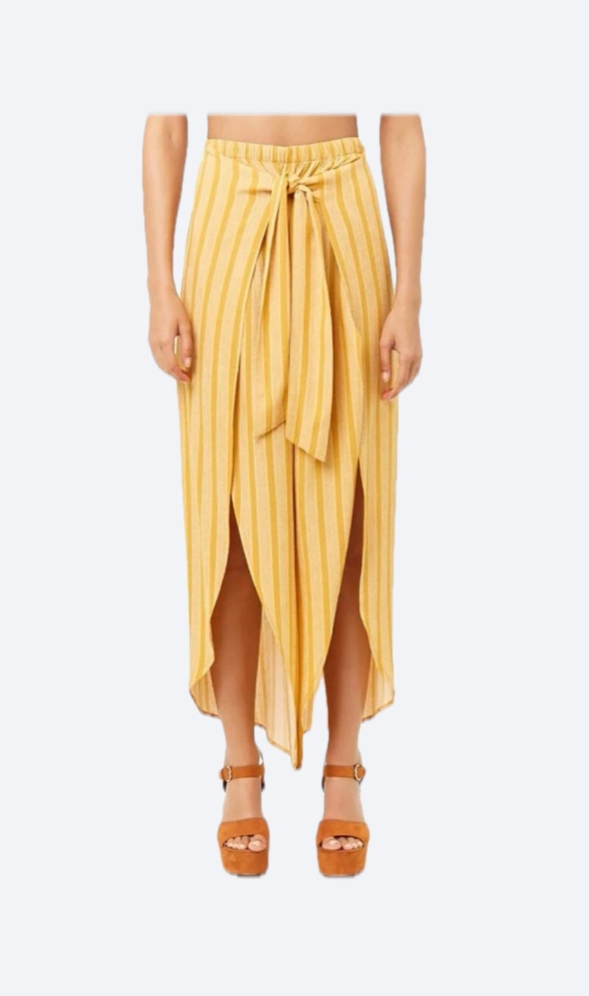 Wrap style pants in a vibrant yellow and white striped pattern. Features a tie-waist design. Perfect for a leisurely walk on a warm day.
