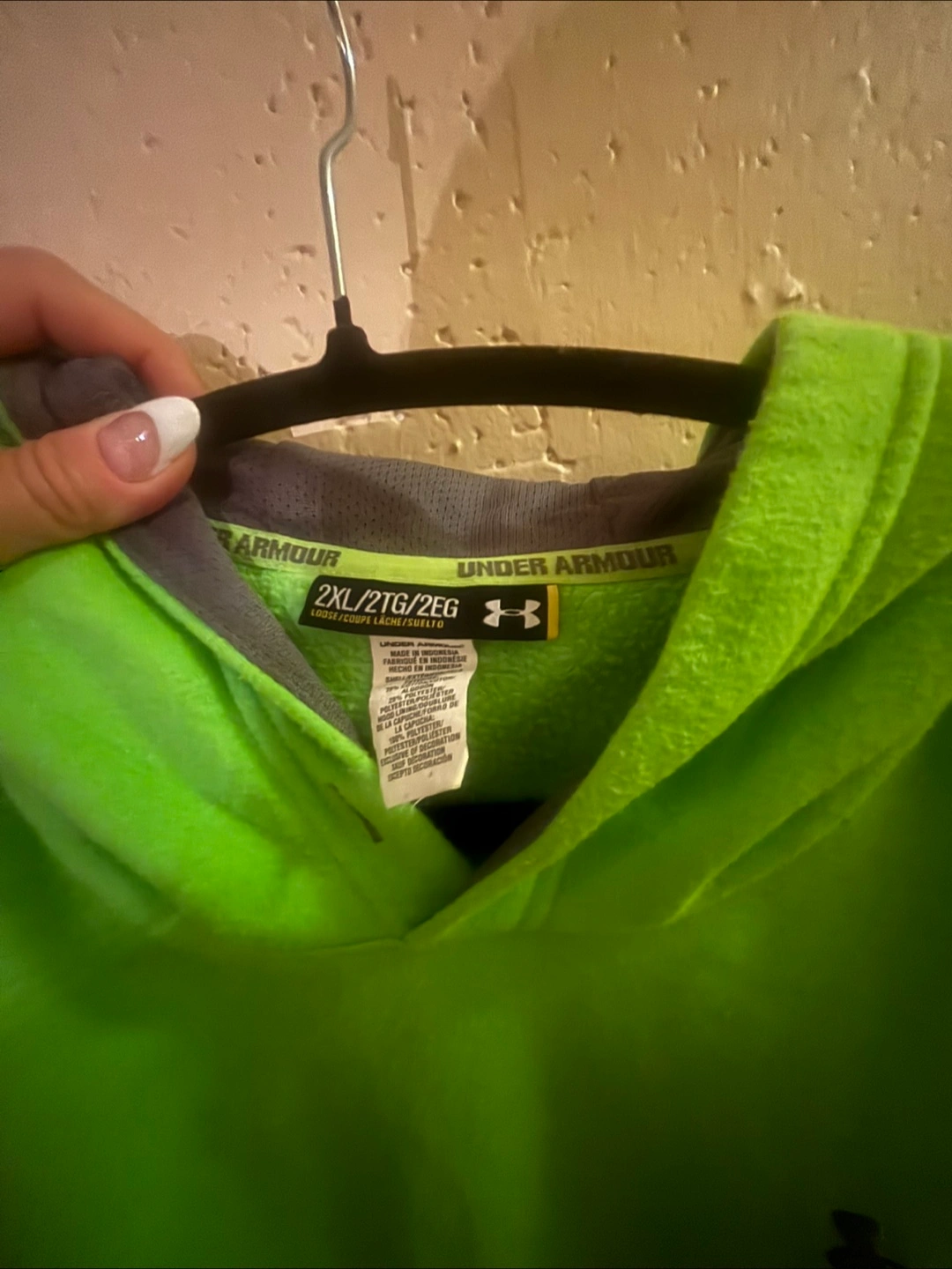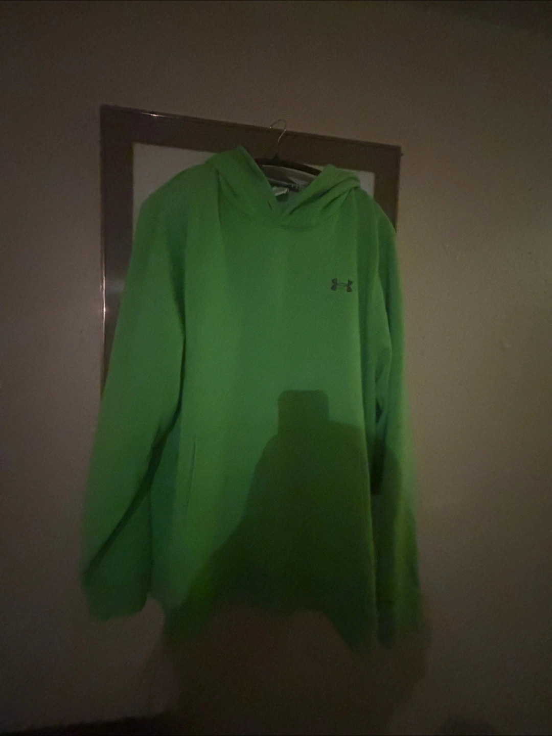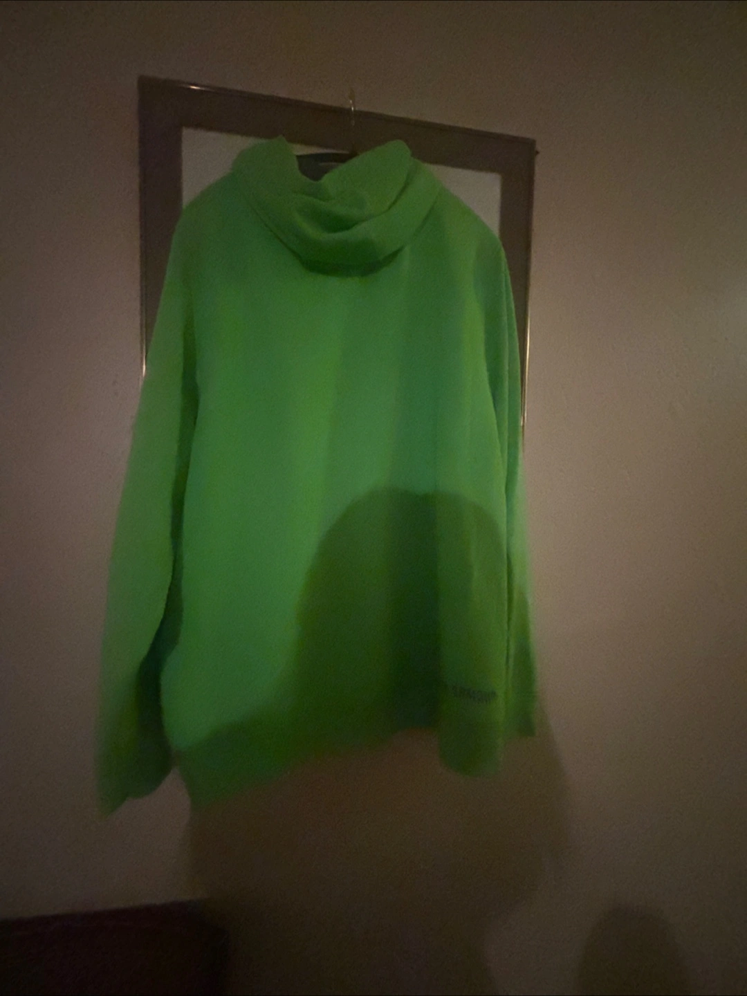 Lime green color. Great for someone that bikes or walks ay night. Helps you to be seen! (Which is why I bought it. Way too big on me as I’m a women’s small.
