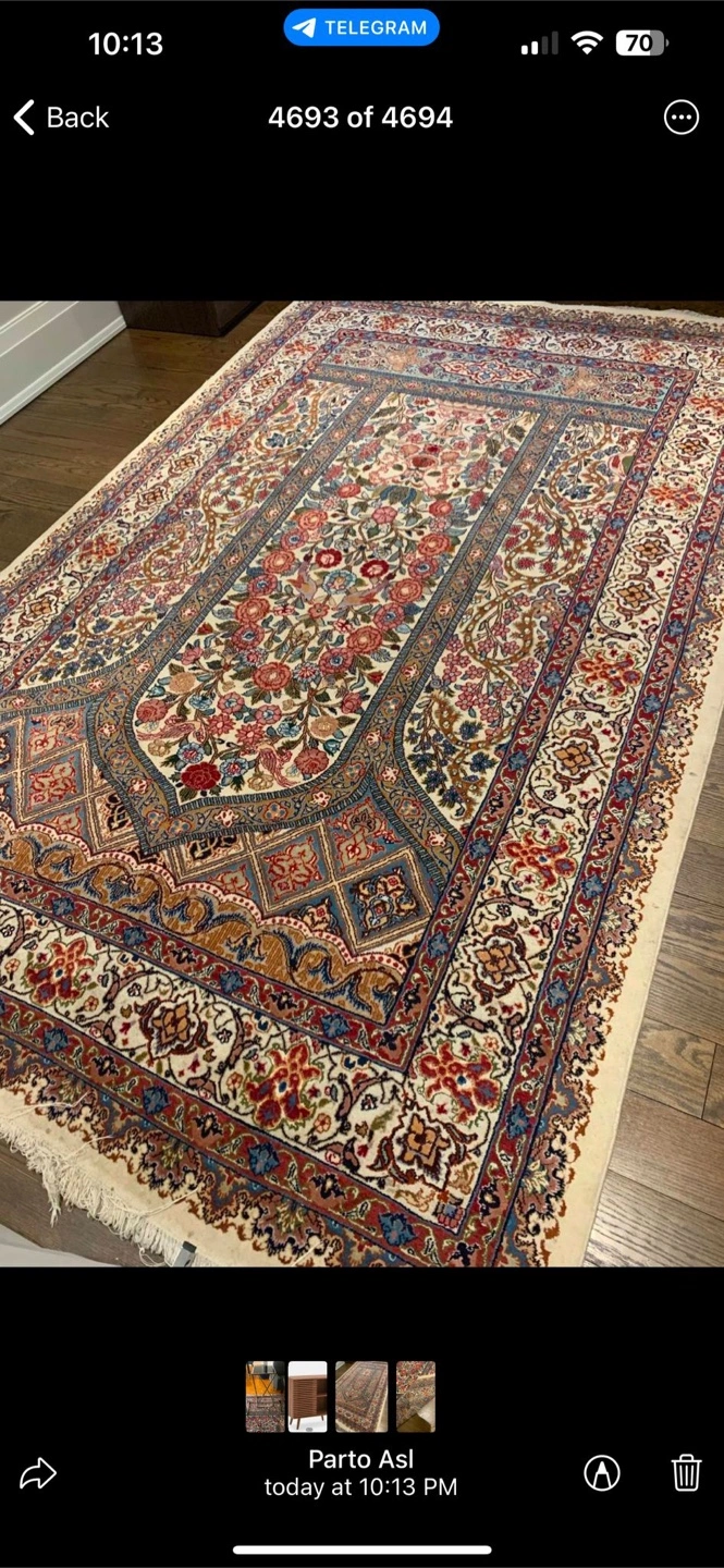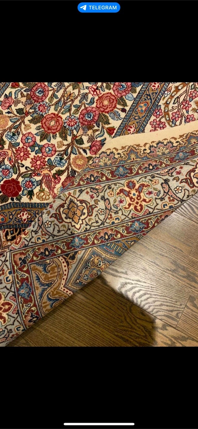 Elevate your space with this exquisite pair of authentic Persian Tabriz rugs. Hand-knotted by skilled artisans, these rugs feature an intricate floral pattern with vibrant reds, blues, and ivory tones. Each rug measures 2 x 3 meters (approximately 6.5 x 9.8 feet), ideal for living rooms, large offices, or entryways. Crafted with a fine wool and silk blend on a cotton foundation, they offer a luxurious texture and exceptional durability. Details: • Origin: Tabriz, Iran • Size: 2m x 3m (6.5ft x 9.8ft) – each • Material: Wool & Silk on Cotton • Knot Density: Approx. 400–600 KPSI (fine weave) • Condition: Excellent – like new • Design: Traditional floral medallion with elegant borders • Colors: Cream background with rich red, blue, beige, and green accents • Quantity: Two (matching pair – sold together or separately) Price: • CAD $2,400 each or CAD $4,500 for the pair (Price is negotiable – reasonable offers welcome) Delivery & Shipping: • Free local delivery within GTA (Greater Toronto Area) • Canada-wide & international shipping available at cost • Secure packaging included #PersianRug #TabrizRug #HandmadeRug #WoolAndSilkRug #AuthenticPersianCarpet #LuxuryHomeDecor #OrientalRug #HandKnottedRug #VintageRug #PersianCarpet #IranianRug #RugForSale #RugCollector #AreaRug #HomeDecorCanada Contact: 647510634 A beautifully patterned rug with floral detailing. Features a cream coloured background with a border in dark blue, red, and gold tones. An ideal way to add some comfort and style to your home, allowing you to create a relaxing atmosphere.