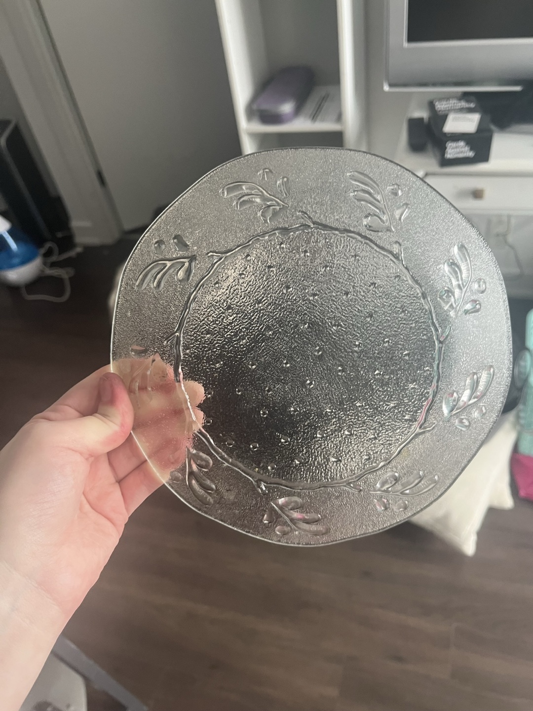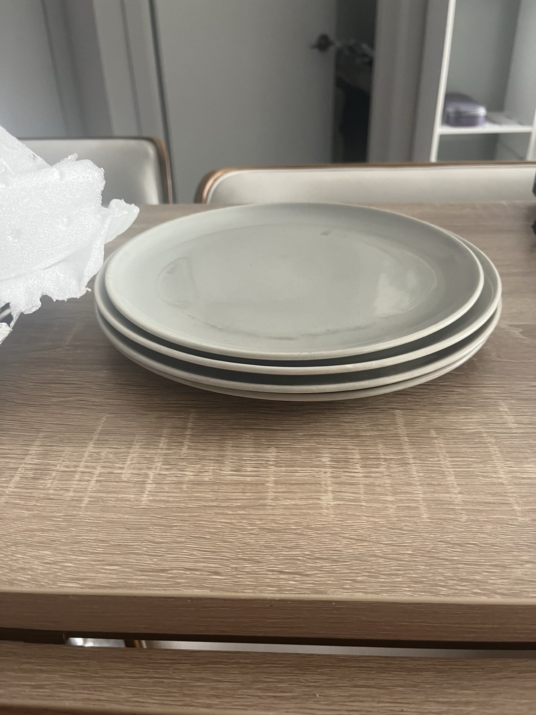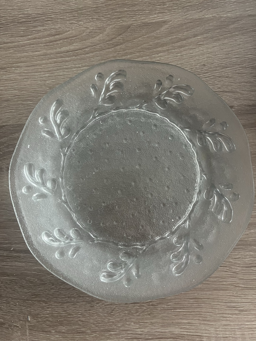 BRAND NEW Included: - Grey plates set: 4 Large Dinner plates, 3 medium size appetizer plates (one of the larger plates has a crack in it from moving) - Set of 4 vintage glass plates
