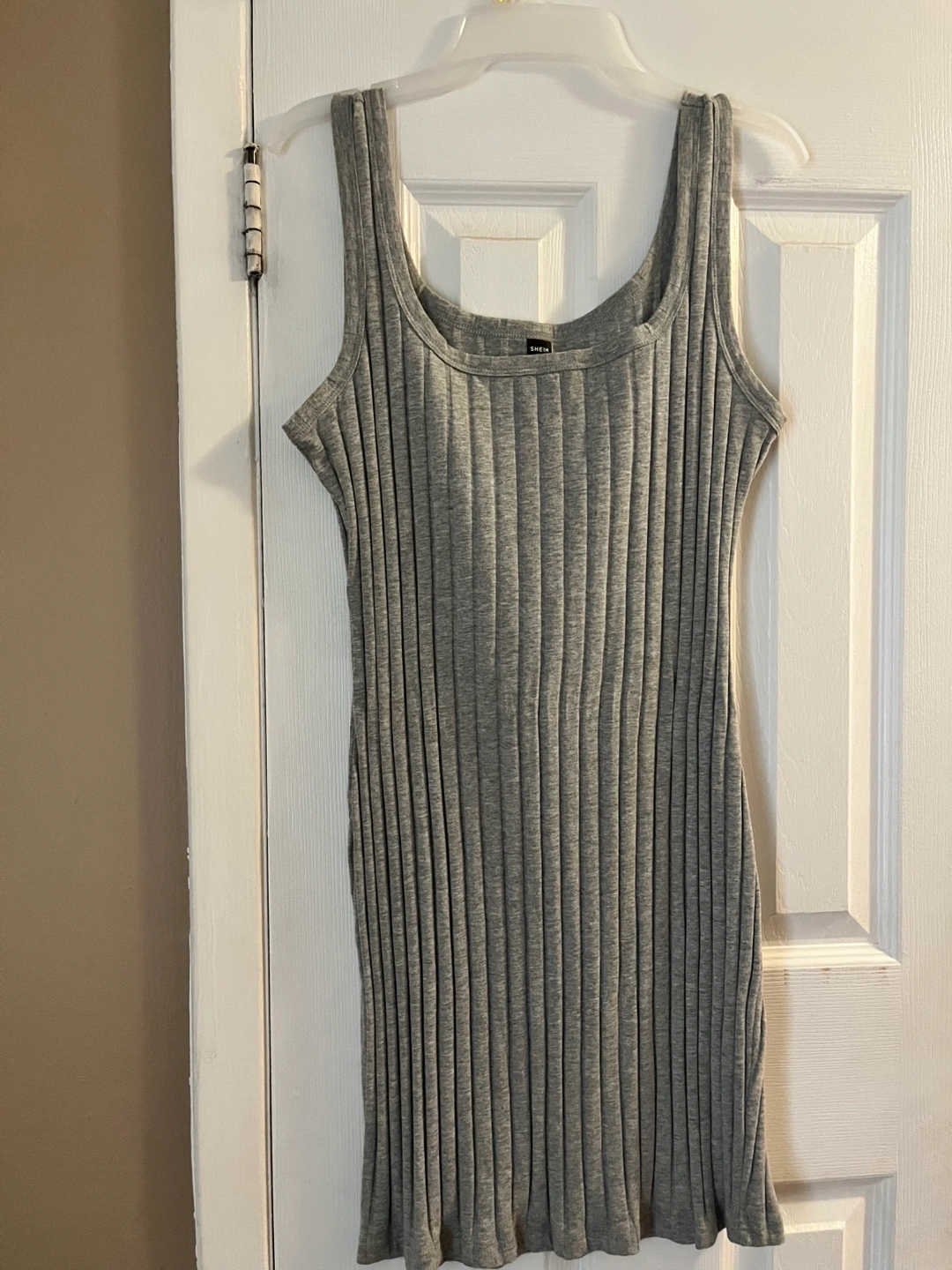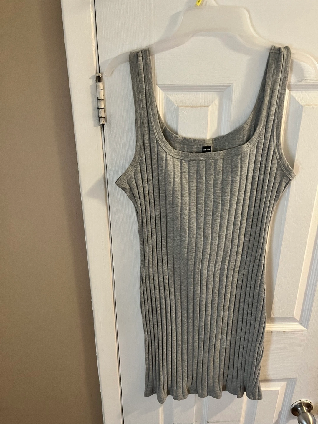 A cute grey tank dress. Ribbed material. Perfect for a relaxing day at home.