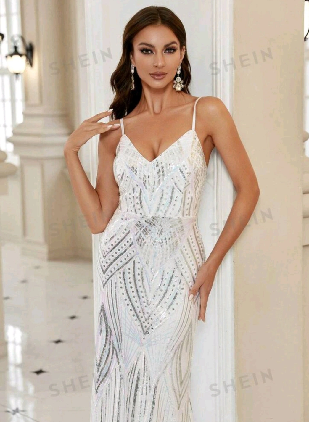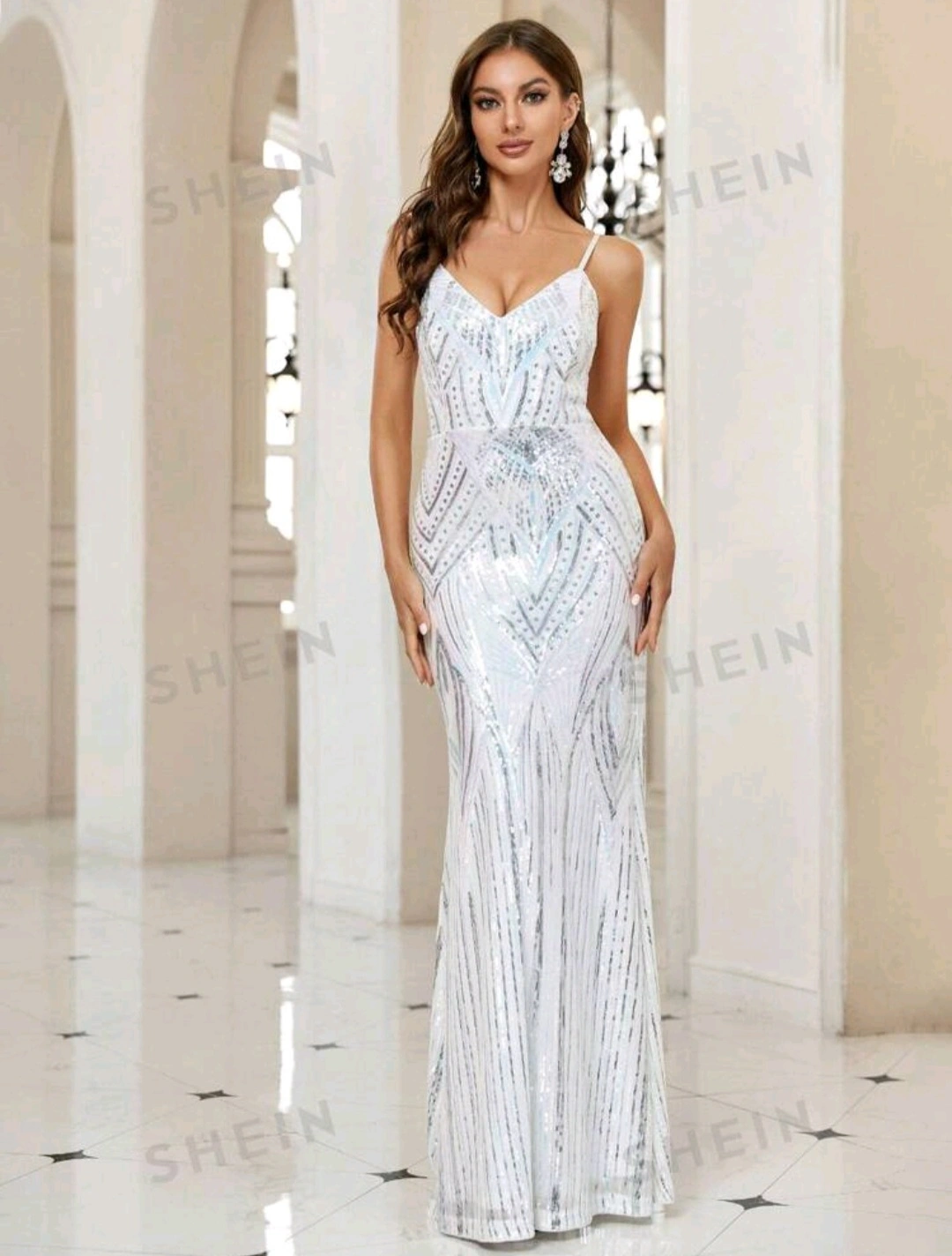 A long, white maxi dress. Features sequins. The dress is sleeveless. Perfect for a glamorous night out.