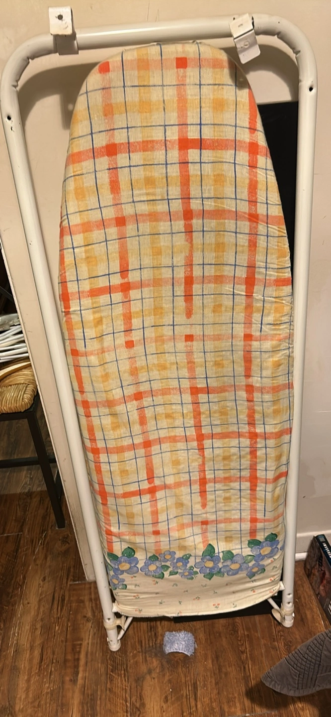 Ironing board featuring a metal frame. The cover appears to have a plaid pattern. The frame can be folded. A great find to help make your laundry routine a breeze.