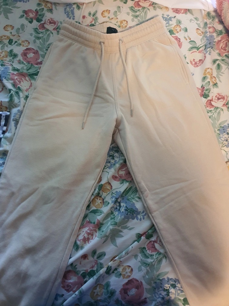 Beige-coloured sweatpants. Features an elastic waistband with a drawstring. These would be great to lounge around in on a lazy Sunday.