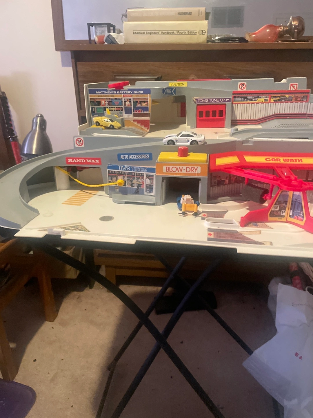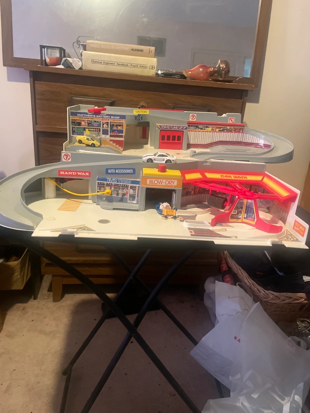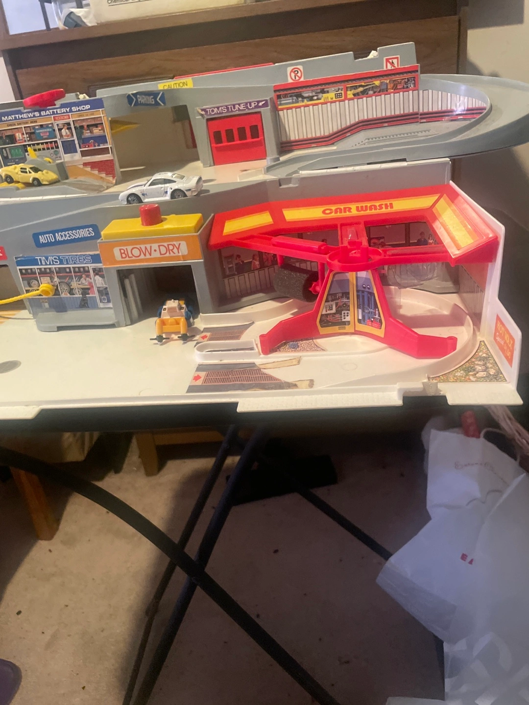 A car garage playset featuring different service stations and ramps. There is a car wash, a battery shop and a tune up shop. The set includes a yellow car and a white car. This would be a lovely item to relax and reminisce over.