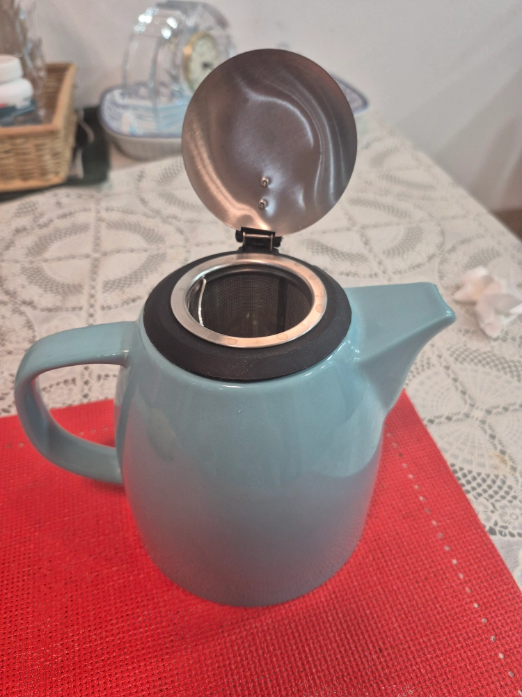 A lovely teapot in a calming light blue colour. It has a black rim around the opening and a stainless steel lid. It also comes with a stainless steel infuser. A great way to unwind and enjoy a quiet moment.