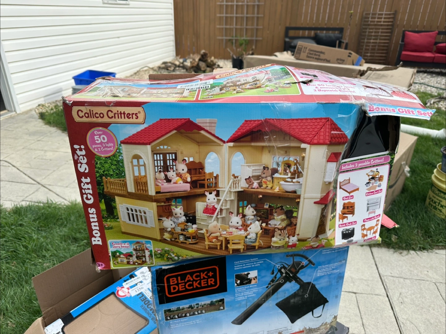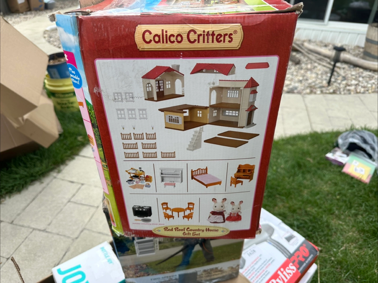 A Calico Critters Red Roof Country Home Gift Set. The box features an illustrated house with figurines inside. It displays over 50 pieces. It can be a great way to de-stress after a long day. I am not sure if pieces are missing as I got it from on line auction