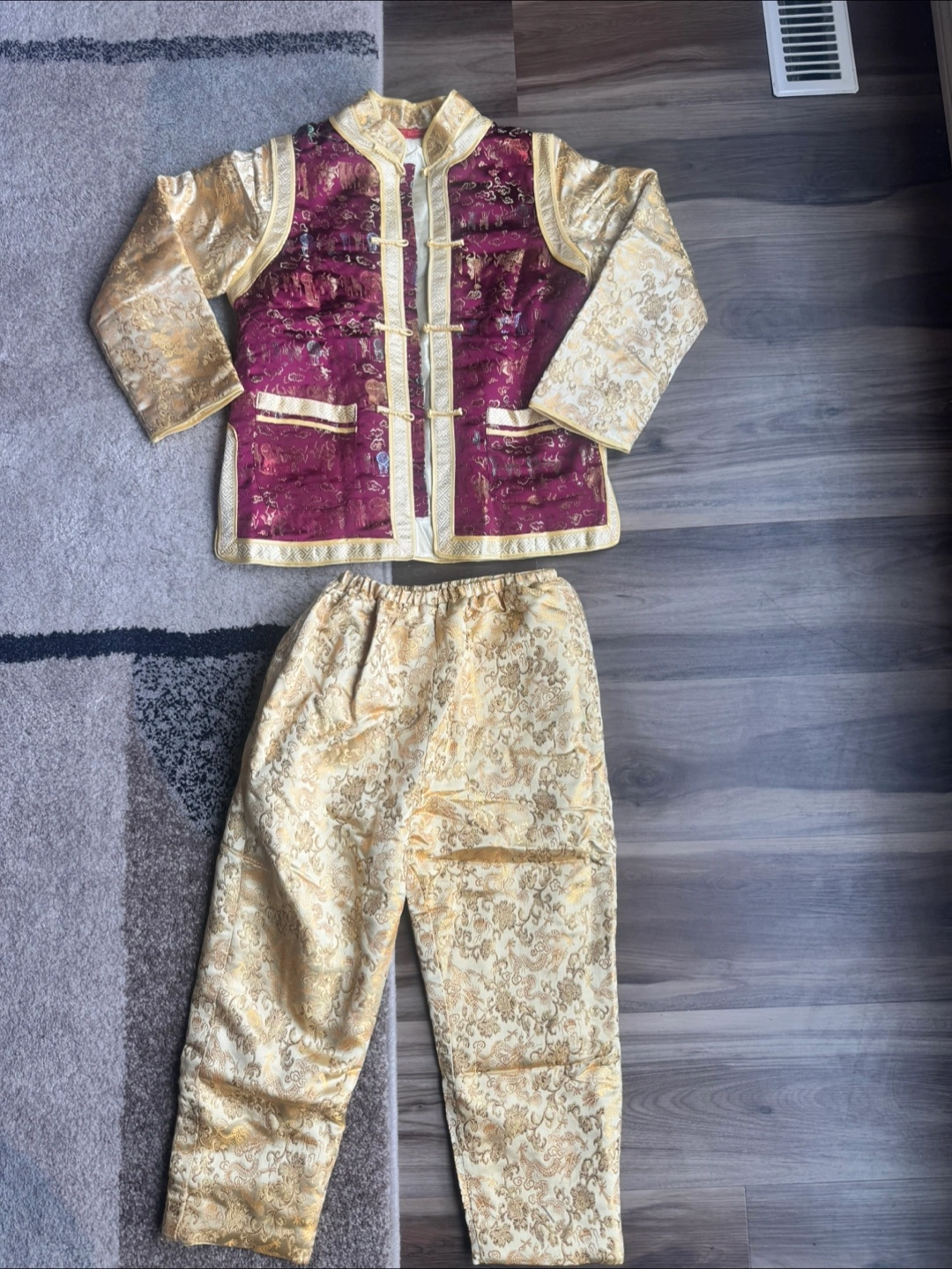 A golden and burgundy costume set. Includes a jacket with front closures. Features matching pants. This lovely set would be perfect for any special occasion.