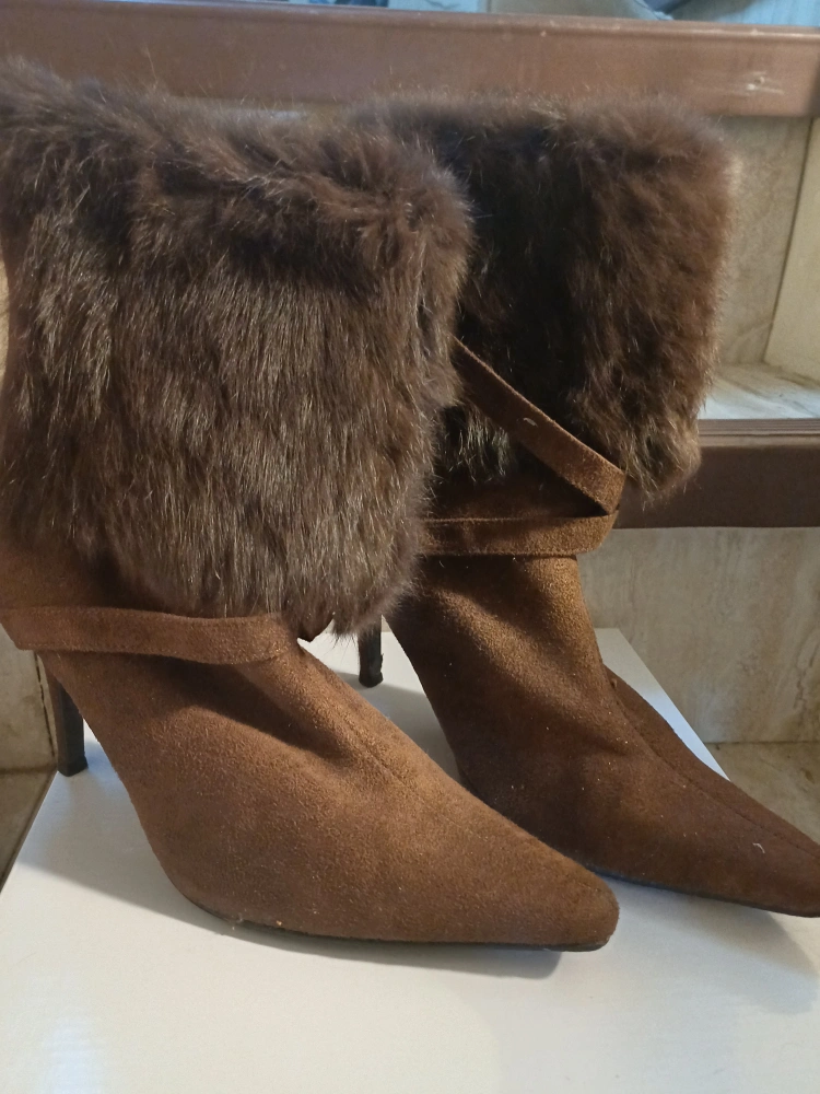 Stylish brown boots. Soft suede/fabric upper. Faux fur detail. Pointed toe. Slim heel. Back Zipper closure. Shows size 8.5 but look smaller/tighter