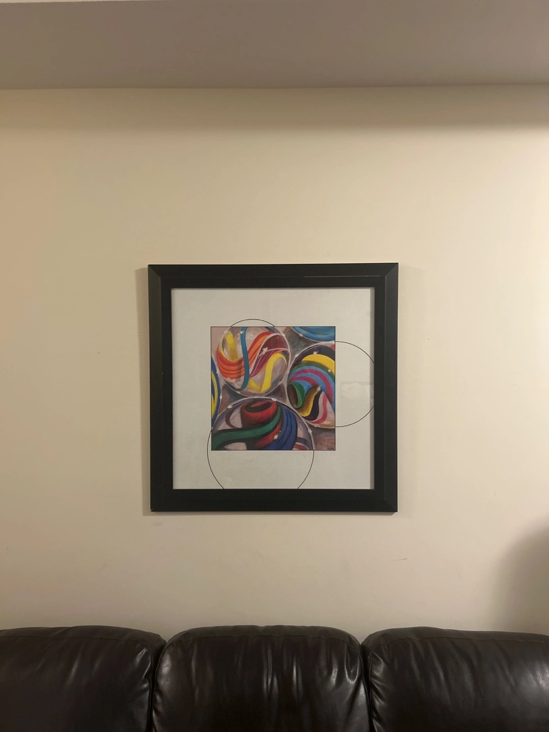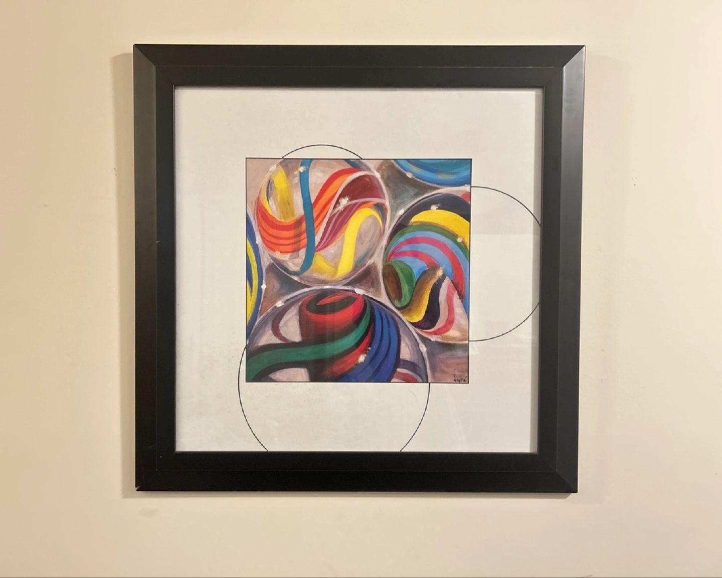 Title: Marvelous Marbles II. Medium: Giclee Print. Subject: Still life depicting colorful marbles. Location: This specific print is part of the collection at Children's Hospital Colorado, located on the 6th floor in the East Tower of the Anschutz Campus Note: the frame is not in perfect condition but can probably be coloured in with a wood marker