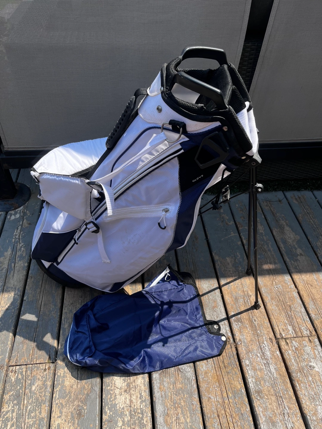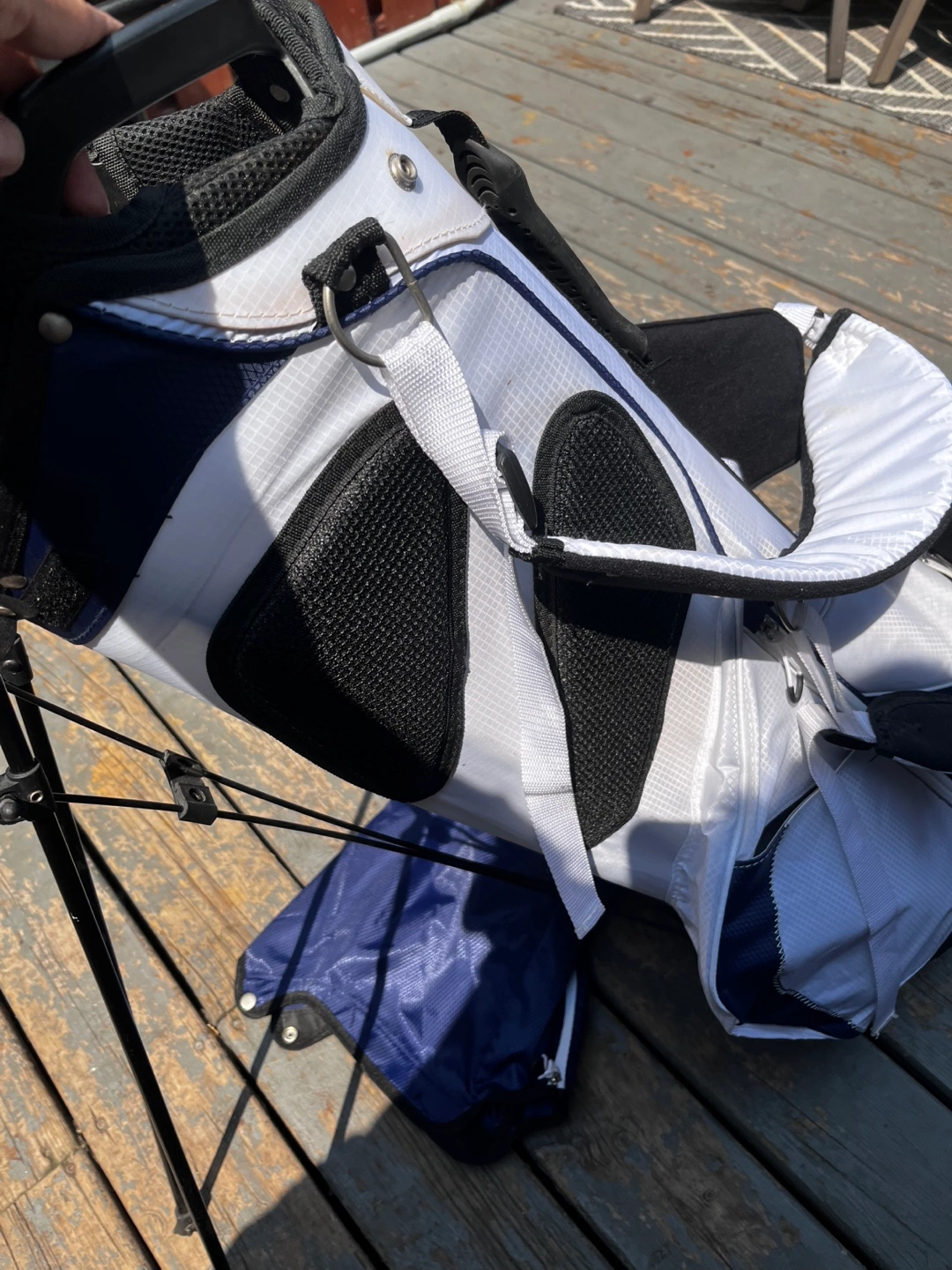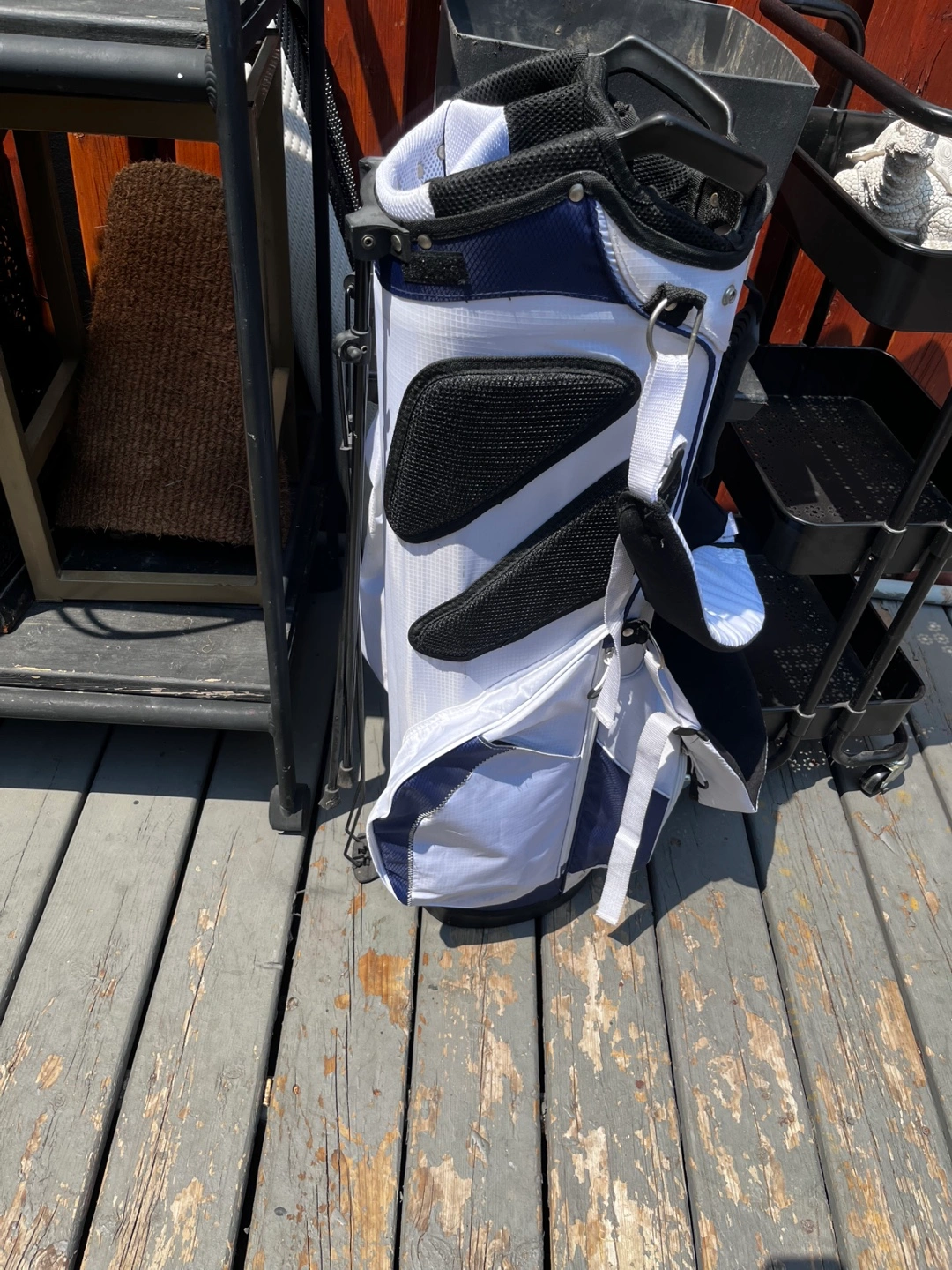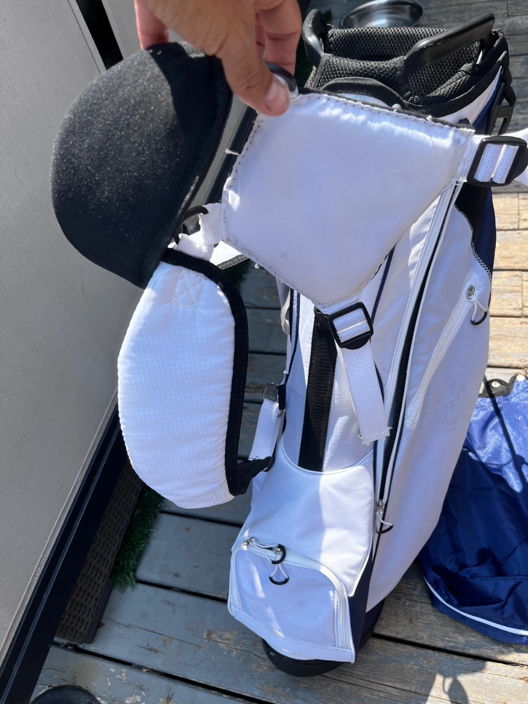 A golf bag in white, black, and navy blue. Includes a stand and clubs cover. Featuring a few exterior pockets and a detachable shoulder strap. A great way to enjoy a relaxing day on the green. Pick up only. Closest intersection is Jane St and Eglinton Ave