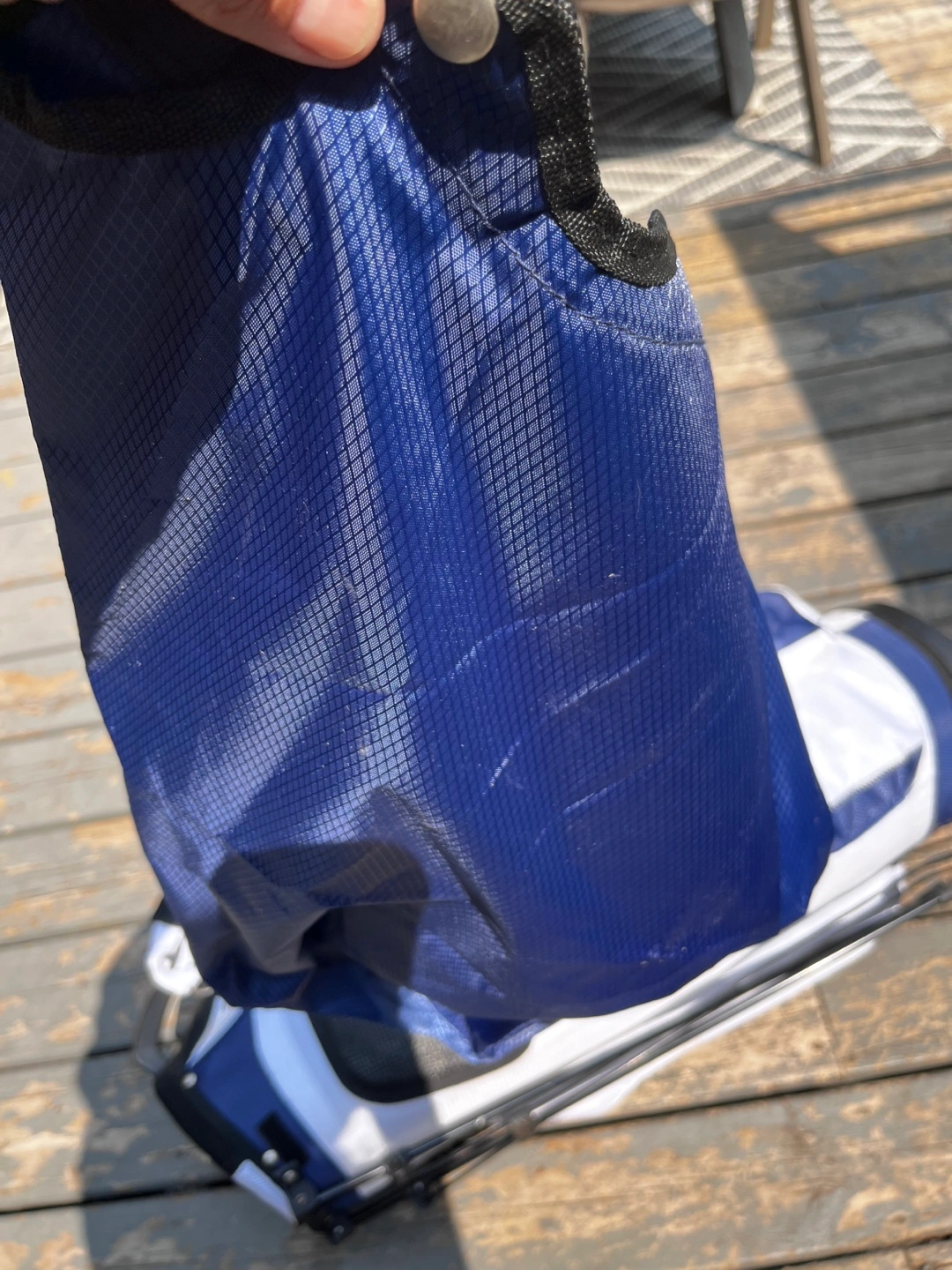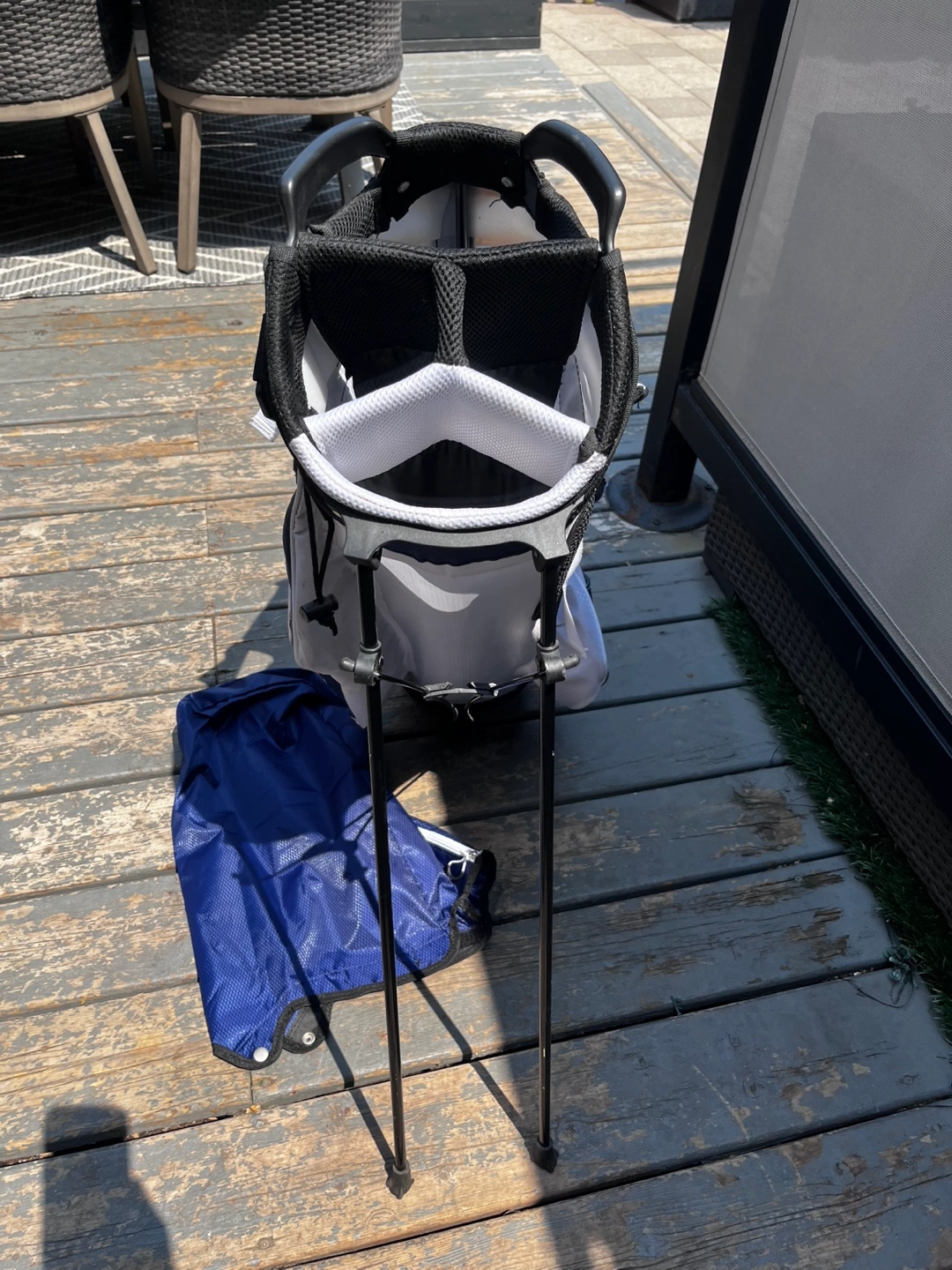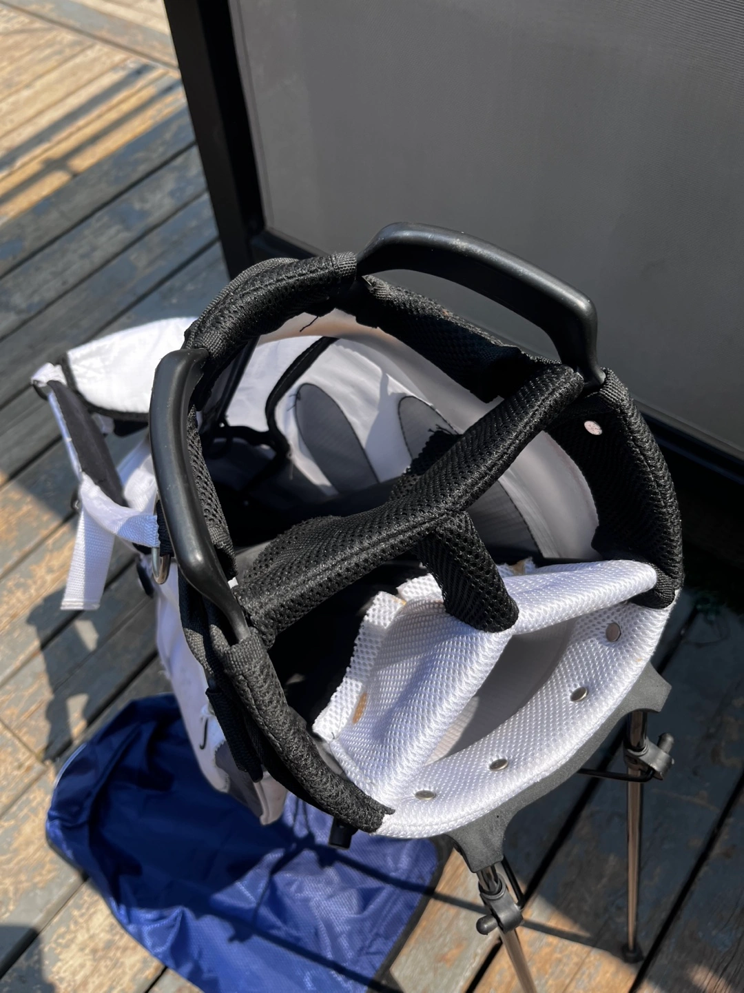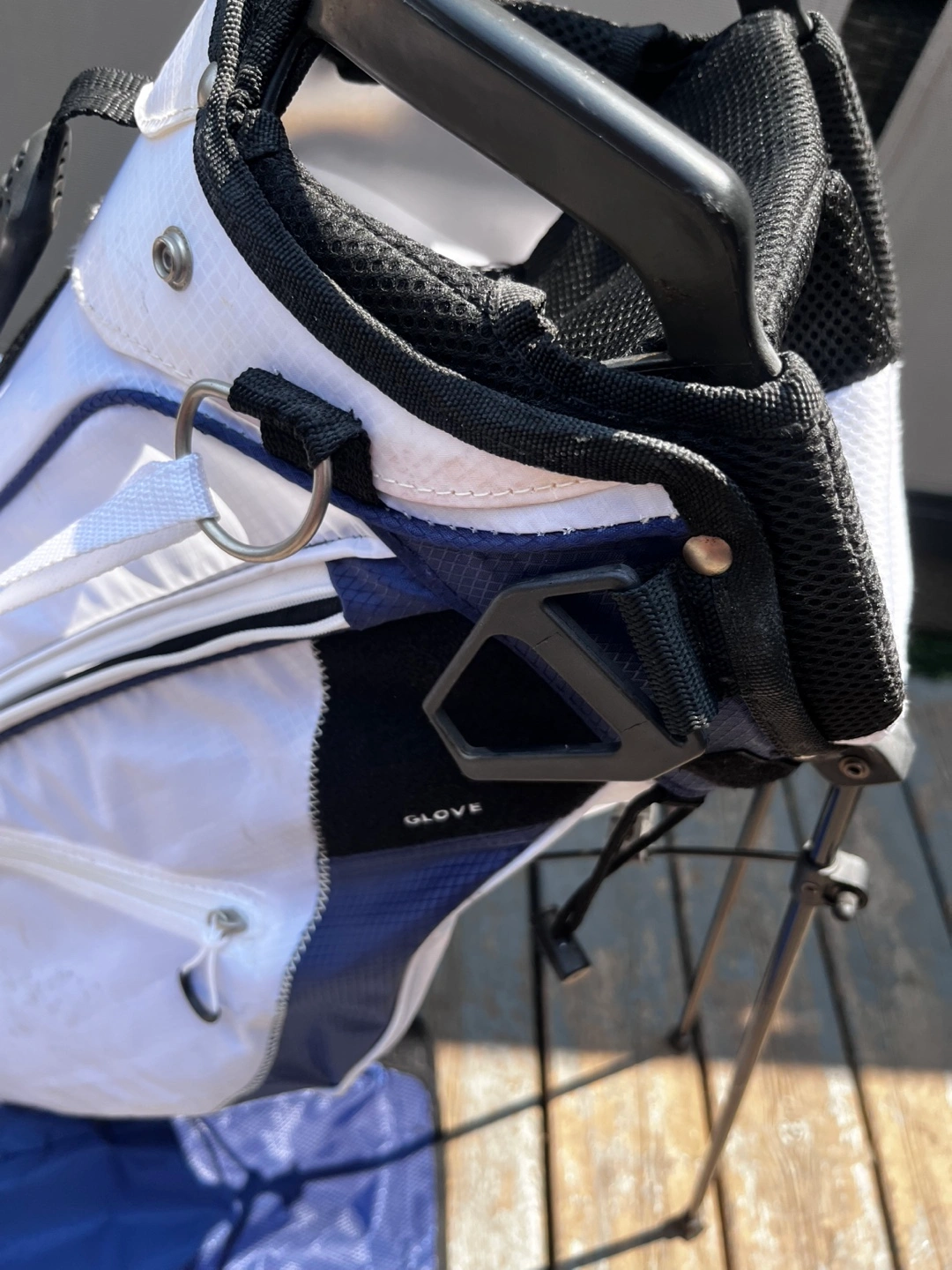 A golf bag in white, black, and navy blue. Includes a stand and clubs cover. Featuring a few exterior pockets and a detachable shoulder strap. A great way to enjoy a relaxing day on the green. Pick up only. Closest intersection is Jane St and Eglinton Ave