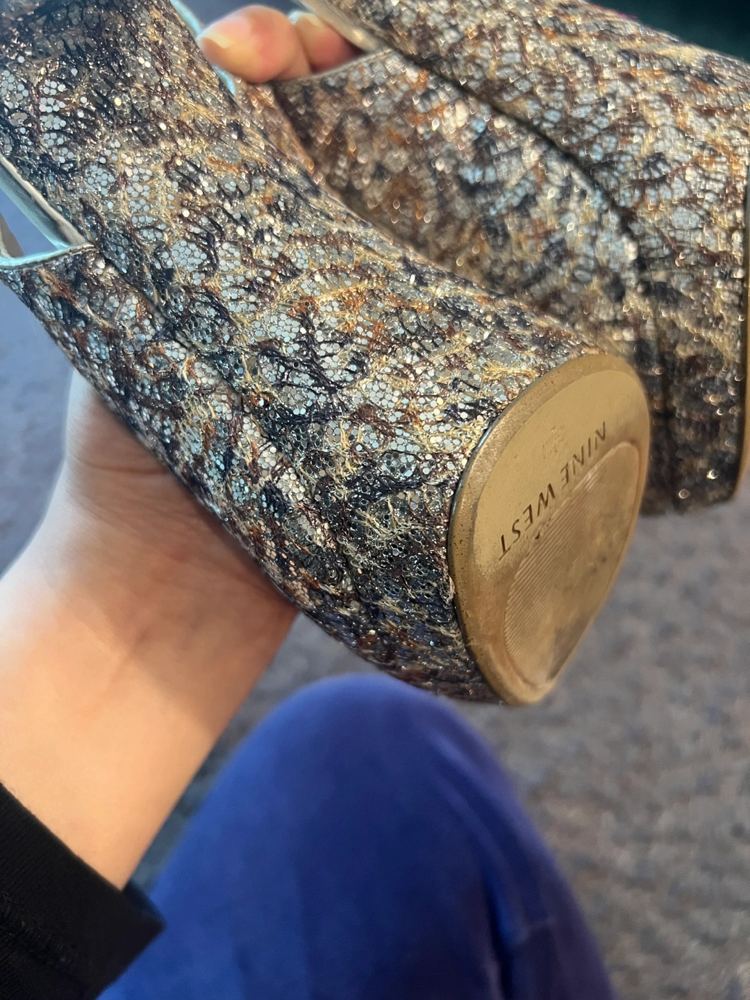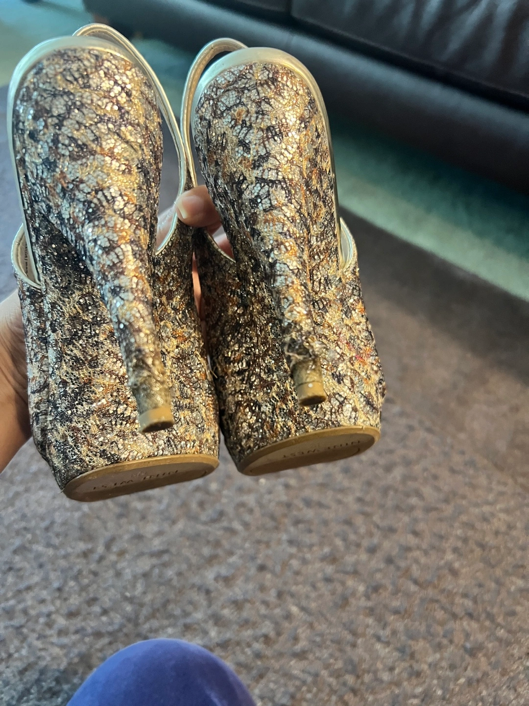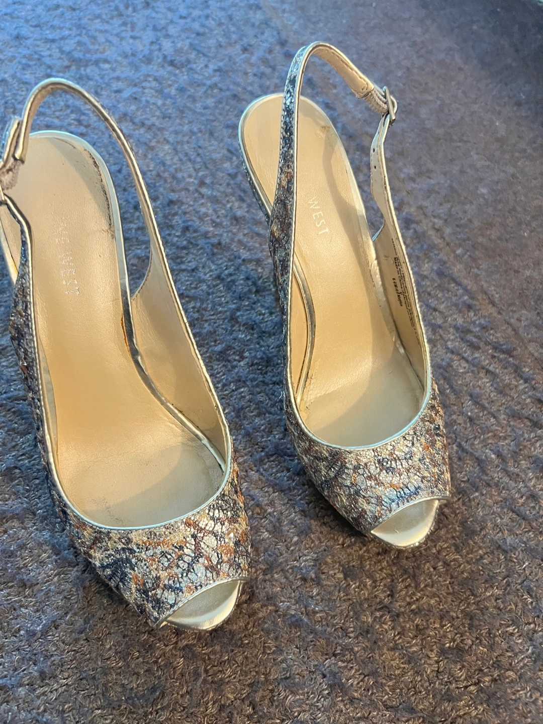 These heels feature a sparkling pattern. They have a slingback style with a buckle closure. The heels are high. You could wear these out to a party. I wore it to about door event and the heels cap has a bit of damage. Other great condition from the front. They are comfy Cash only