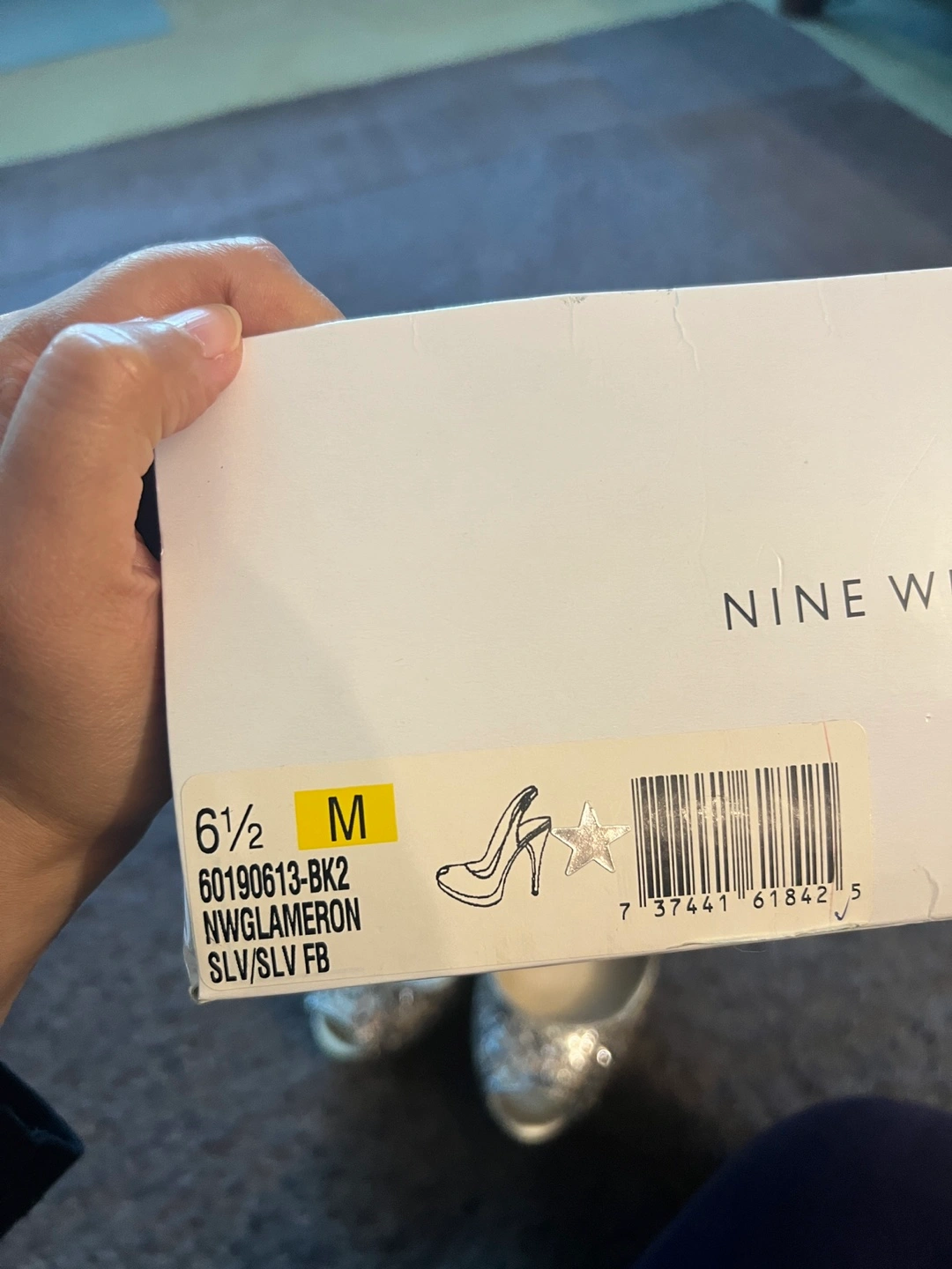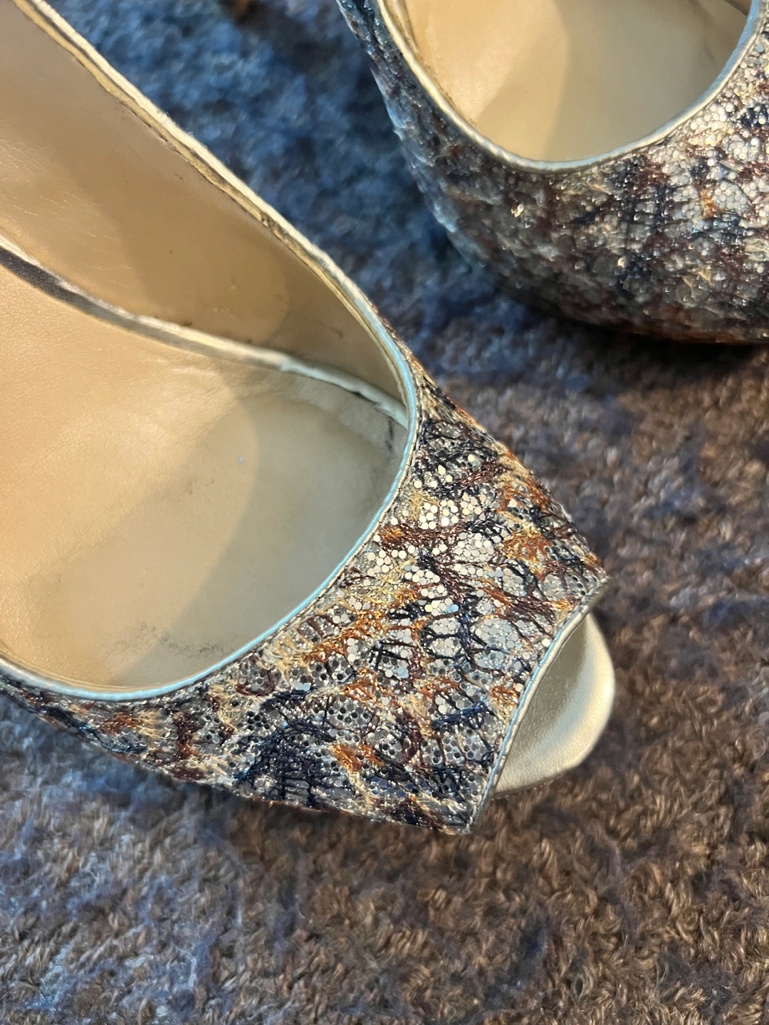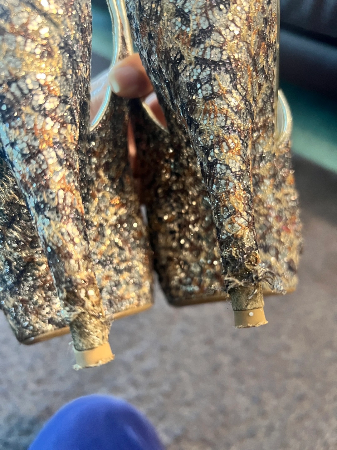 These heels feature a sparkling pattern. They have a slingback style with a buckle closure. The heels are high. You could wear these out to a party. I wore it to about door event and the heels cap has a bit of damage. Other great condition from the front. They are comfy Cash only