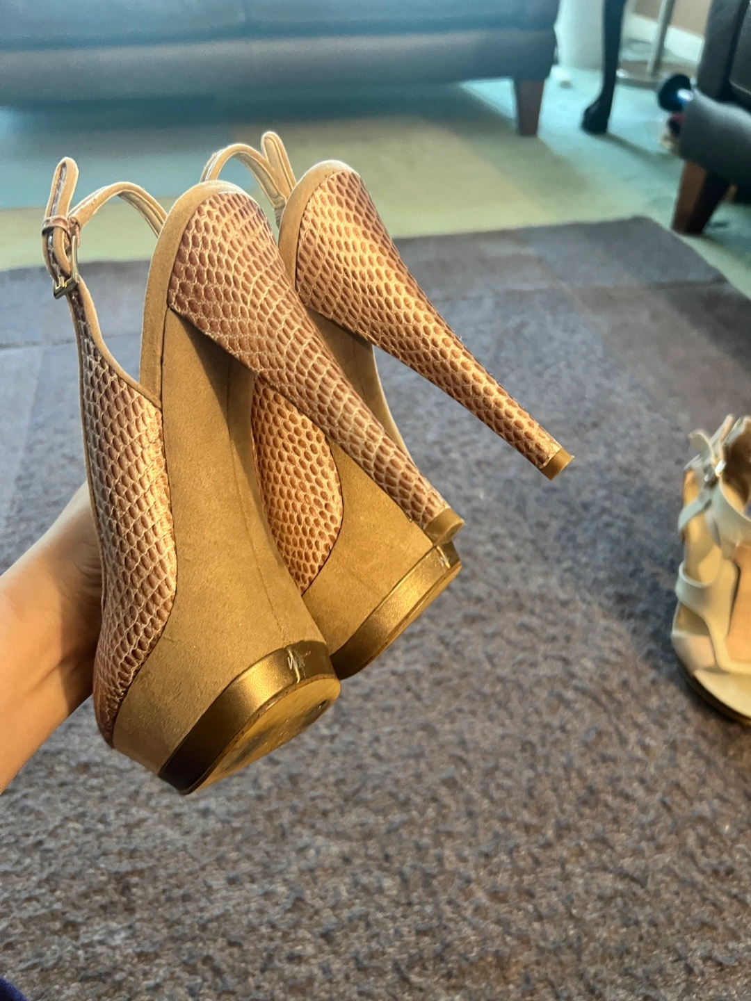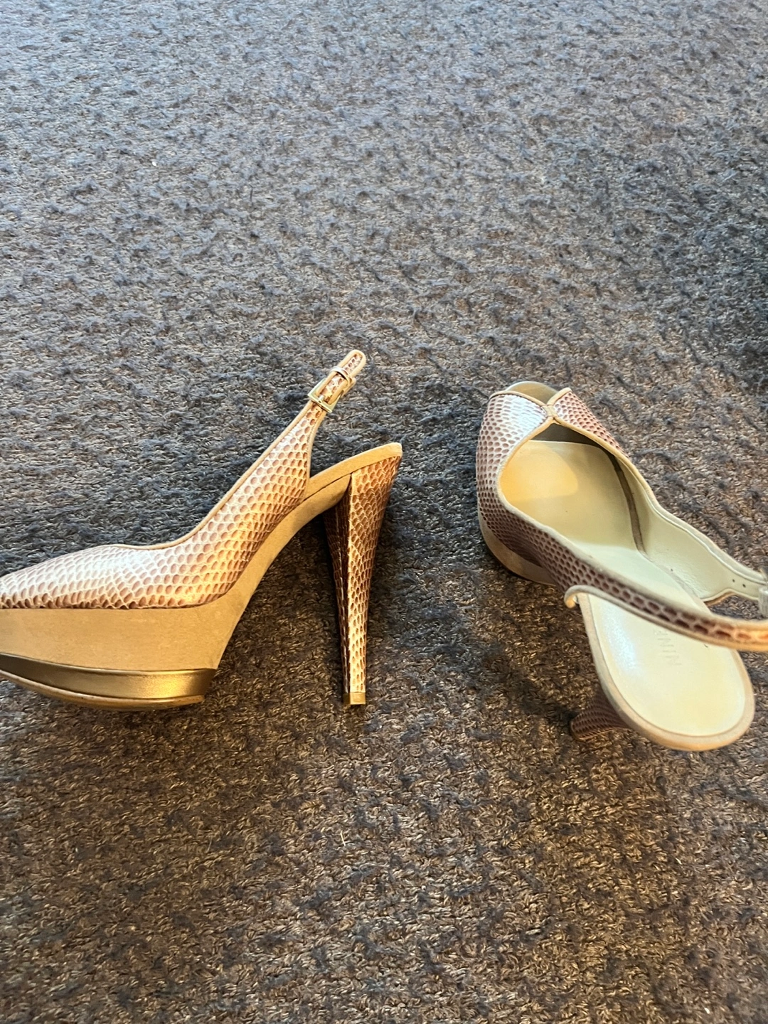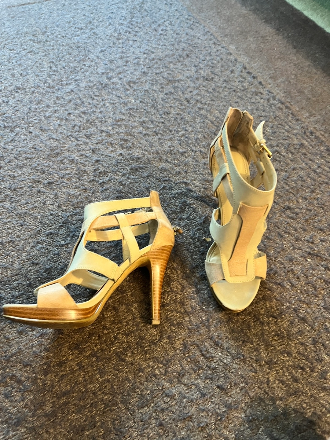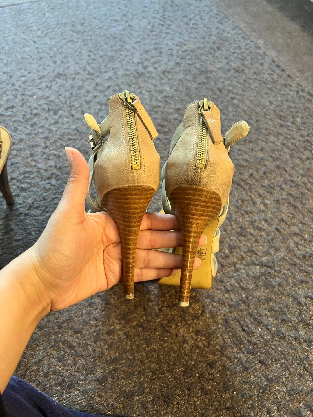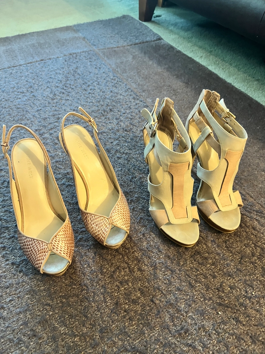 I am selling this assortment of Nine West heels. The heels are a neutral tone. There is a strappy pair and a pair with a snake skin pattern. Slipping these heels on will bring you joy. Cash only $15 for each pair