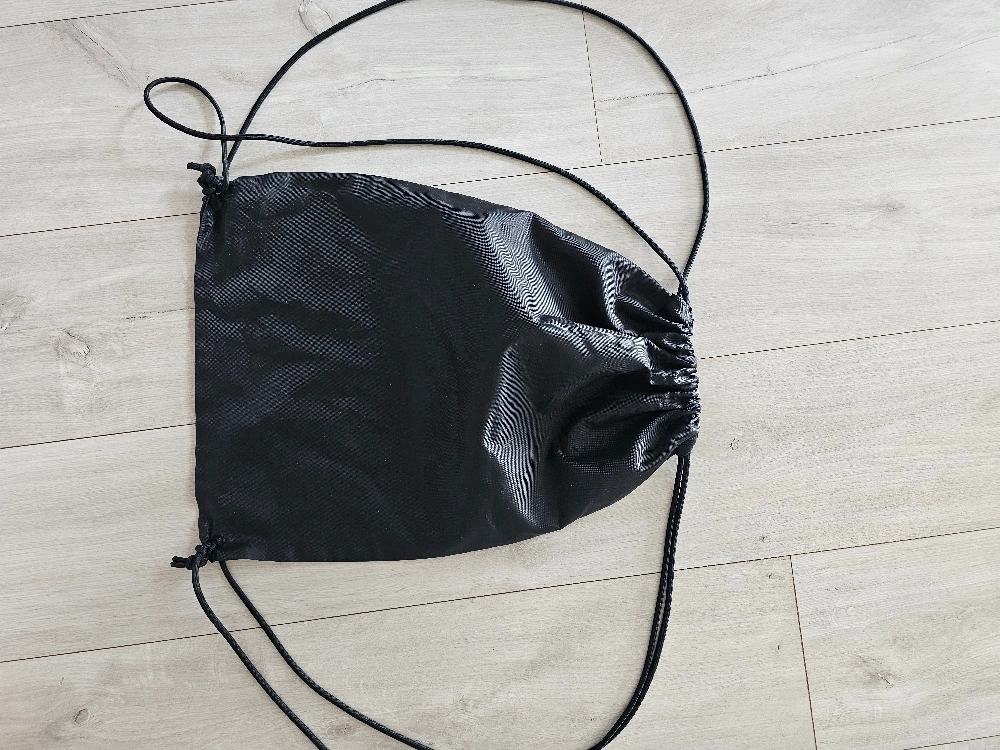 The black drawstring bag is great for storing smaller items. The bag is a simple style, with a drawstring closure. The brand's name appears in the center. Taking this bag with you on your next adventure may bring a sense of peace and security.