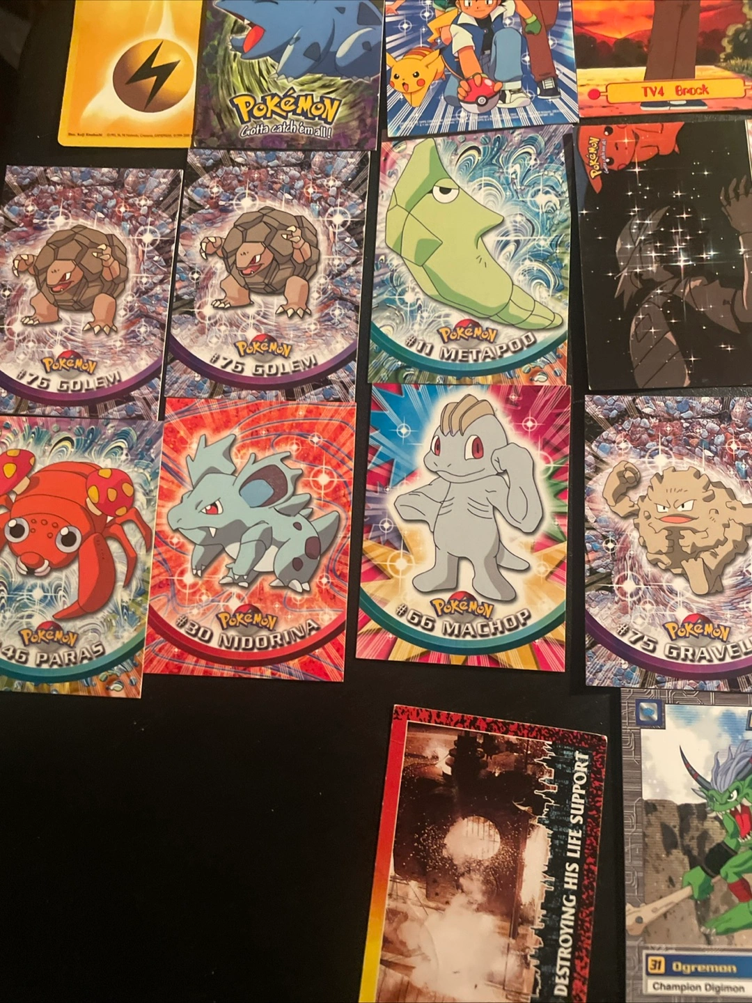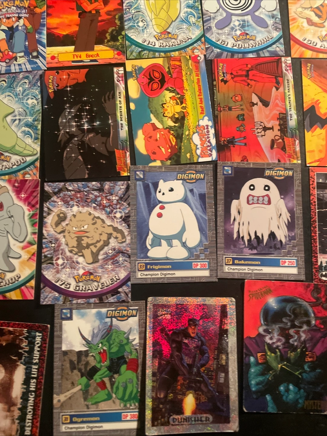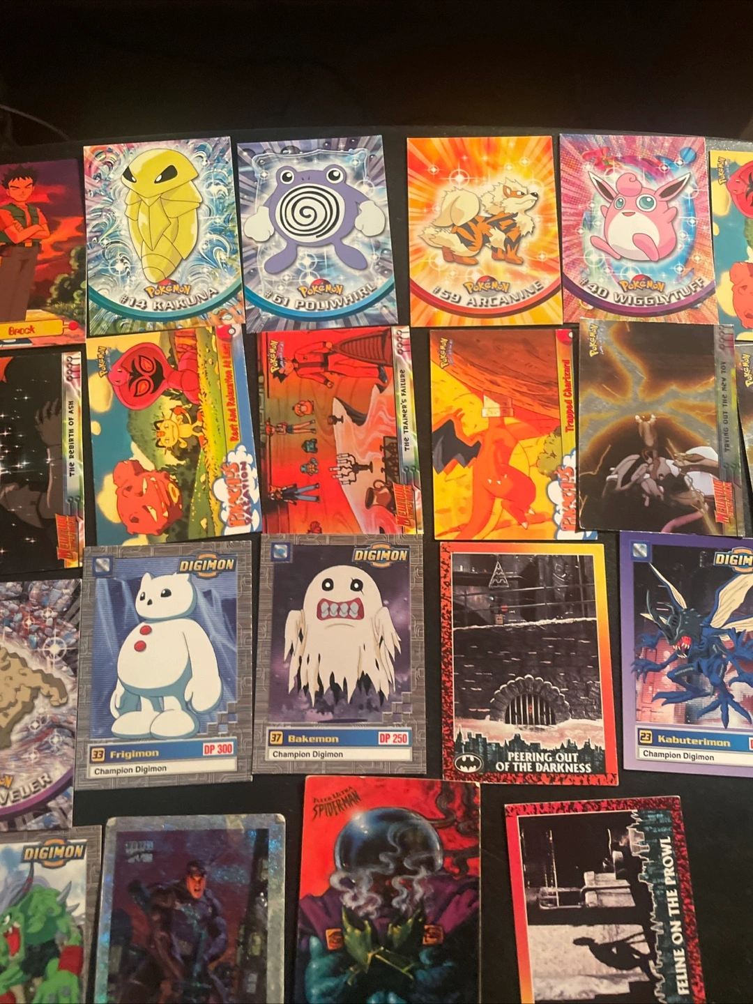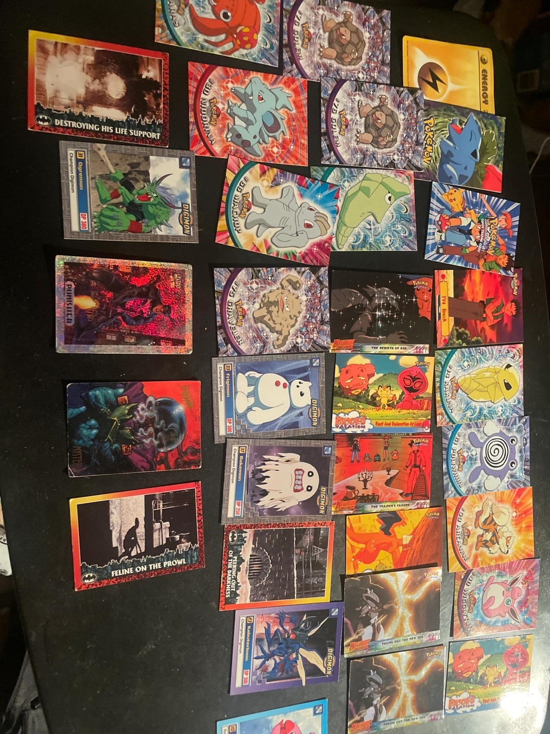 A variety of collectible cards. Featuring characters from different cartoons, comics, and television shows. Different sizes and styles. Looking at these cards can bring you a sense of peace and nostalgia. TOPPS brand for pokemon about 40 cards