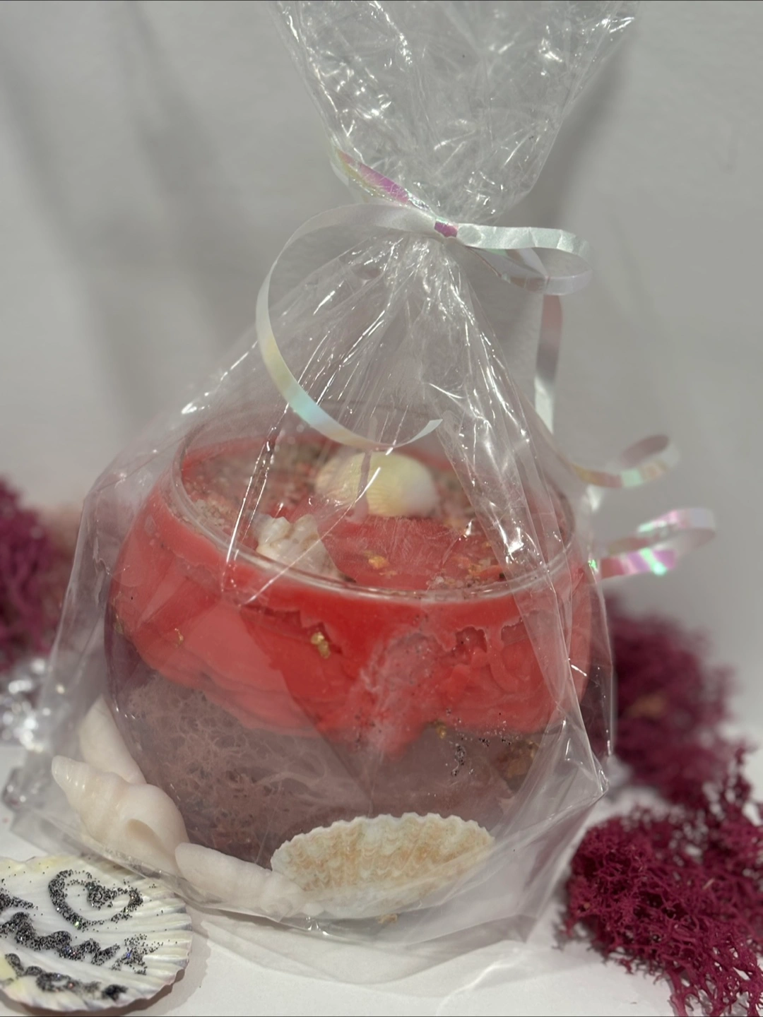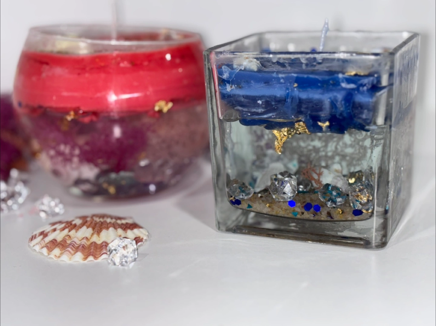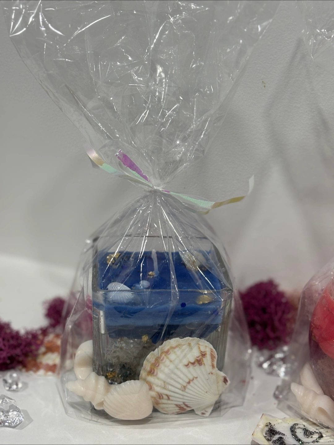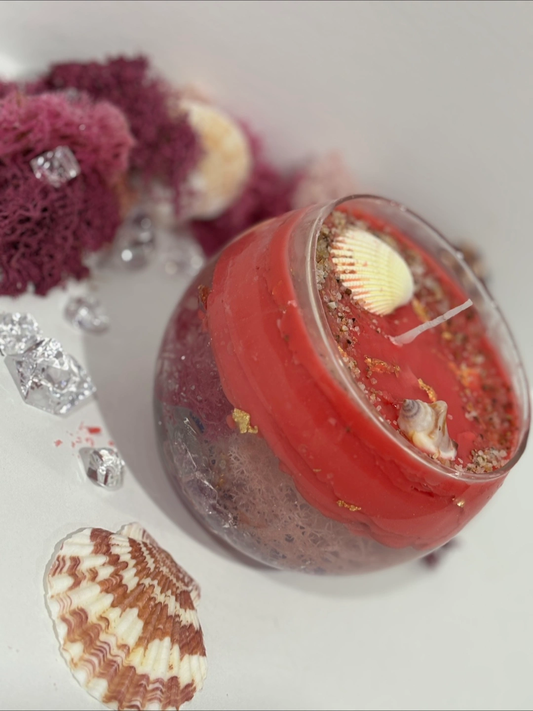 Handmade candles with a sea theme. Decorated with shells, sand and glitter. Available in a variety of colours. These candles would be great to light during a soothing bath.