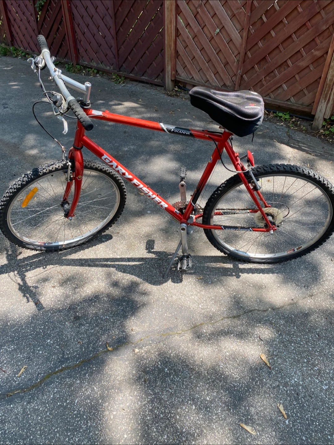 VINTAGE GARY FISHER ALUMINUM FRAME 26” red mountain bike piranha ,feature a Shimano gear selector. in good condition