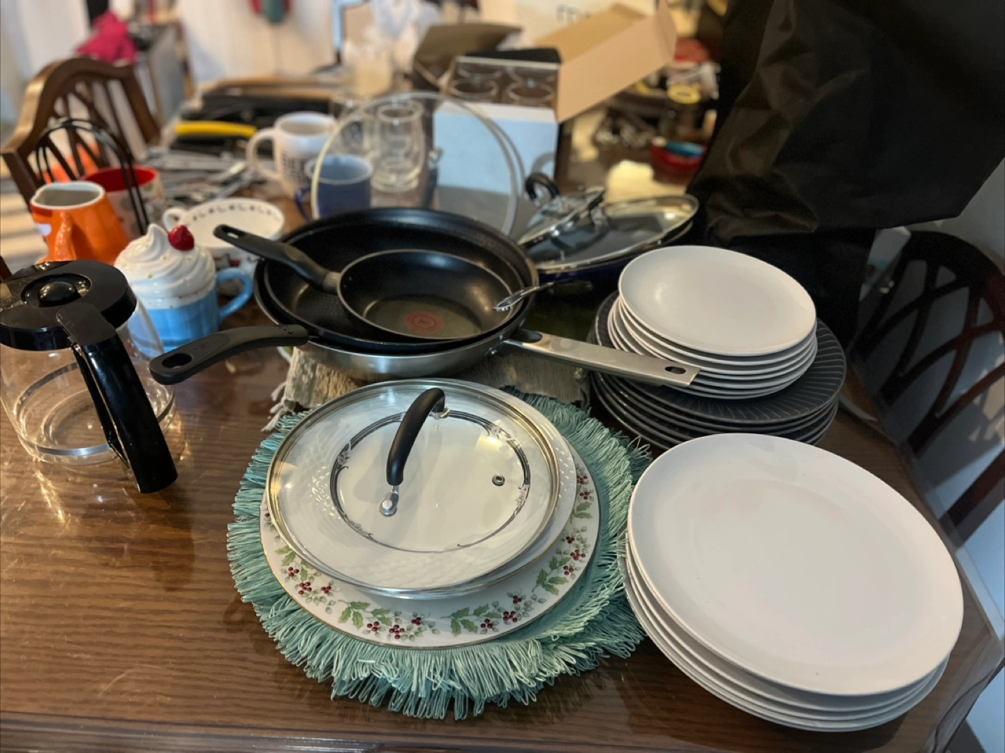 A collection of kitchen essentials. Several plates and a coffee maker with the glass carafe are included. A couple of non-stick pans with a lid are also offered. These items will easily allow you to cook and serve any meal you wish.
