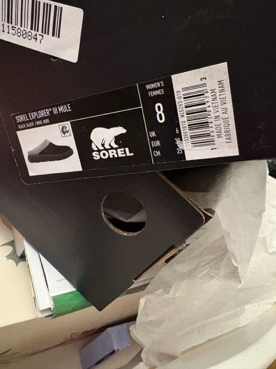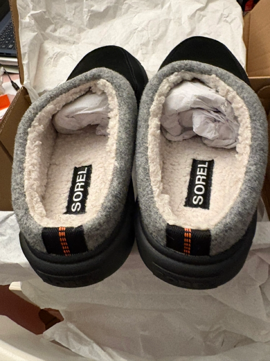 Comfortable slippers. Black exterior. Grey accents. Soft interior. Comes with box and tissue. They are perfect for lounging around the house after a long day.