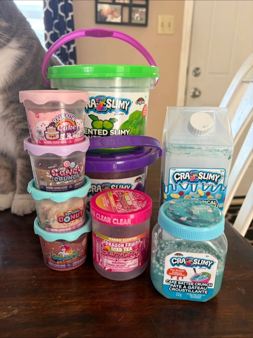 A collection of colourful slime containers in various sizes. Included are containers of scented slime, and slime with different textures. A perfect activity to have for a fun time.