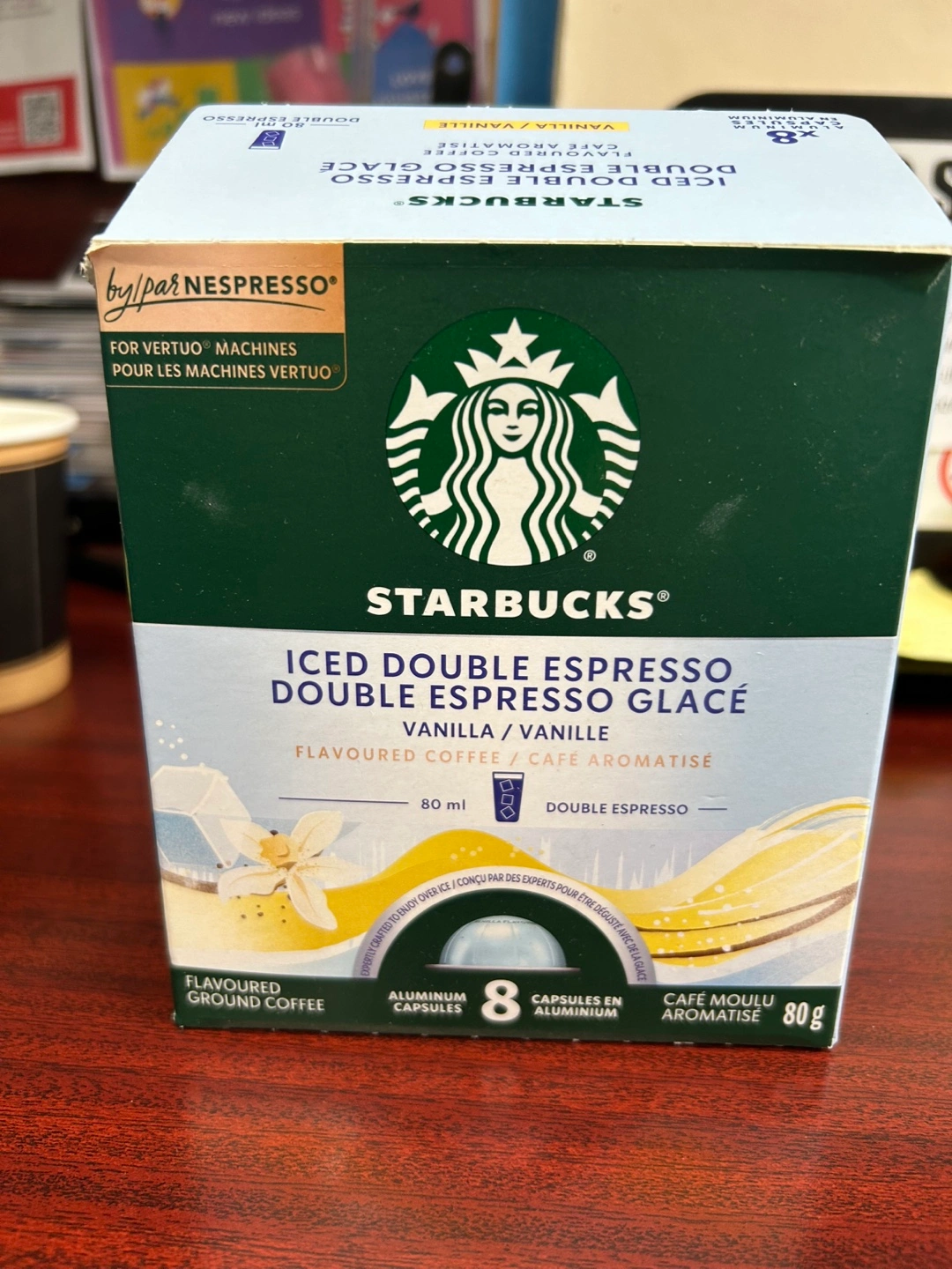 Box of Starbucks Iced Double Espresso capsules. Vanilla flavour. It is the perfect treat to unwind with after a long day.