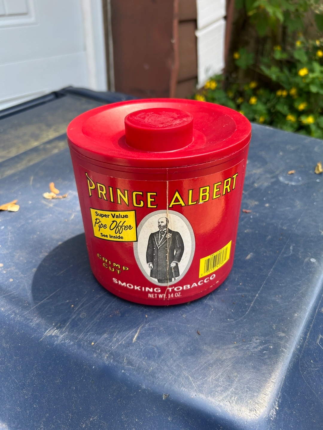 A red plastic “prince albert” tobacco canister with a removable lid. Tobacciana, cigarette collectibles, advertising.