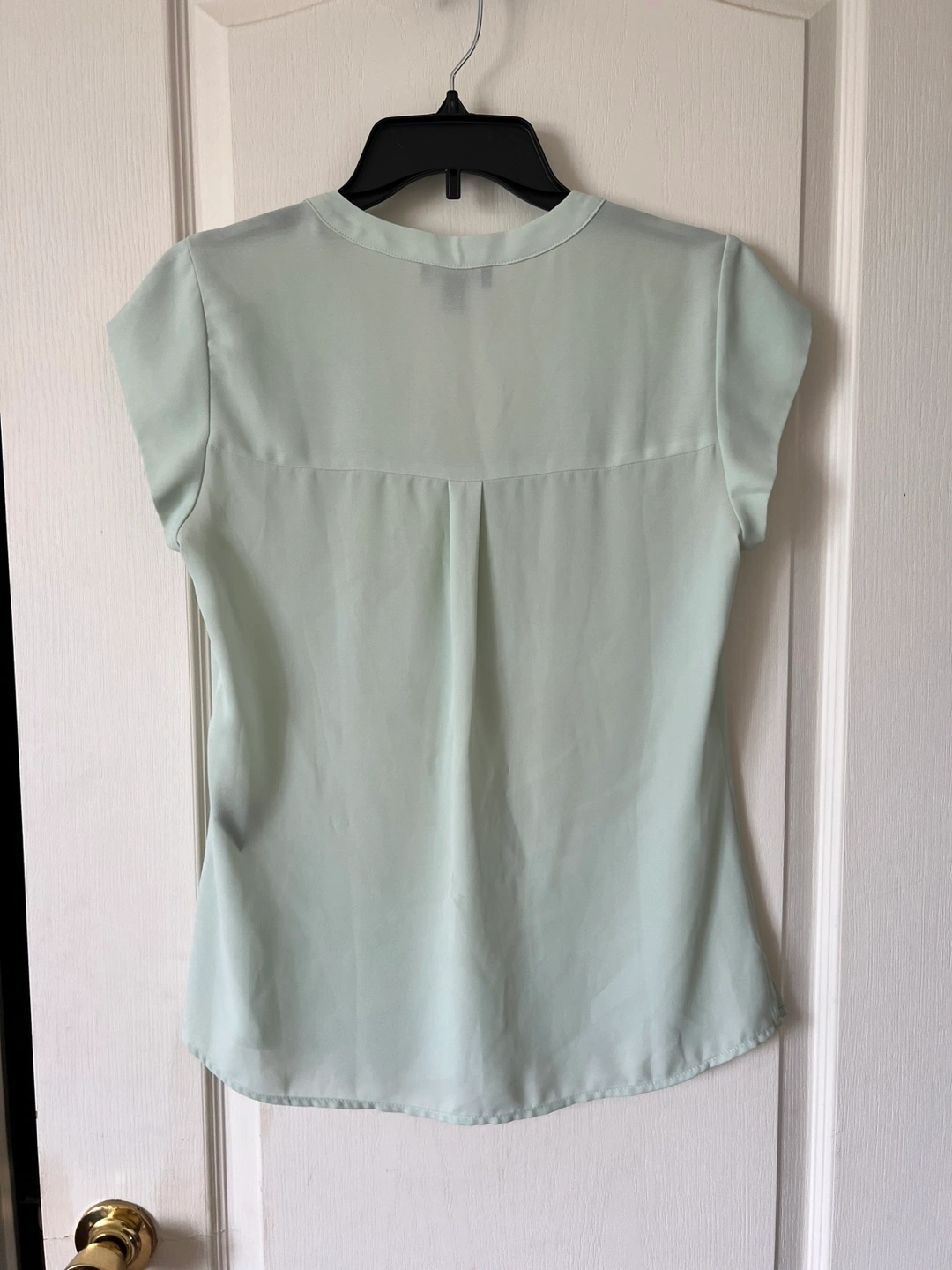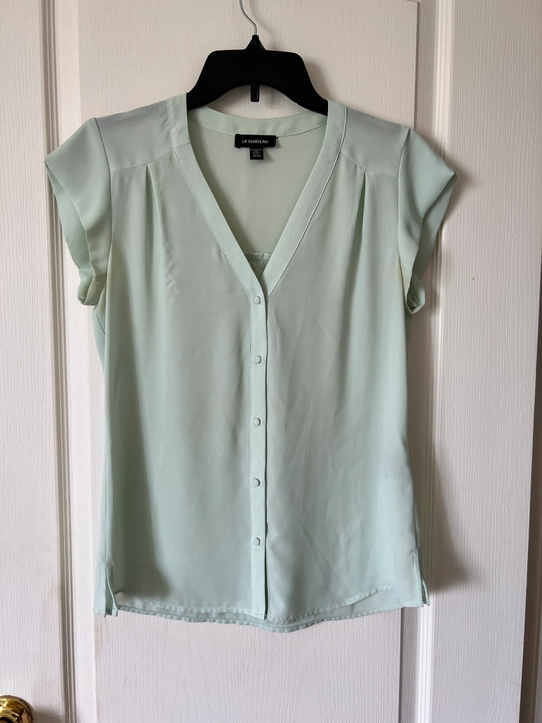 A mint-green button-up blouse. Short sleeves and a V-neck.