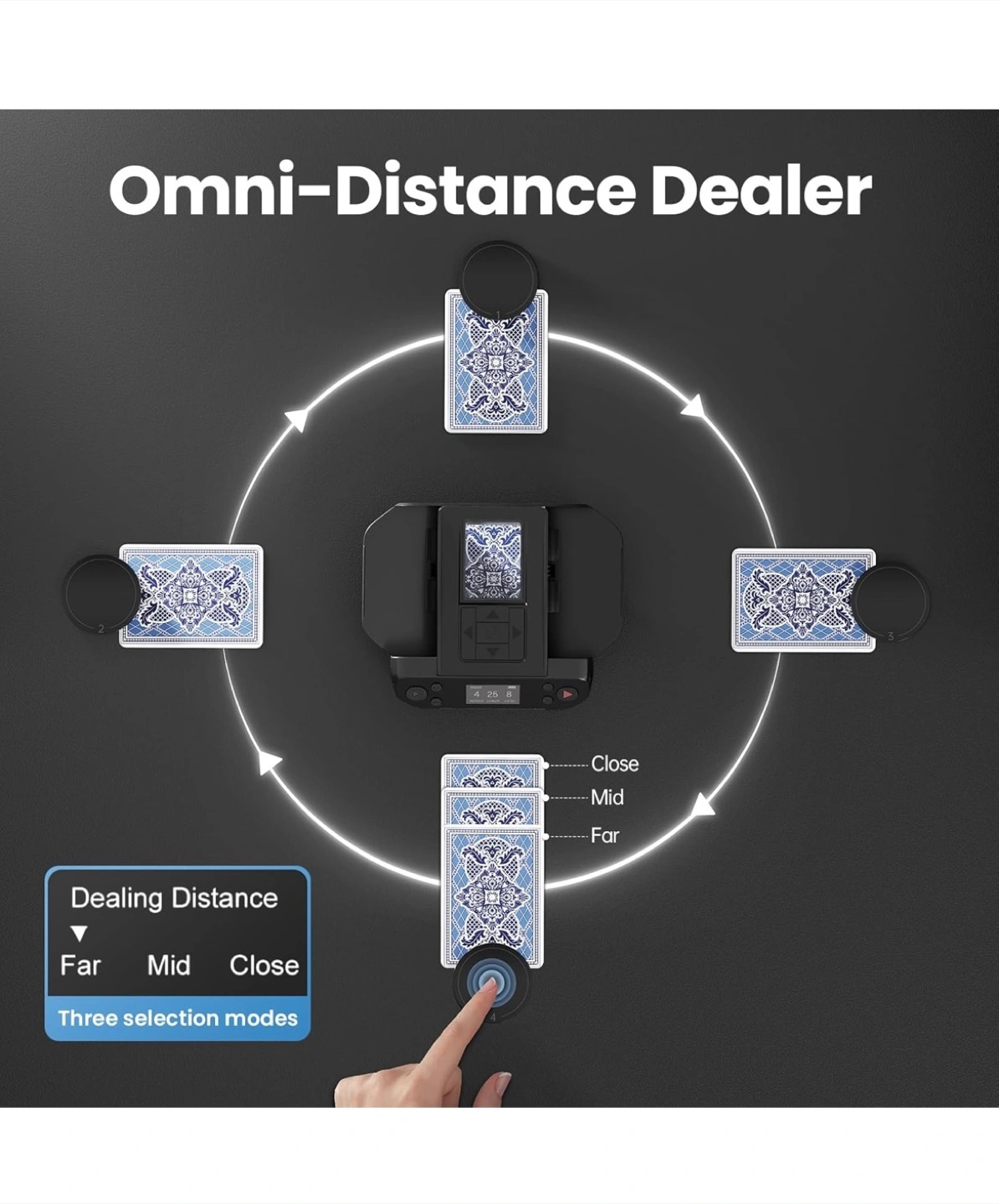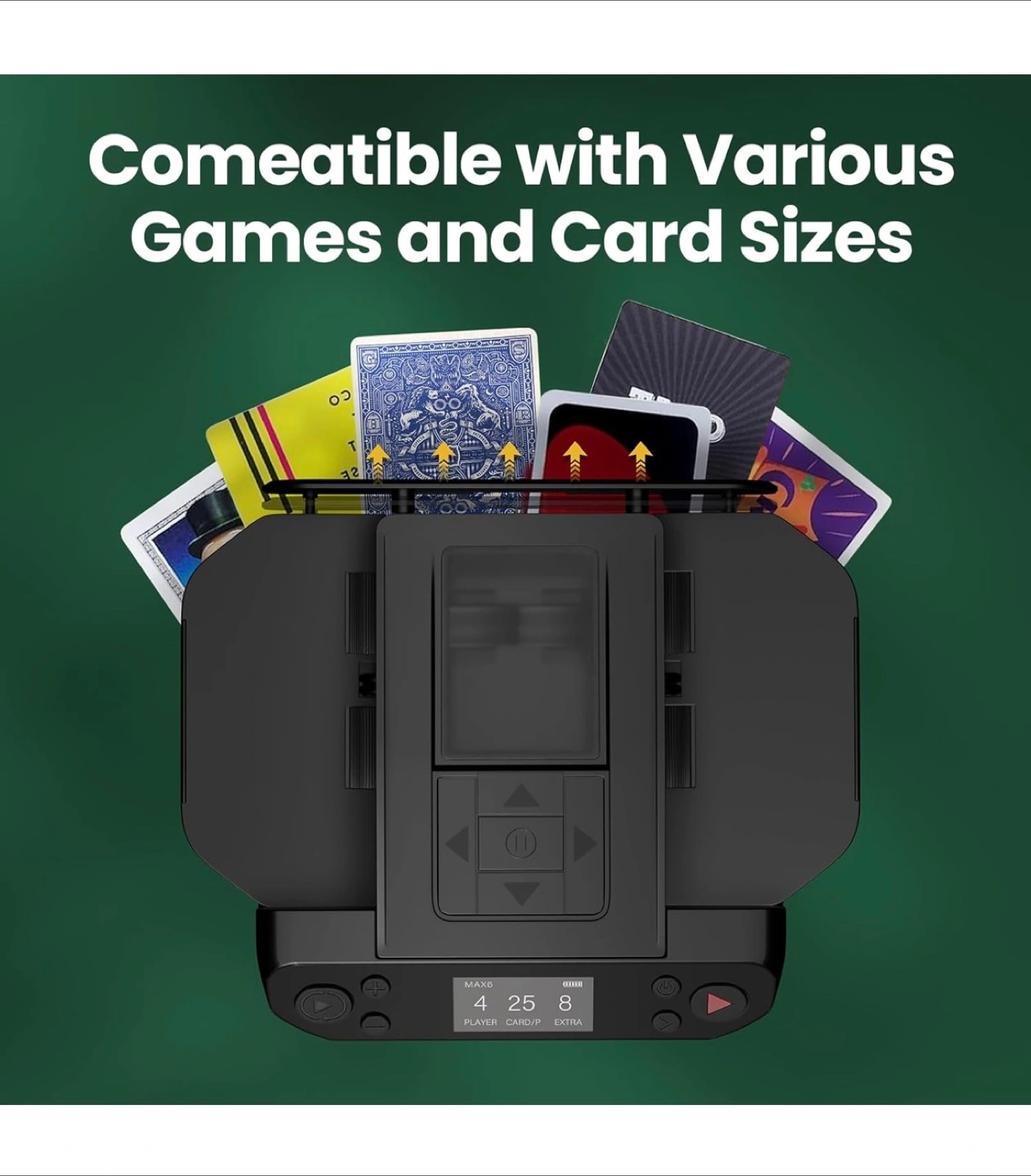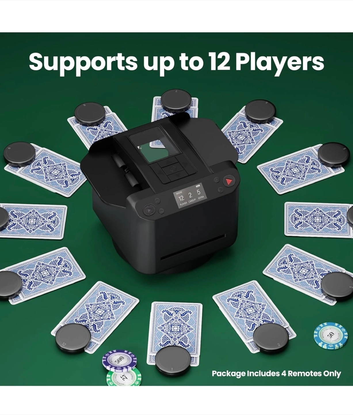 A card shuffler and dealer machine. Features a digital screen and buttons. Designed for multiple players. Comes with remotes. You can use this machine to make your card games more enjoyable and smooth.