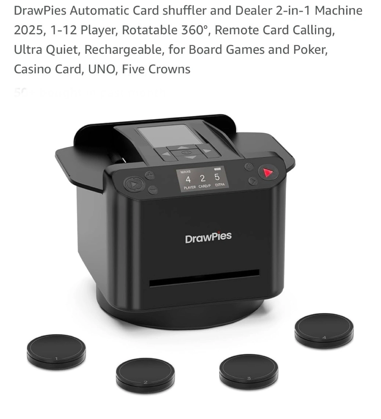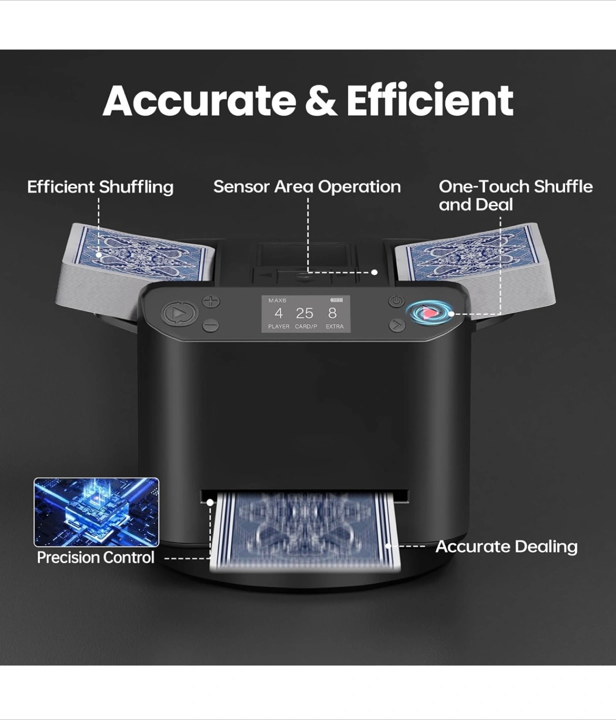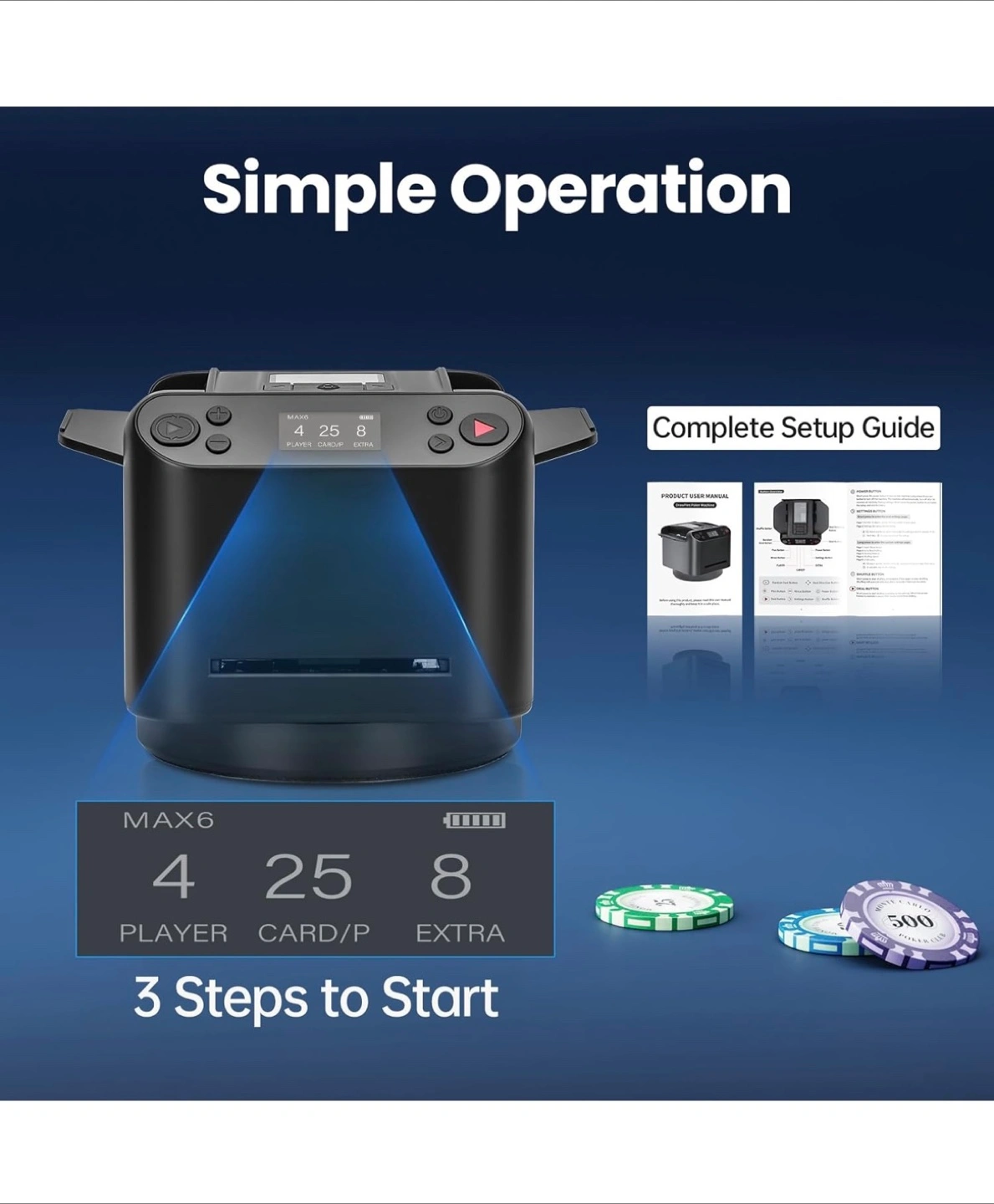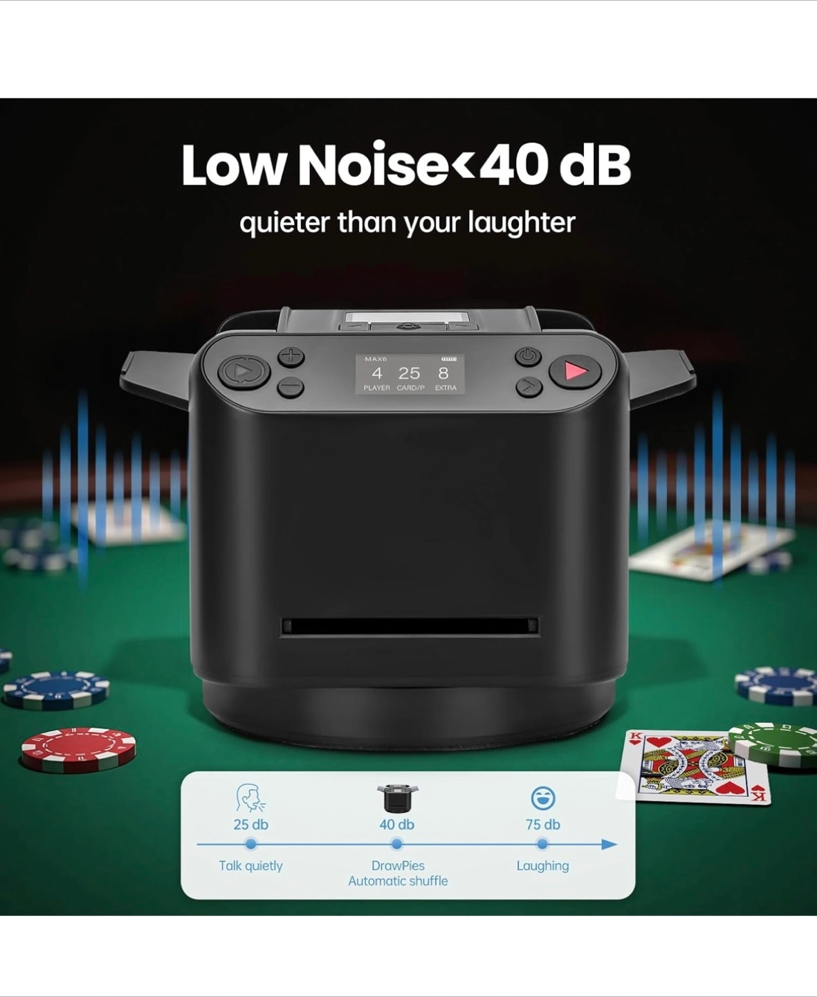 A card shuffler and dealer machine. Features a digital screen and buttons. Designed for multiple players. Comes with remotes. You can use this machine to make your card games more enjoyable and smooth.