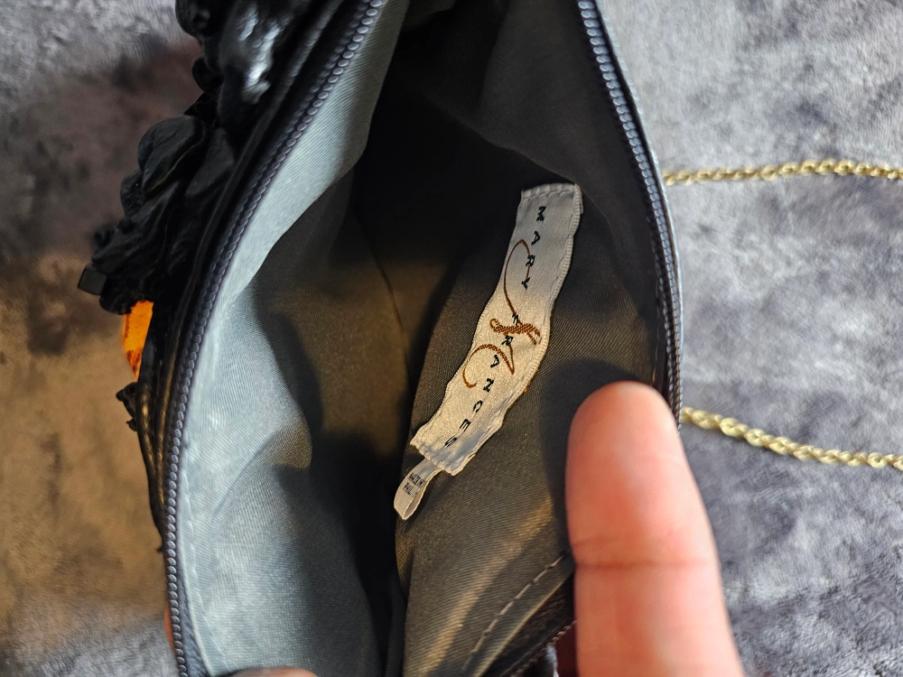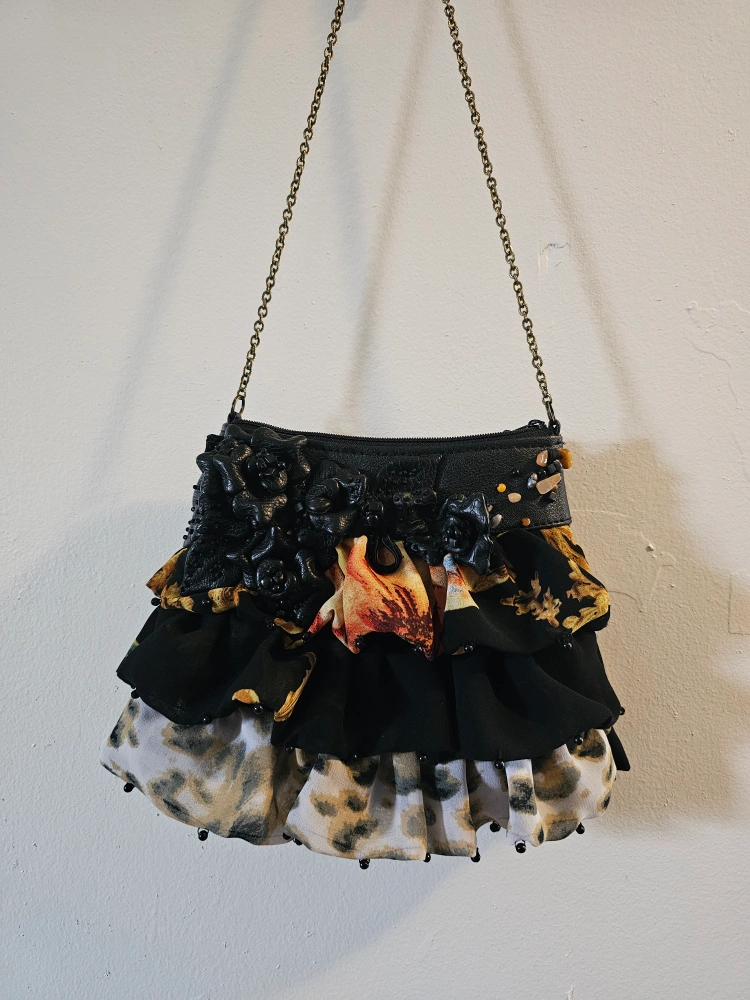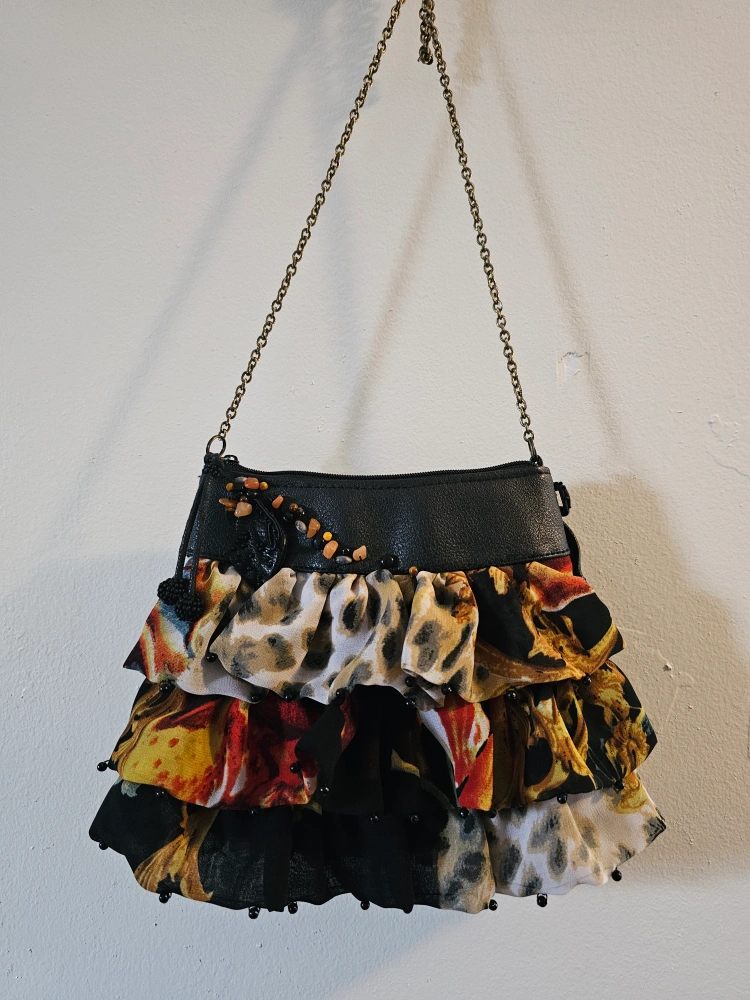 Beautiful handbag with a chain strap. Ruffled design with various patterns and textures. Featuring a zipper closure. This purse is perfect for a night out or a special occasion, it is sure to hold all your essentials.