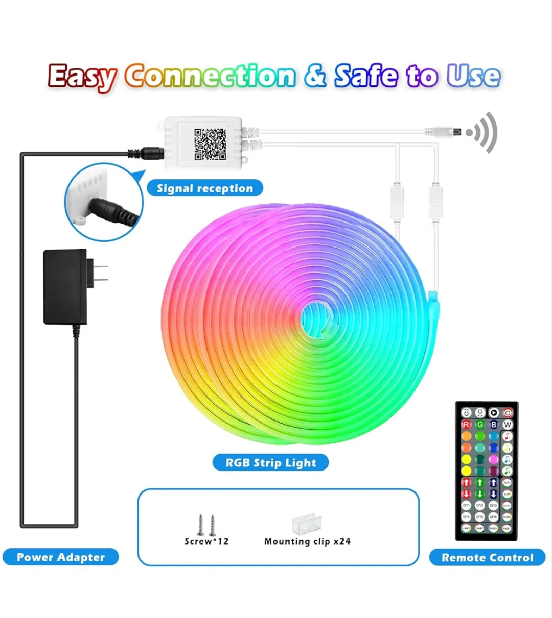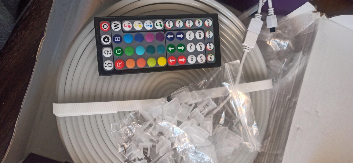 Selling a brand new set of LED neon rope lights still in the box! Comes with a remote control and all the necessary components for easy setup. Perfect for adding a fun and colourful touch to any room