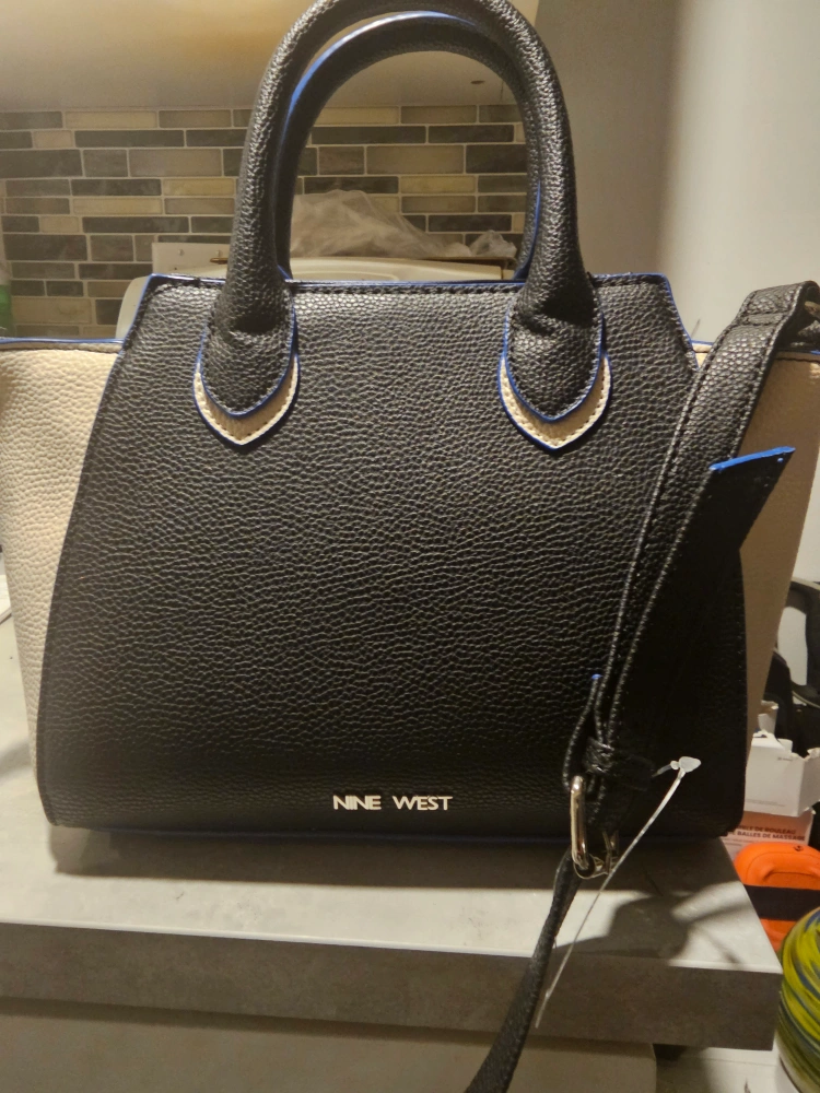 This is a Nine West handbag in black and cream. It has a blue accent. It also comes with a shoulder strap.