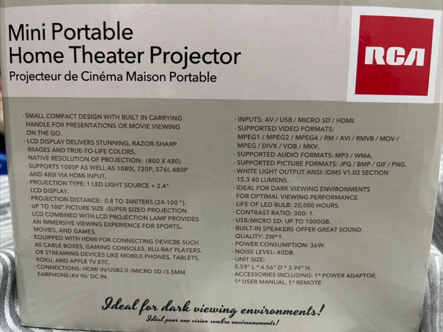 Selling an RCA mini portable home theatre projector! It's perfect for creating a cozy viewing experience at home. It supports up to 1080p resolution and has a projection size of 24-100 inches. The unit size is 5.59" L x 4.56" D x 3.94" H. Included are the power adapter, user manual, and remote.