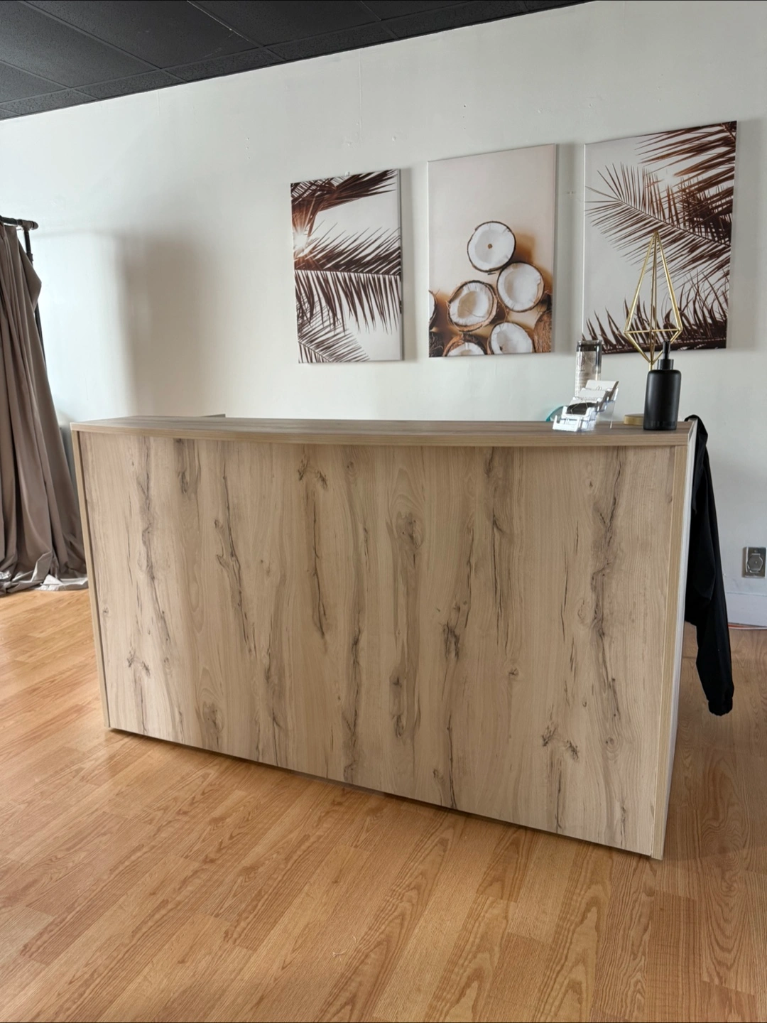 Selling a wooden counter/reception desk in good condition. It's a great piece for a small business or home office setup. It has a nice wooden texture and design that would fit in many spaces