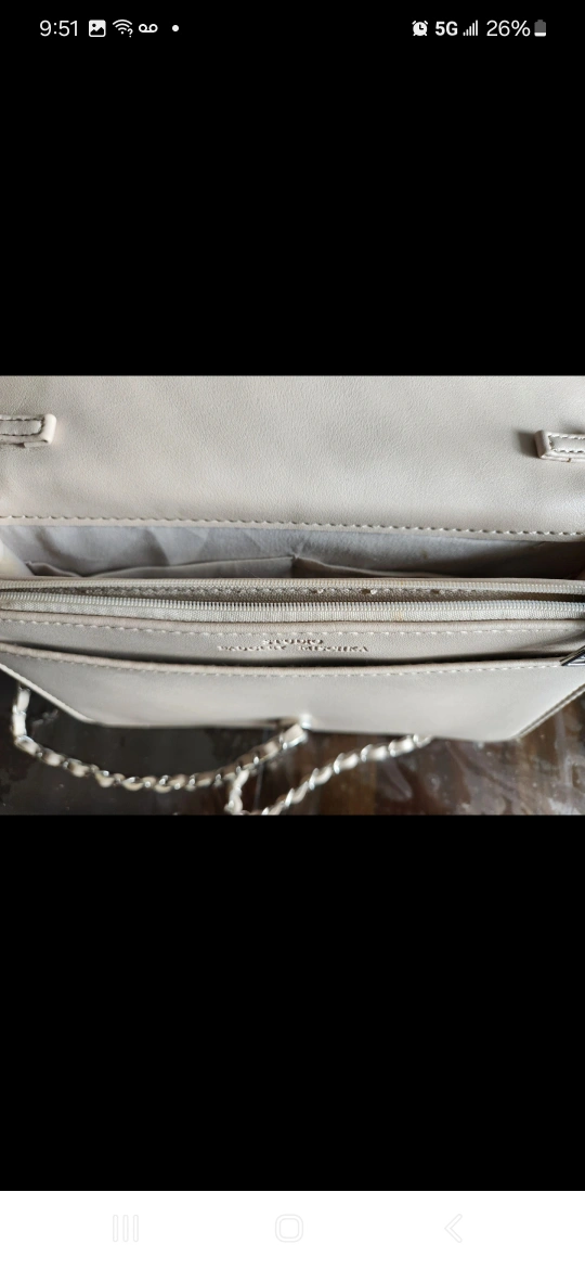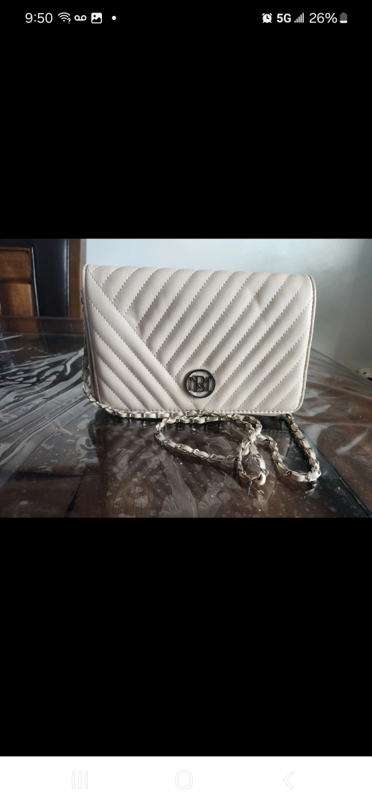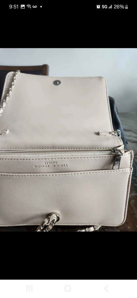 This is a Studio Badgley Mischka shoulder bag in a lovely neutral colour. It has a chain strap and a quilted design on the front. It's in great condition and ready for a new owner!
