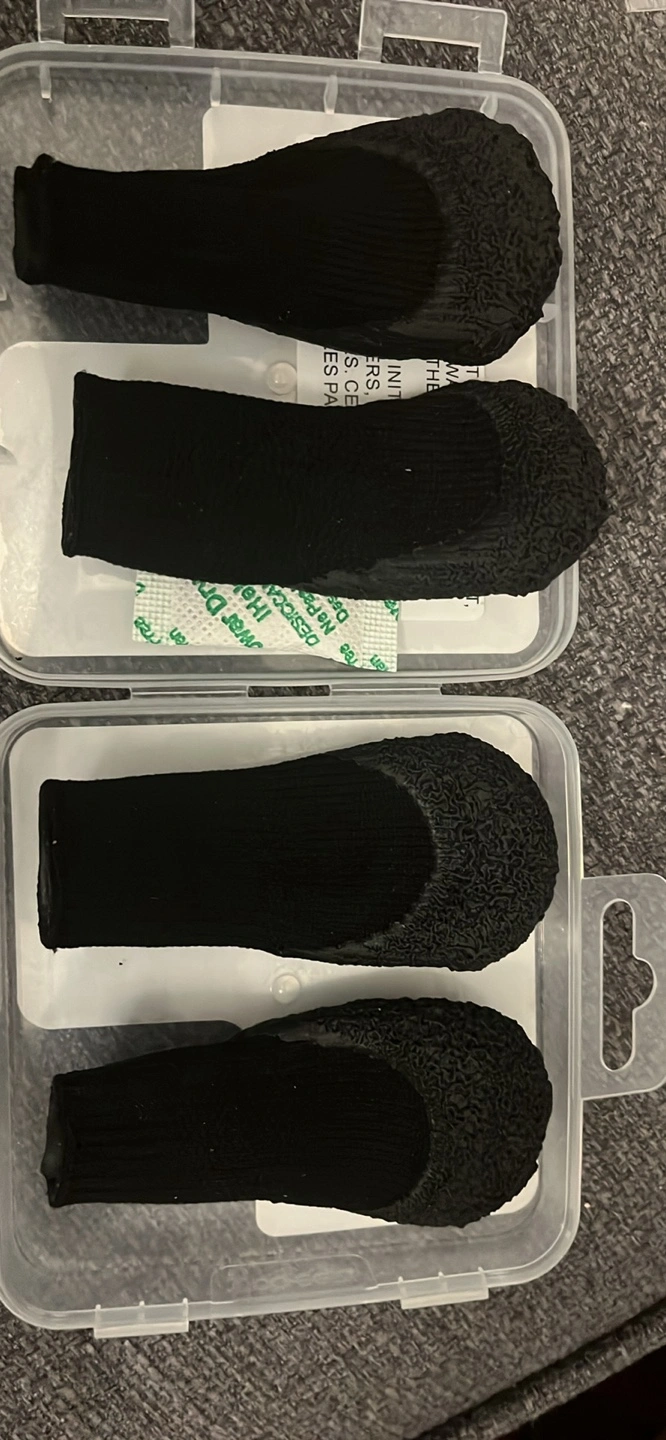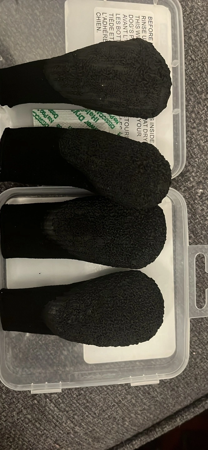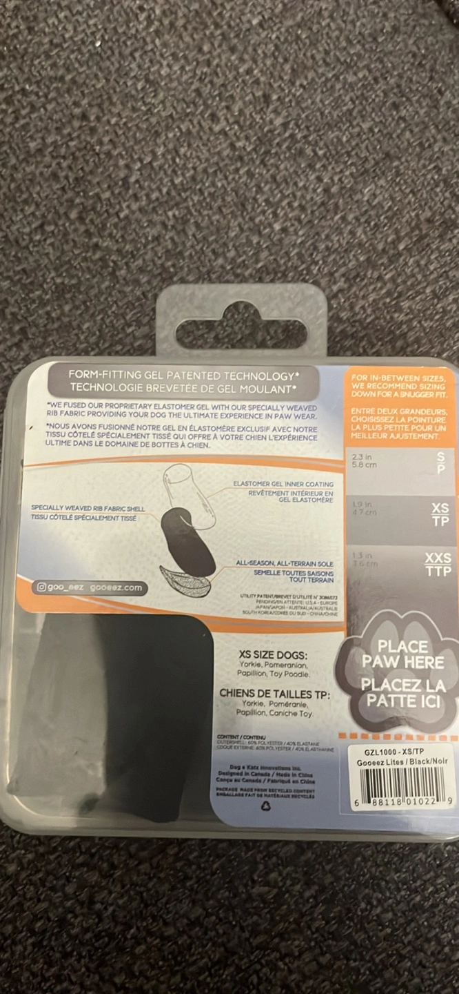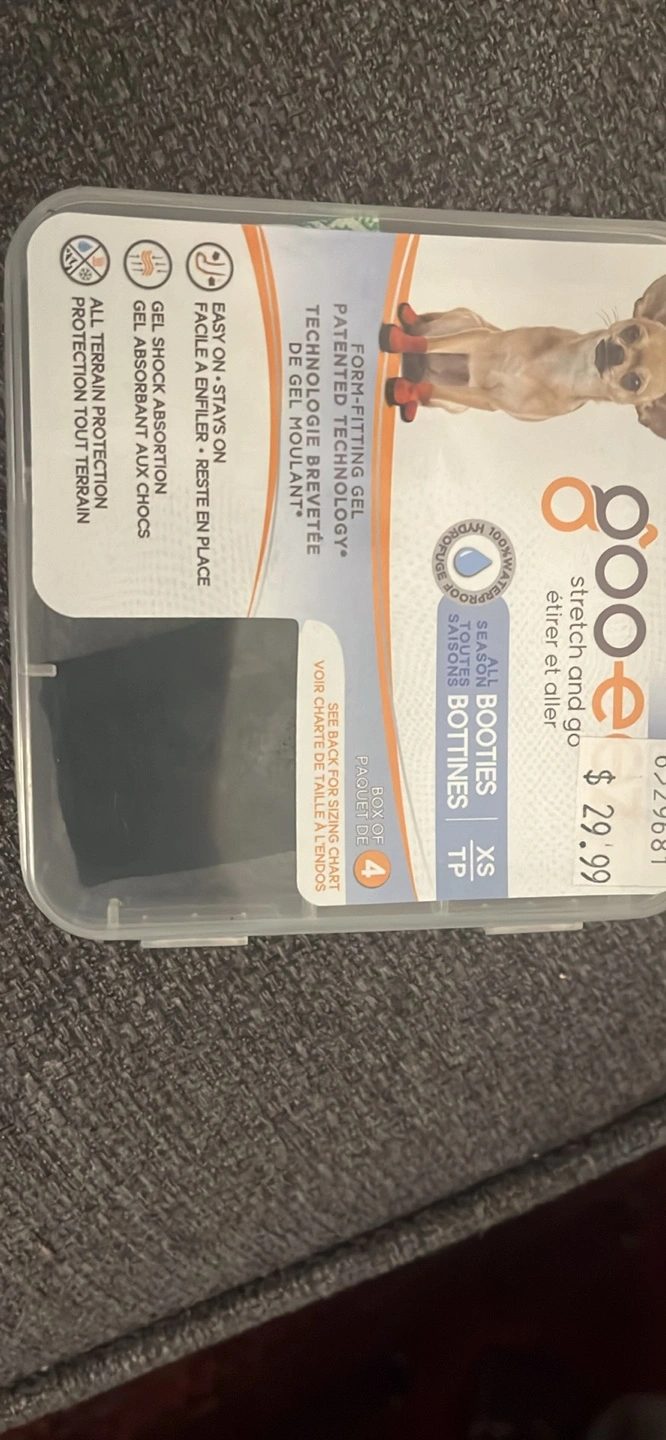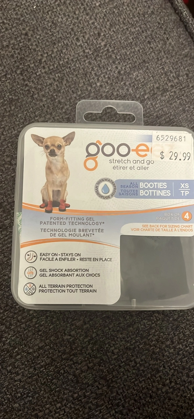 These goo-eez Stretch and Go All Season Booties for dogs are brand new and in their original box! They are size XS and come in black. The box says they're for dogs between 1.5-2.3" / 3.8-5.8cm. They have gel shock absorption and all terrain protection